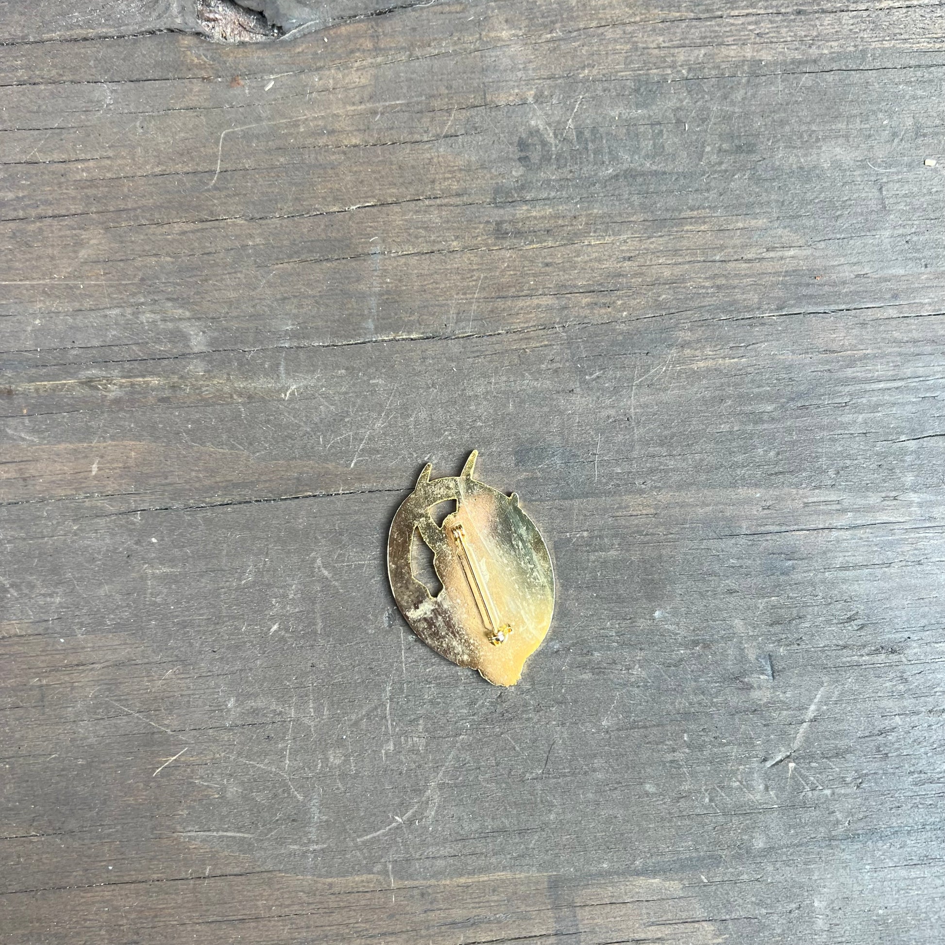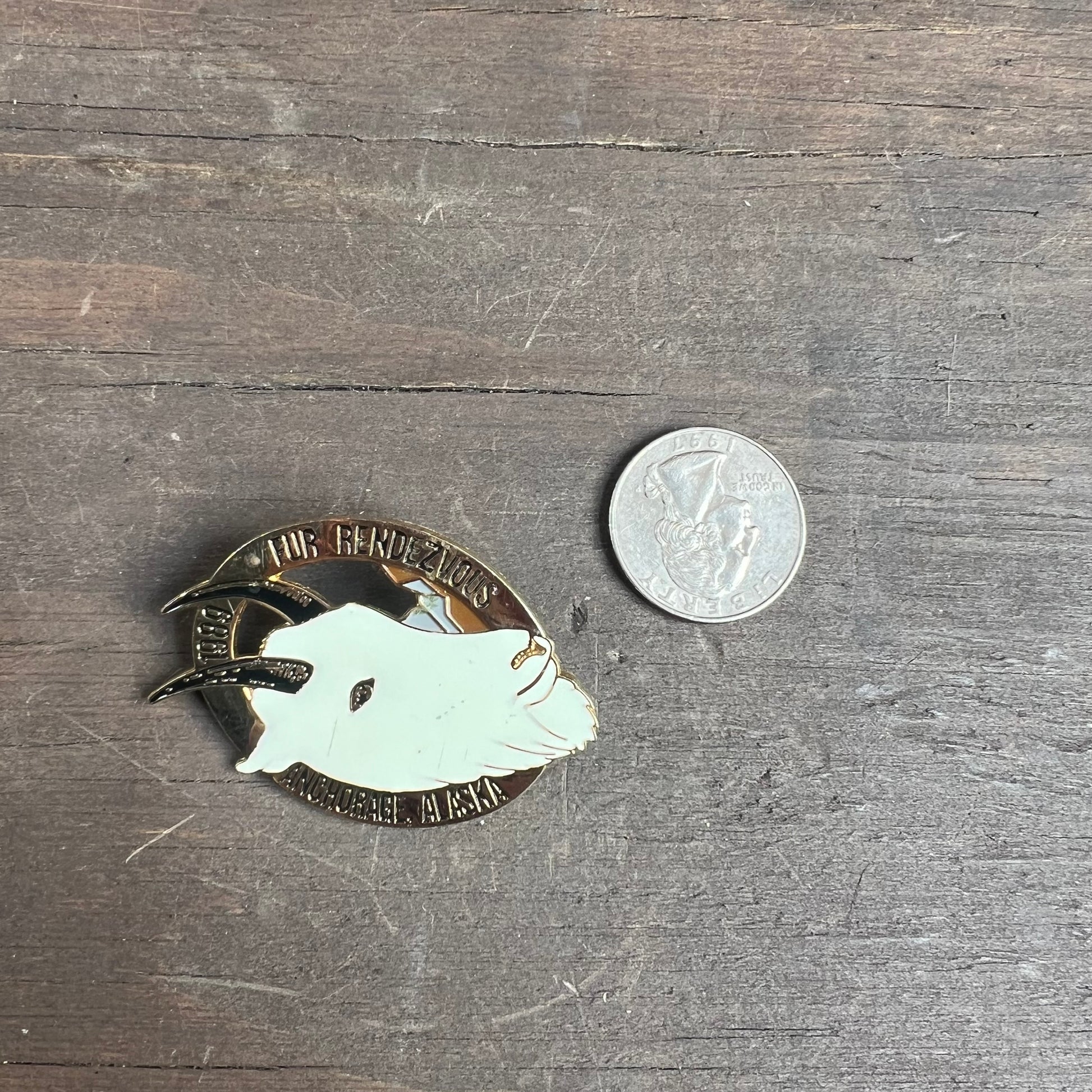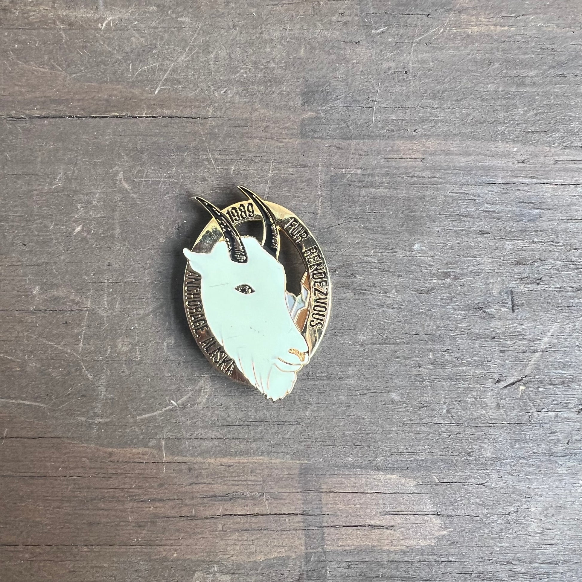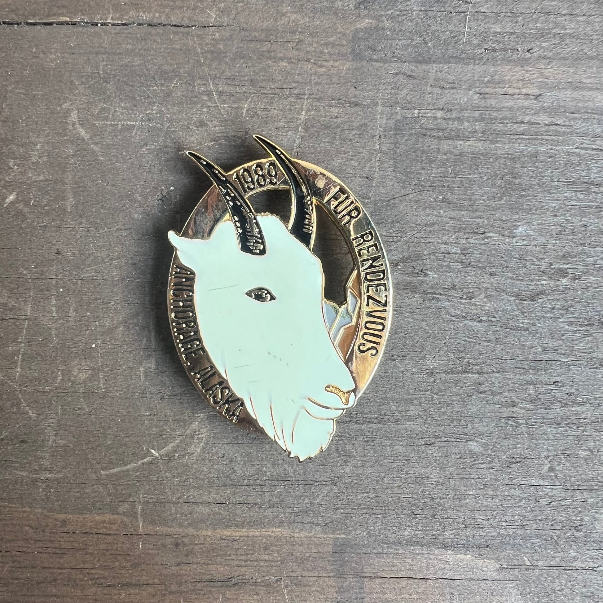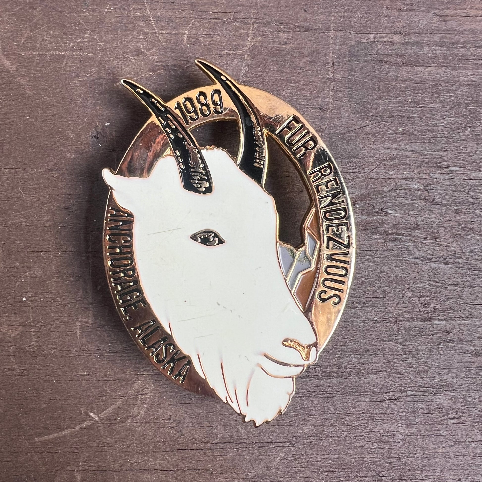 This pin is from the 1989 Fur Rendezvous in Anchorage, Alaska. The pin has an image of a goat with black lettering around it. The fur rendezvous is an annual winter festival held in Anchorage, Alaska to celebrate the city’s heritage and culture. Pin is in good condition, slightly worn due to age. See image with quarter for scale.