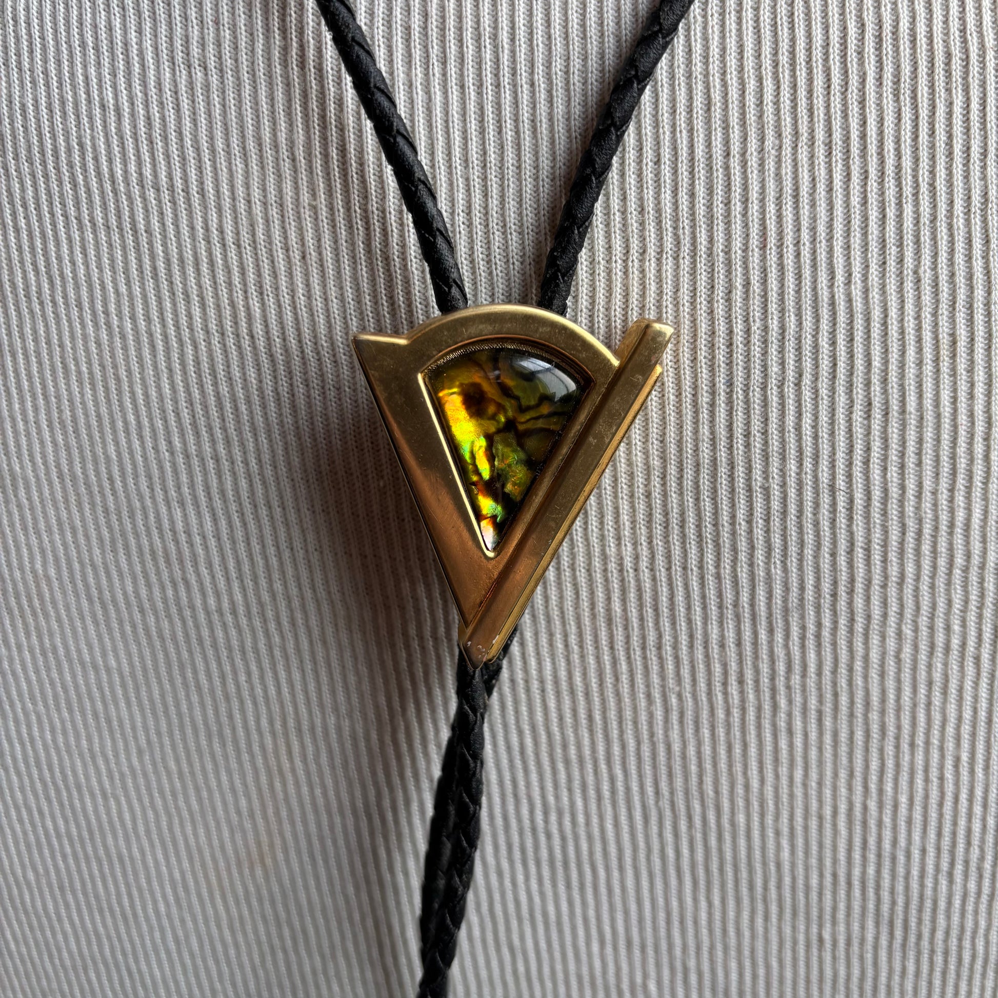 Beautiful and unique abalone bolo on black leather tie, stone in interesting V-shape with gold tone tips in good condition