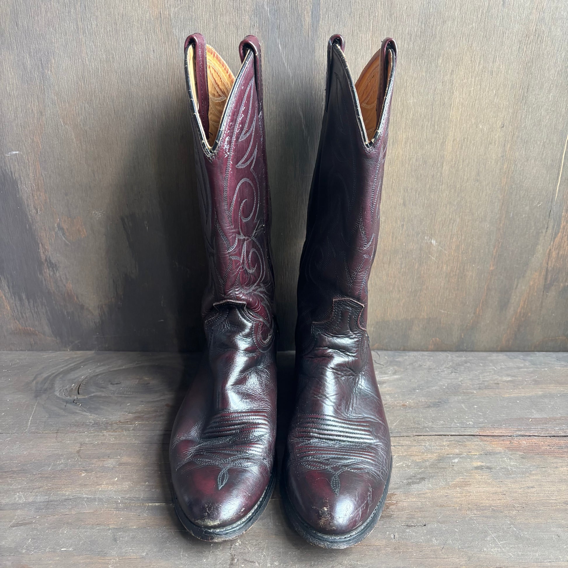 Beautiful ACME burgundy leather boots in great condition, a stunning ox blood color with red and purple tones, men's 10.5