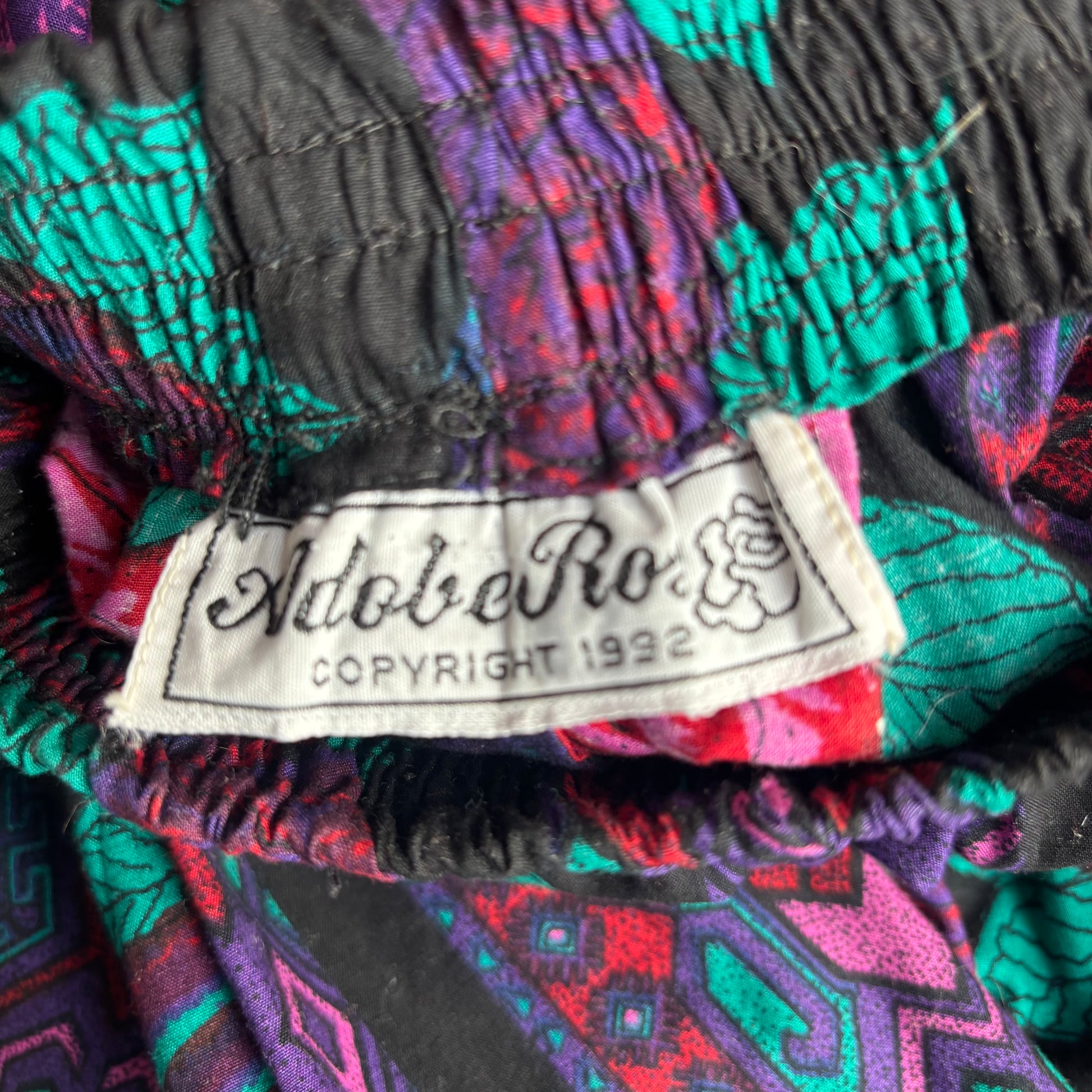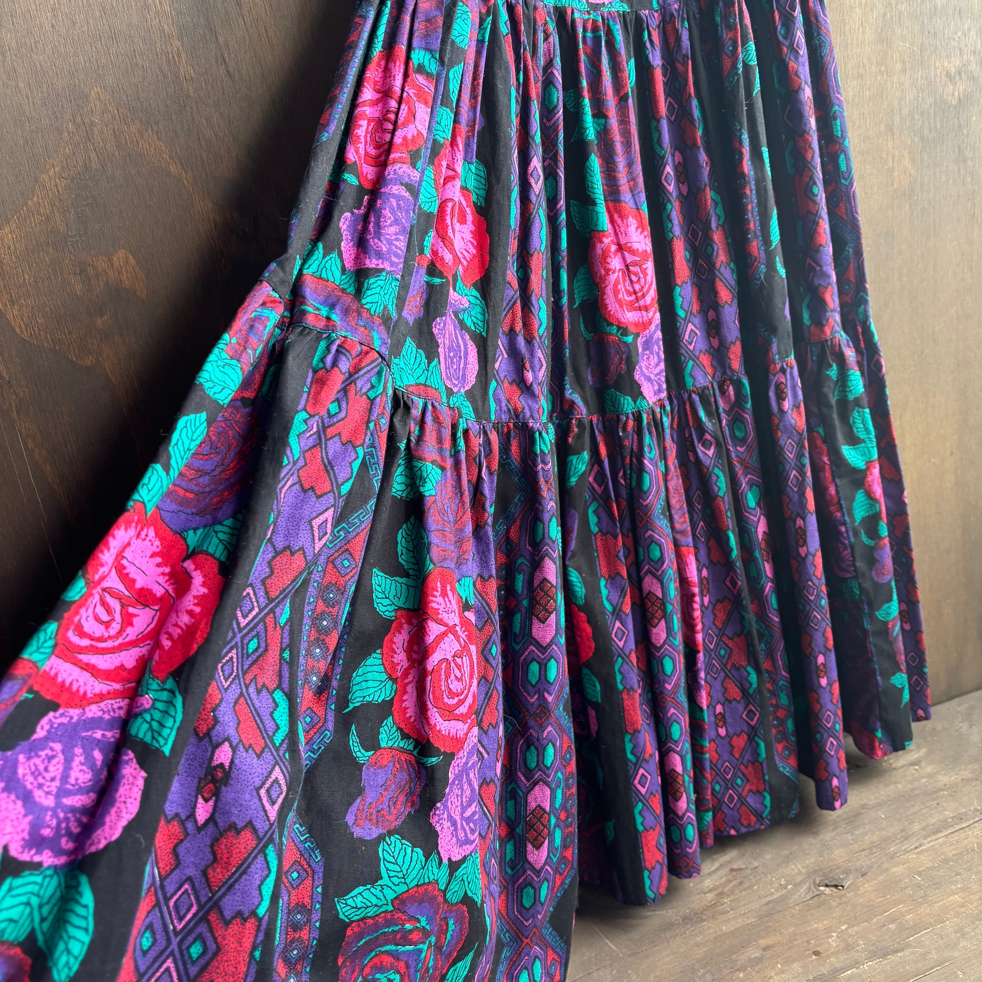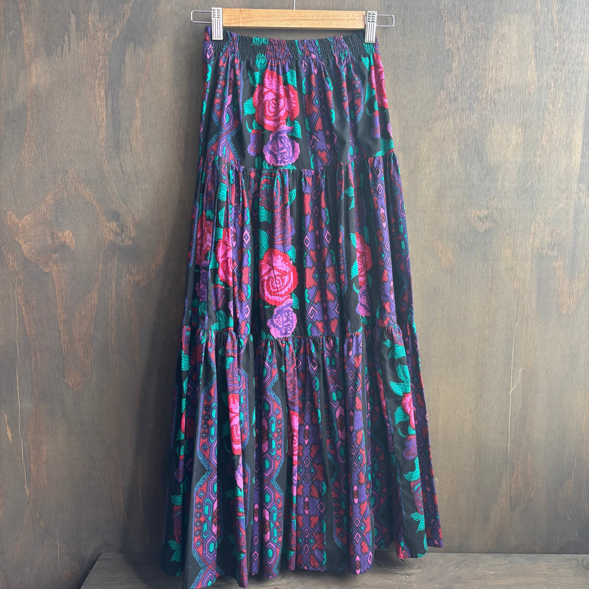 Pretty and colorful Adobe Rose maxi skirt with pink purple and teal floral pattern, elastic waist, feels like 100% cotton, size S