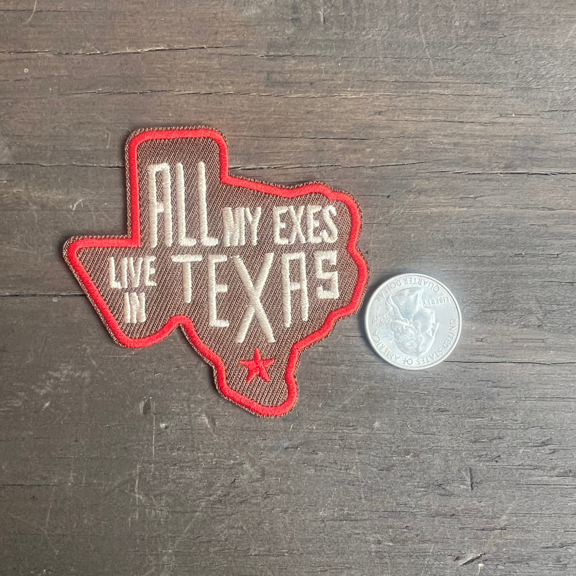 Texas state patch with text “All My Exes Live in Texas.” See quarter for scale.