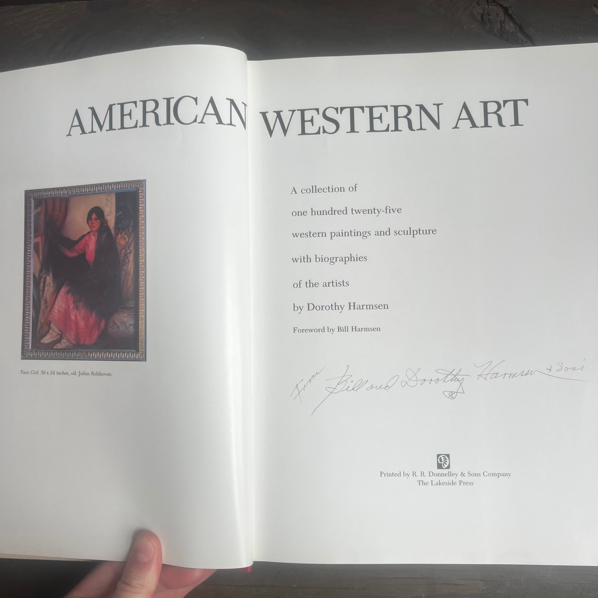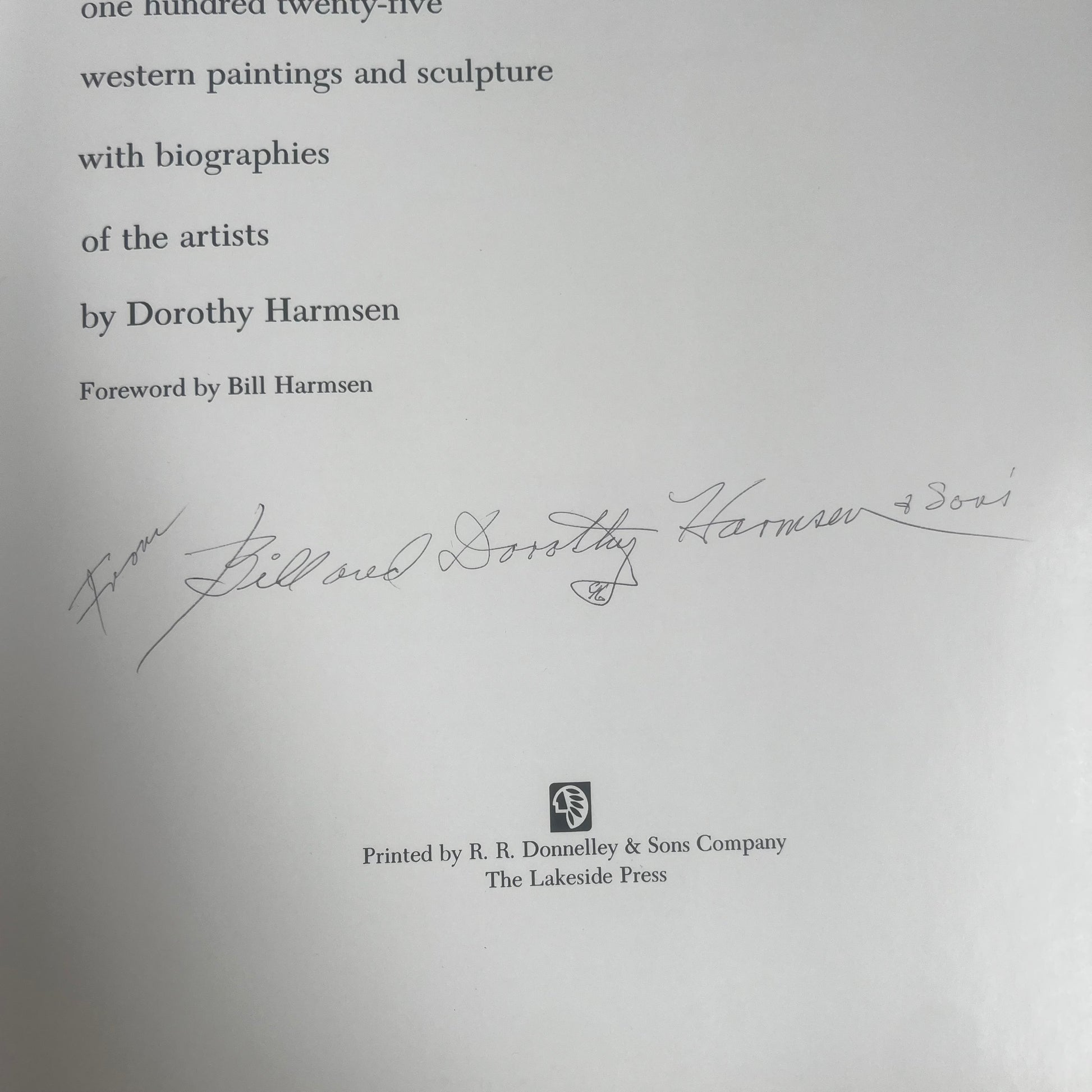 American Western Art book by Dorothy Harmsen. A collection on one hundred twenty-five western paintings and sculptures with biographies of the artists. Booked signed by the author.