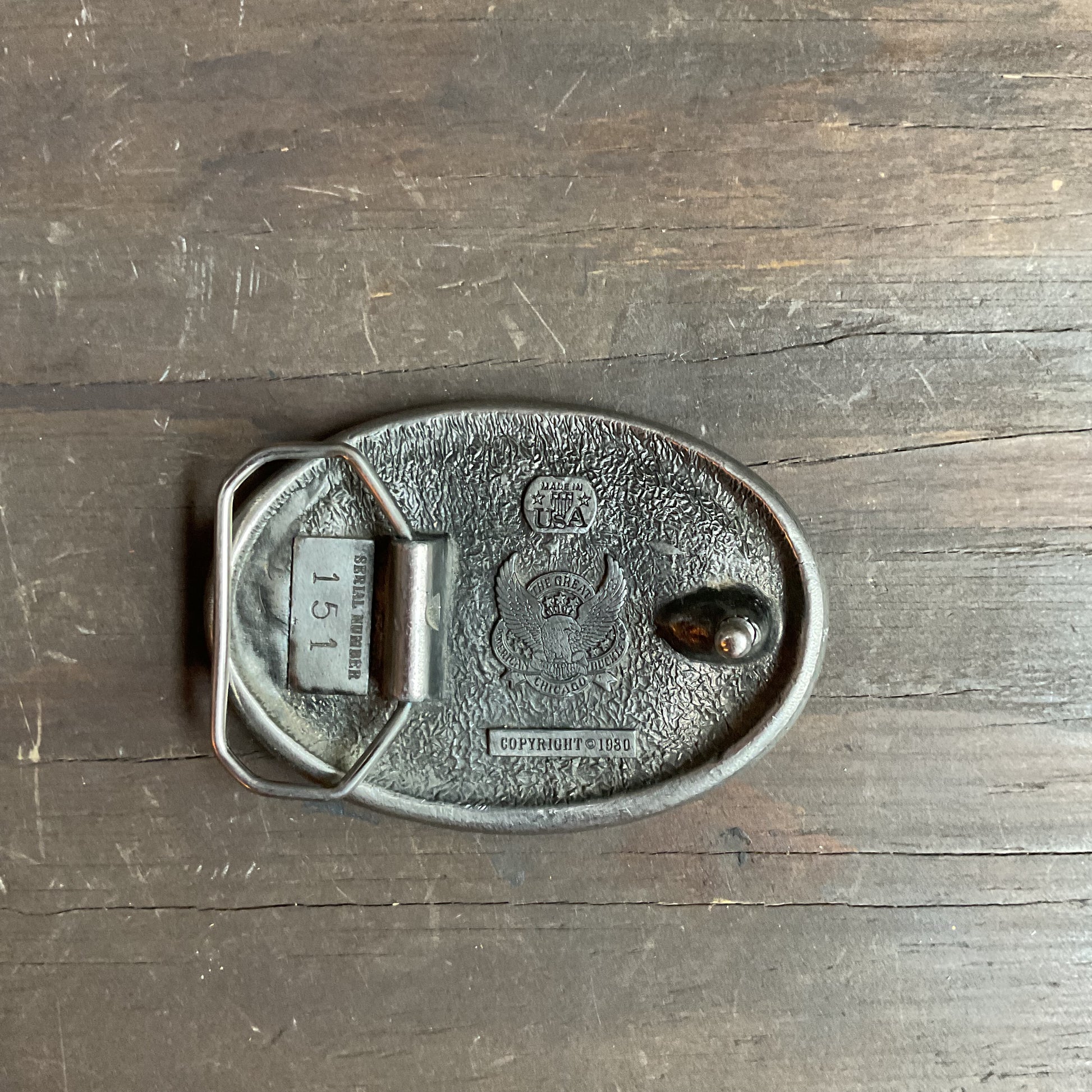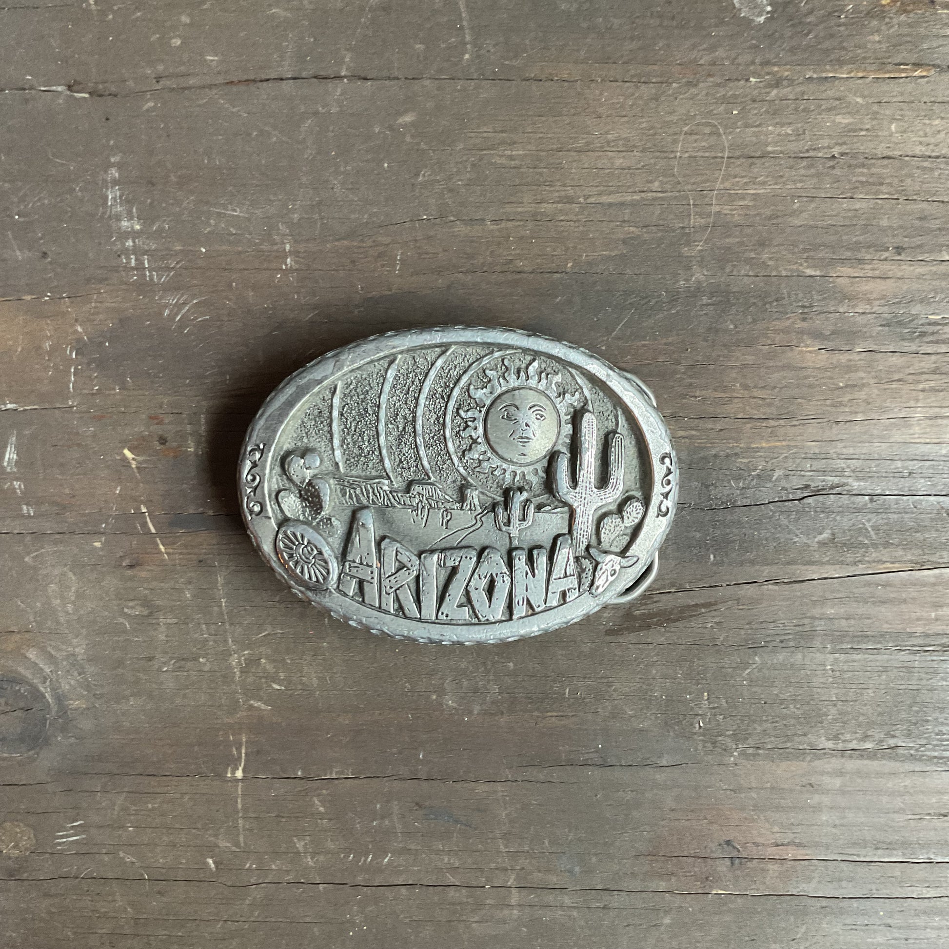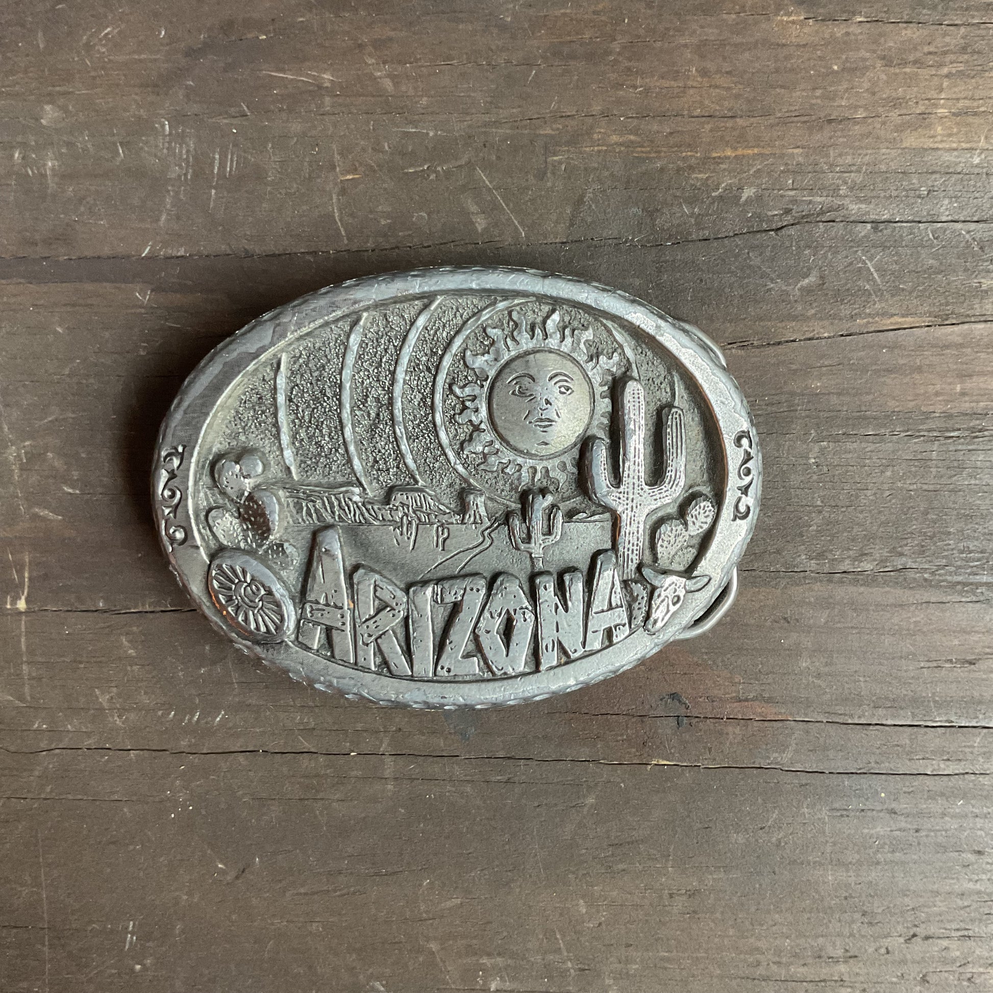 Coolest rustic style Arizona belt buckle, featuring iconic desert imagery. In excellent condition, 4" across.