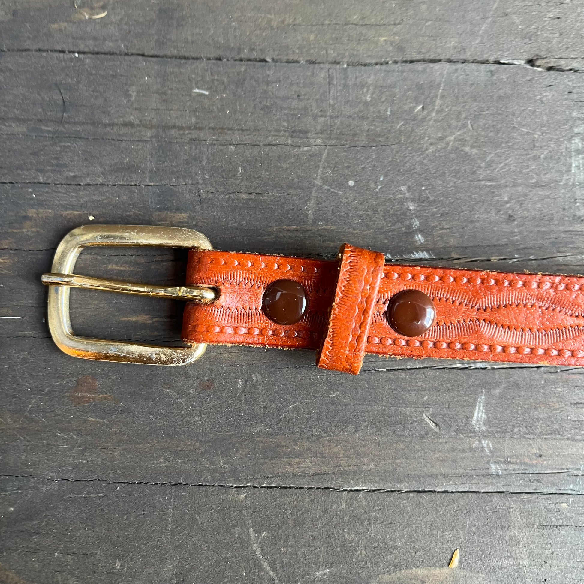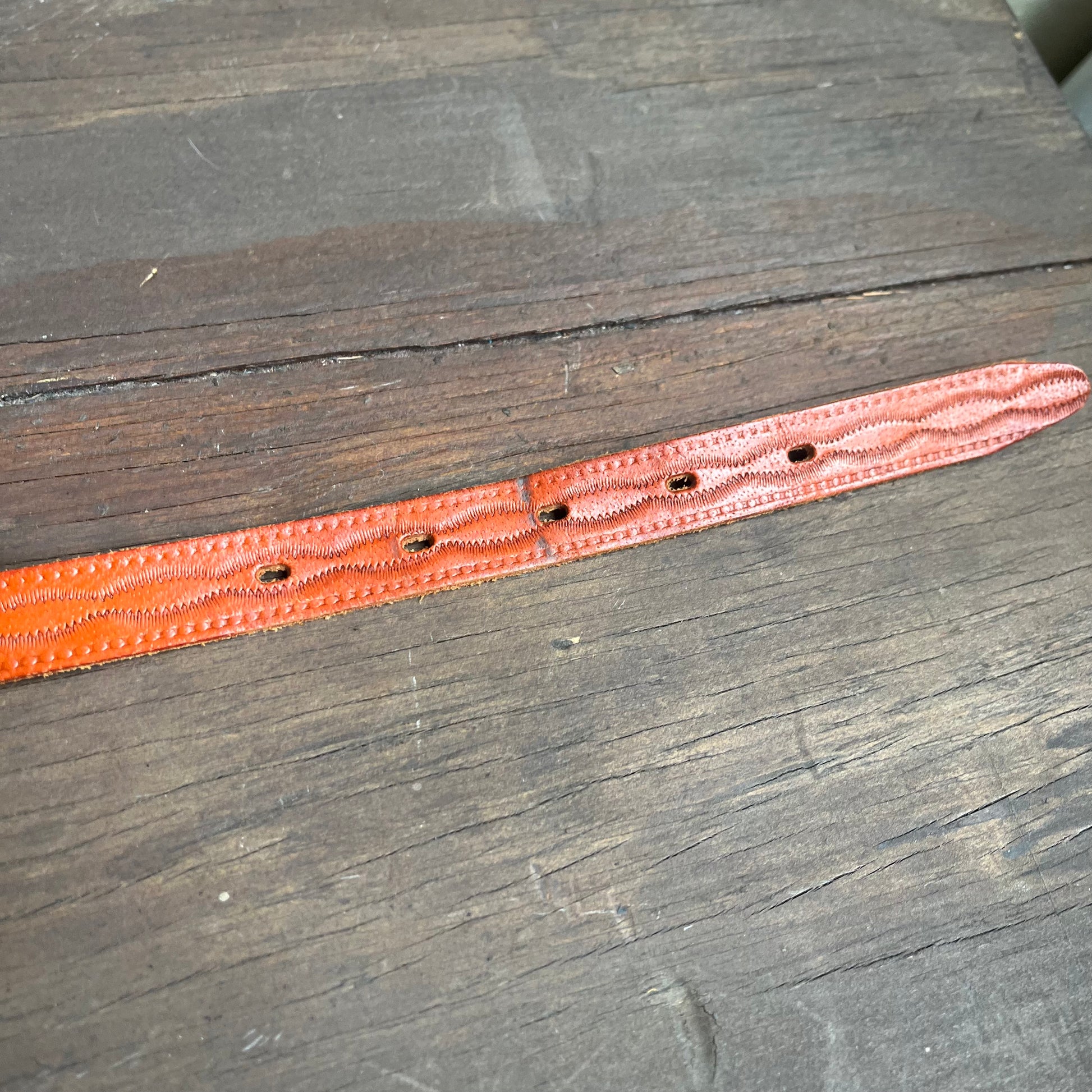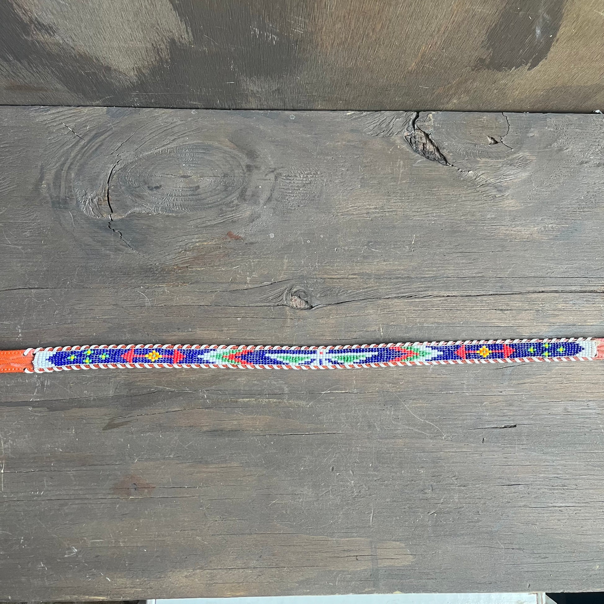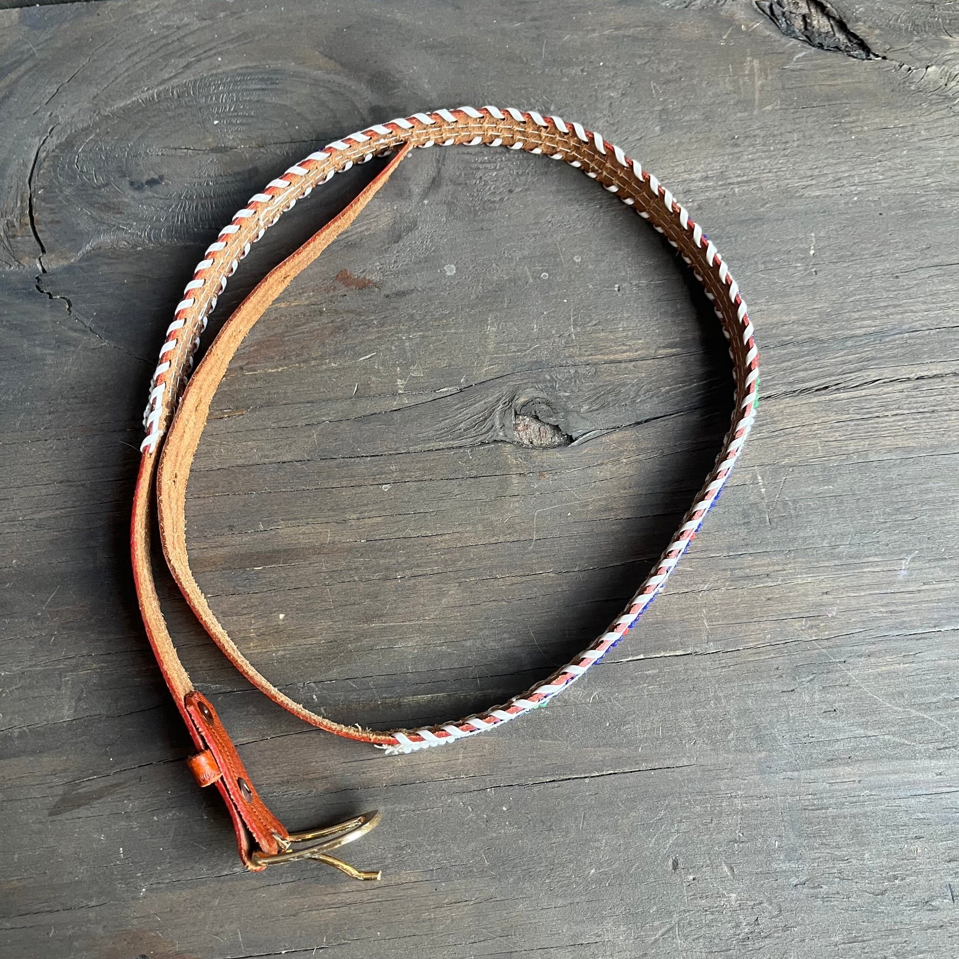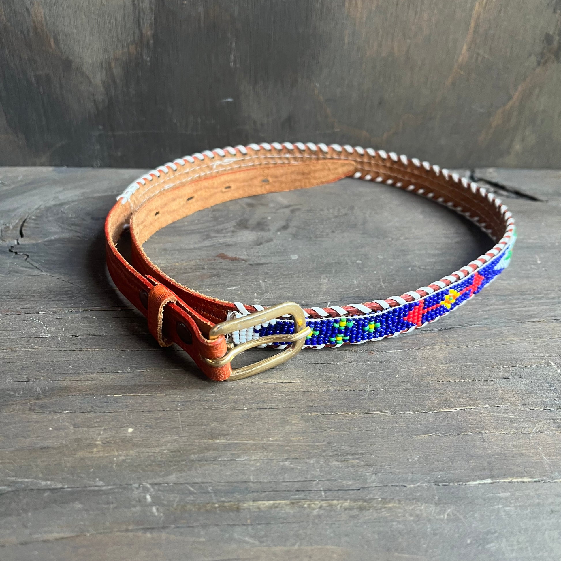 Beautifully hand beaded with white trim on a brown leather belt. Measures 31” in good condition but a few missing beads.