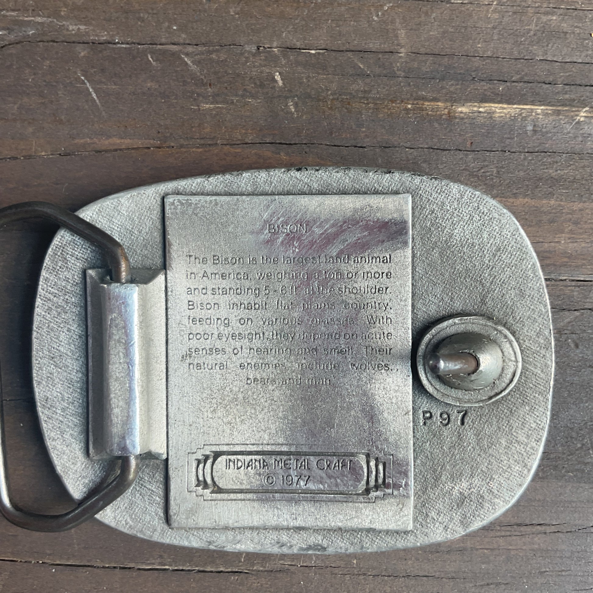 Coolest bison belt buckle made by the Indiana Metal Craft. In excellent condition. About 3" across. Made from pewter.