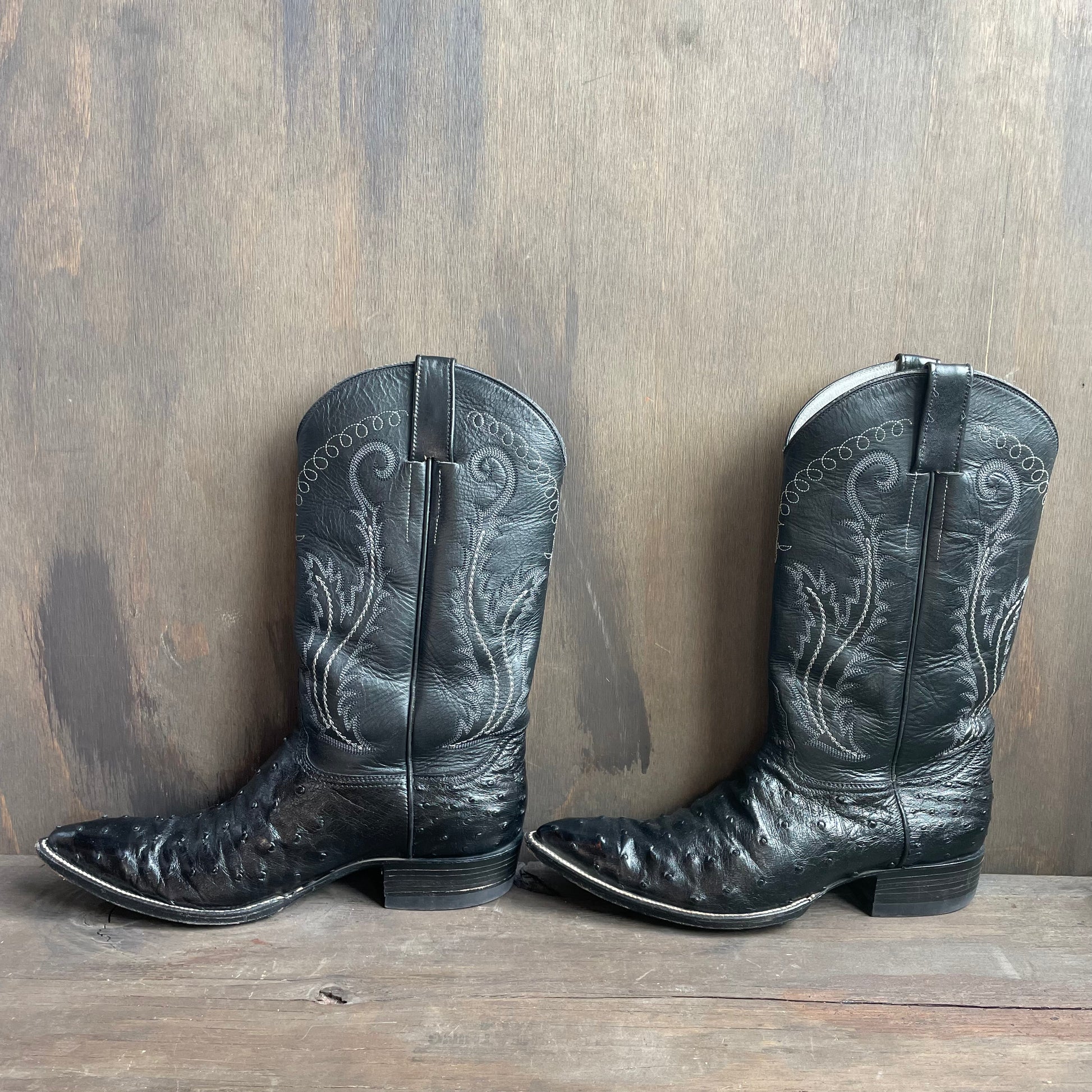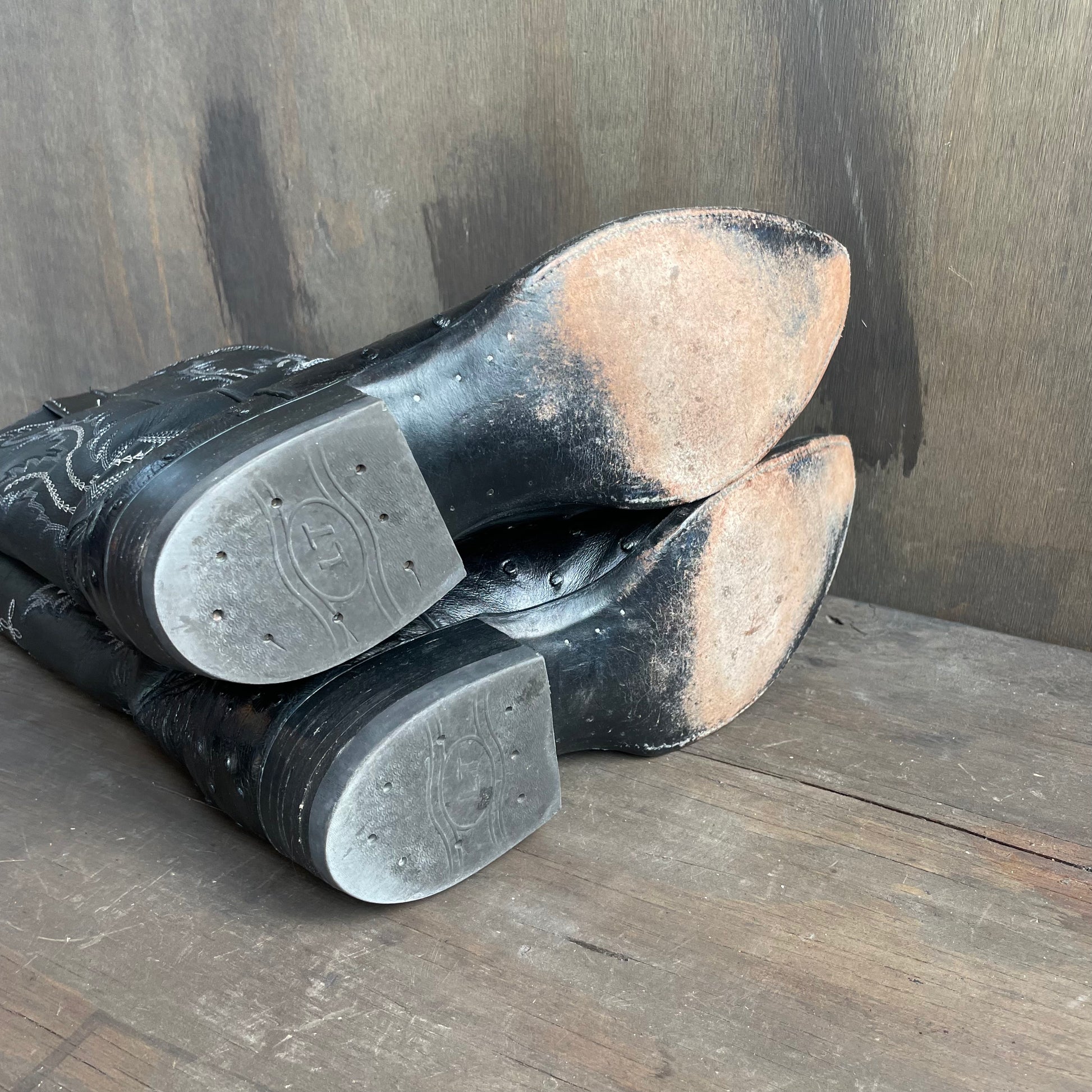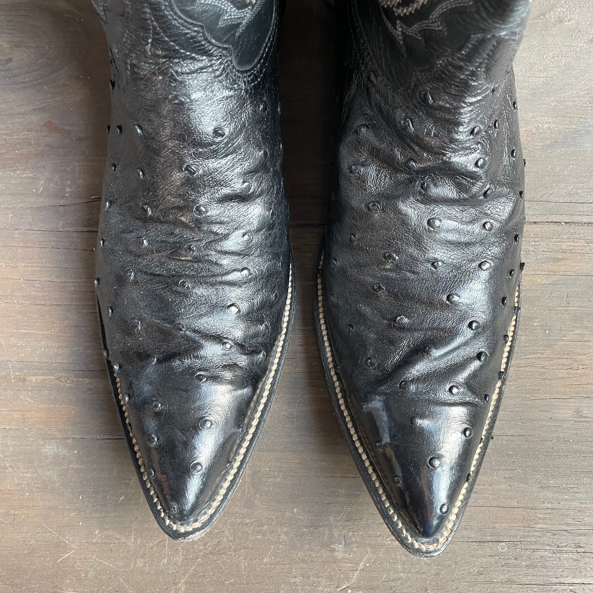 Stunning, custom-made black ostrich leather boots! Very soft, subtle leather with great texture and snip toe! Men's size 9.5 / womens 11/