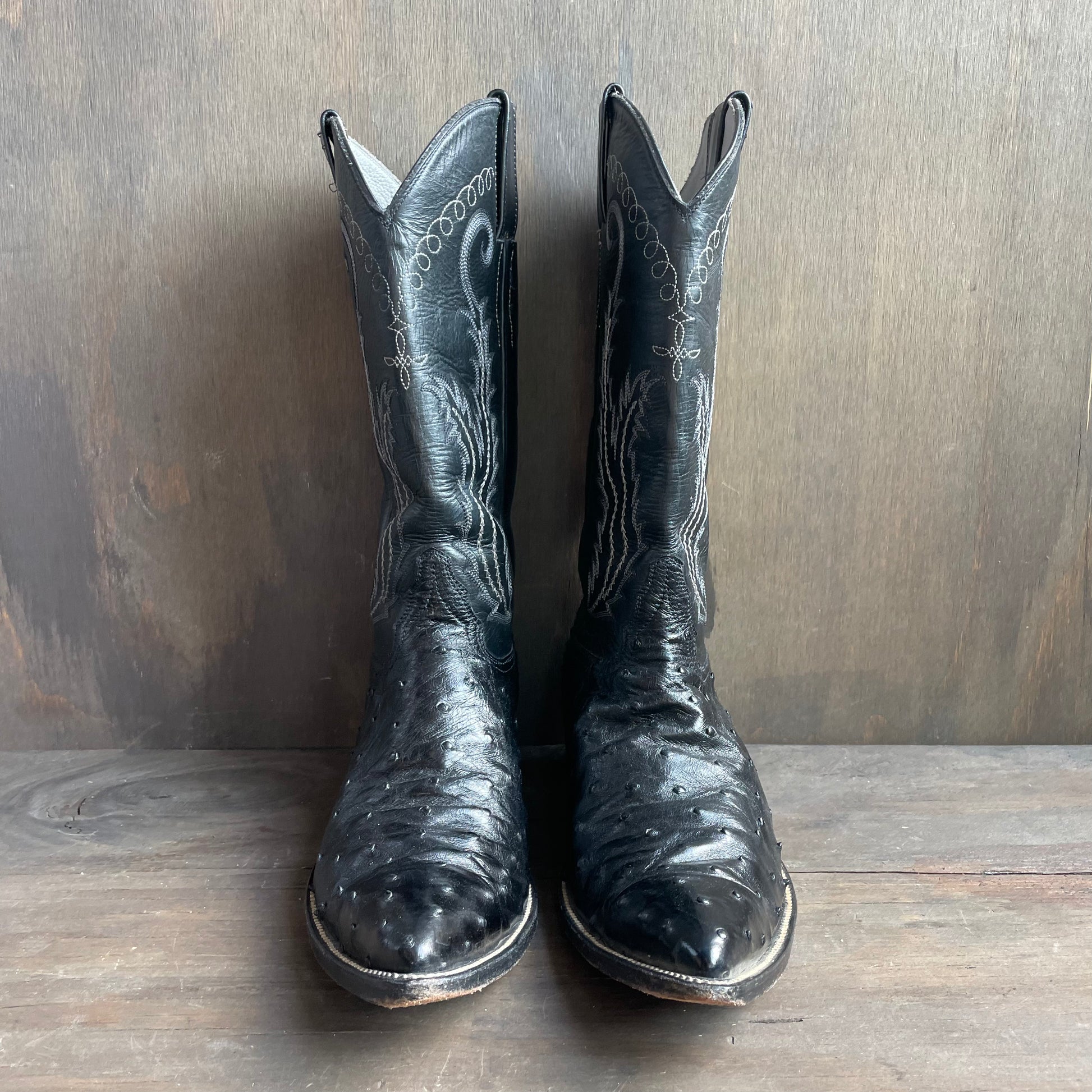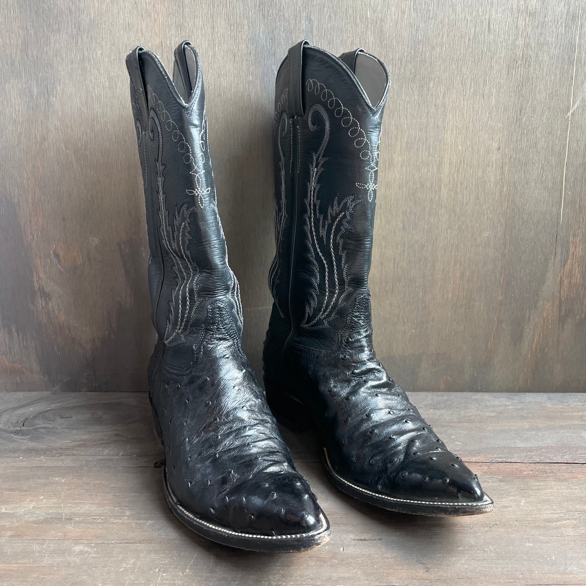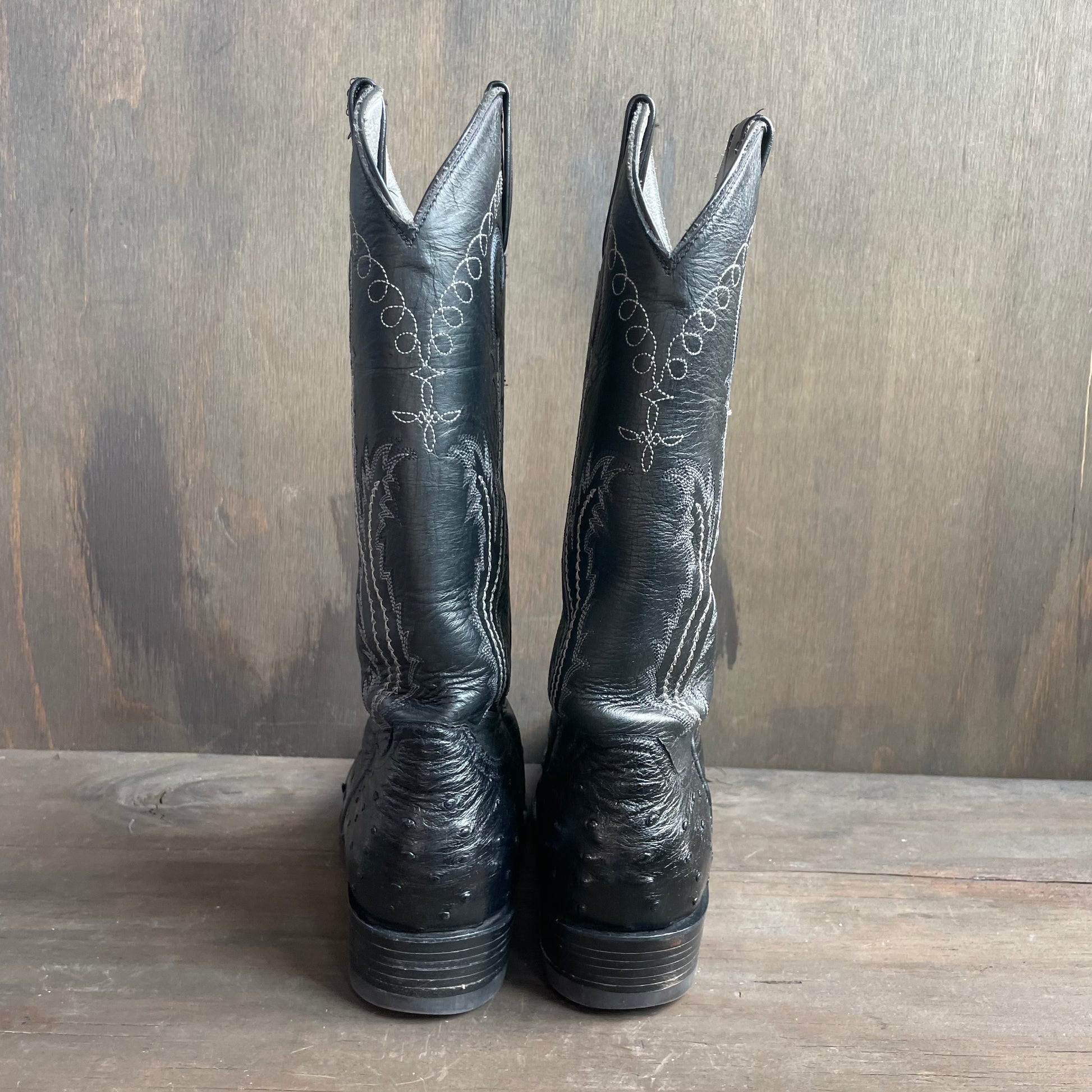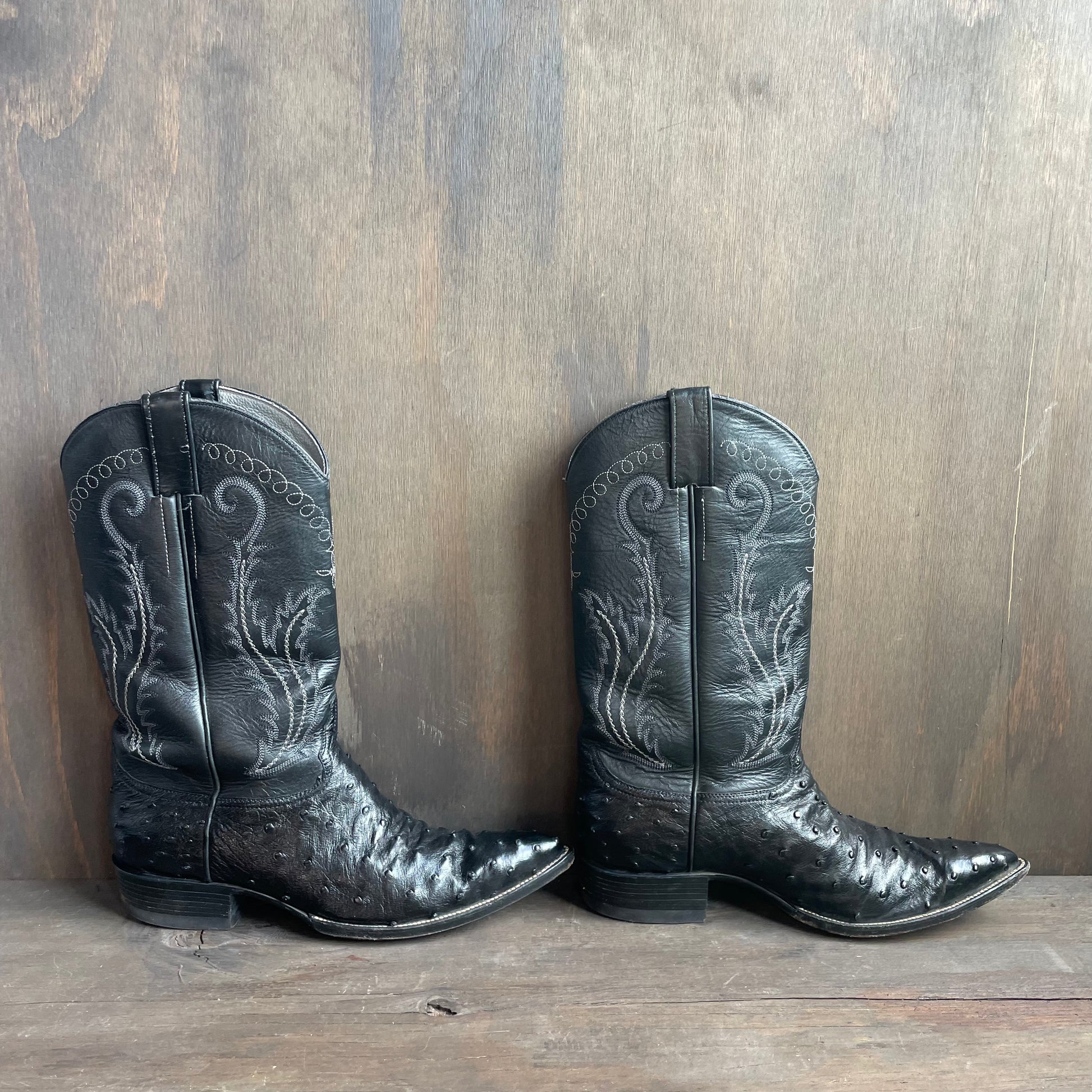 Stunning, custom-made black ostrich leather boots! Very soft, subtle leather with great texture and snip toe! Men's size 9.5 / womens 11/