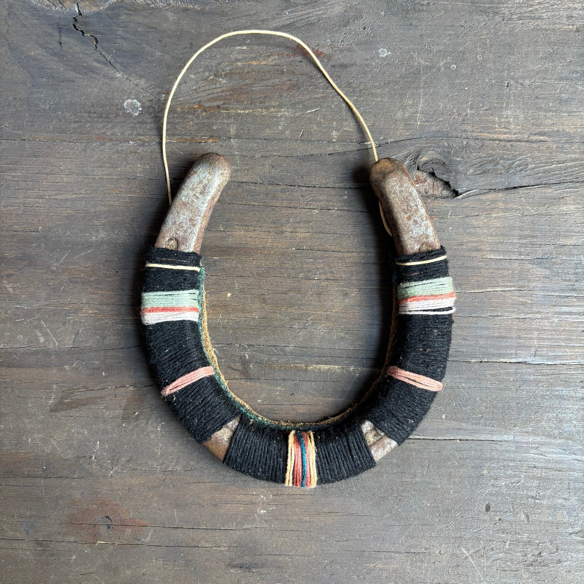 Adorable thread wrapped metal horseshoes with attached hanging string and leather backing.