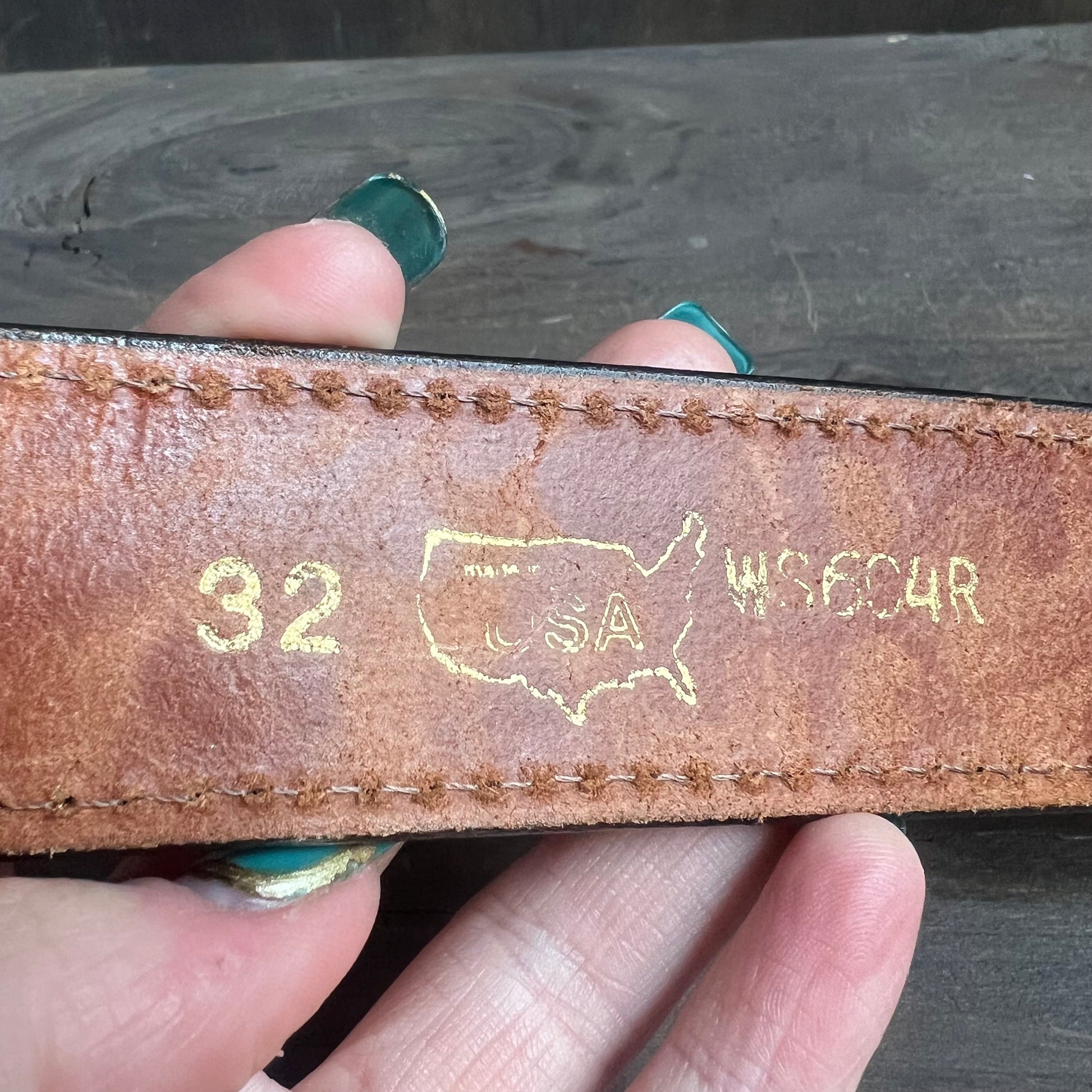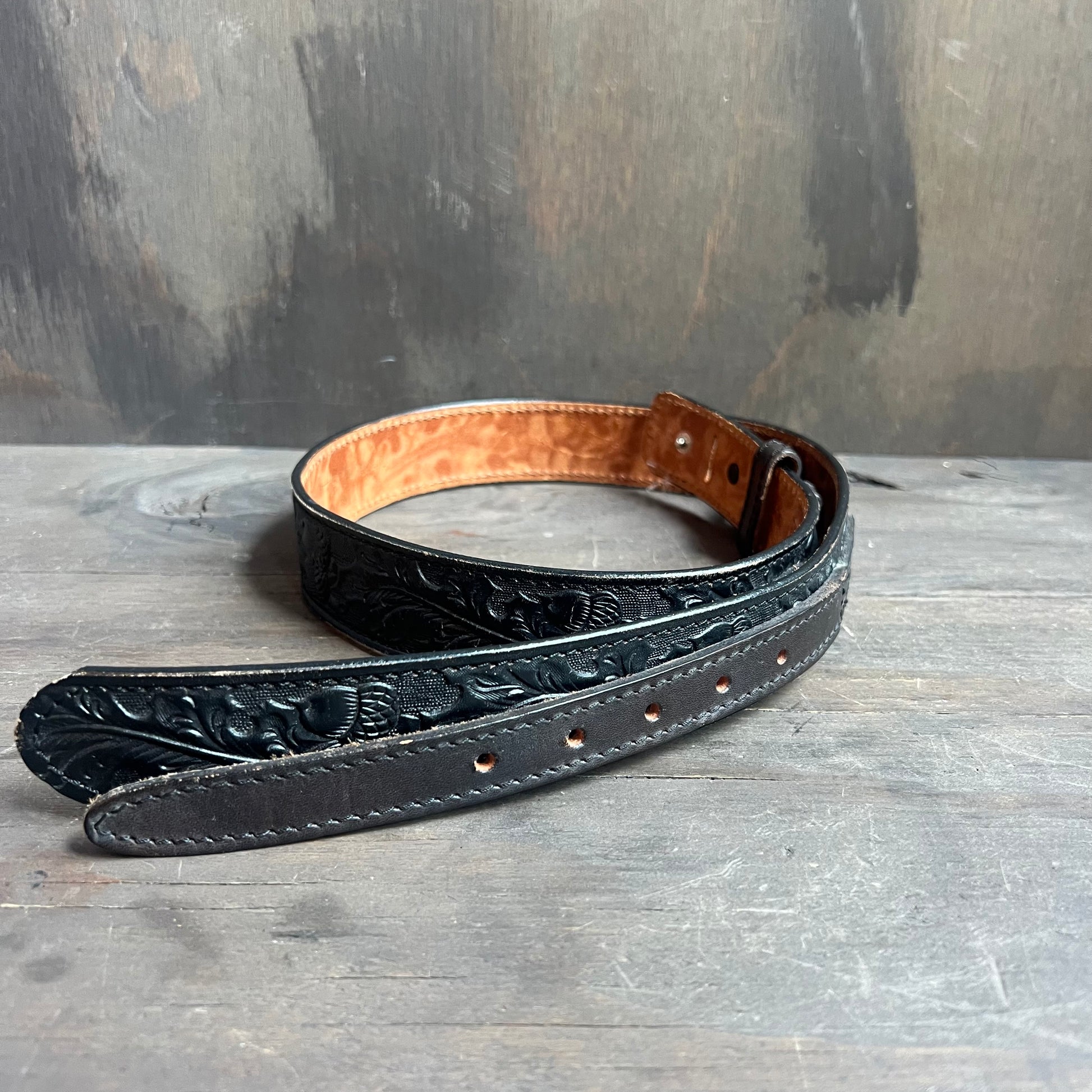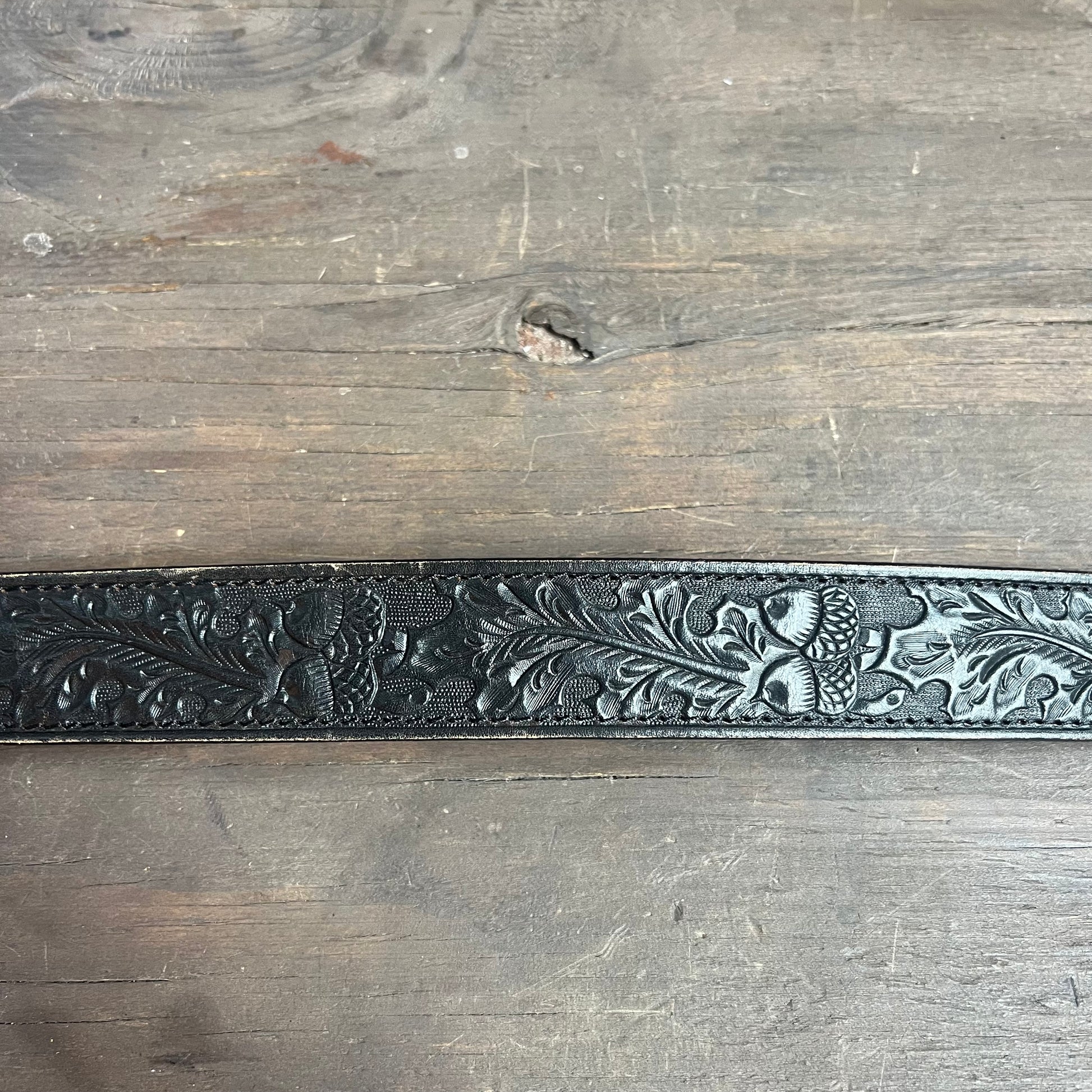 Tooled belt made from black leather with leaves and acorn designs.