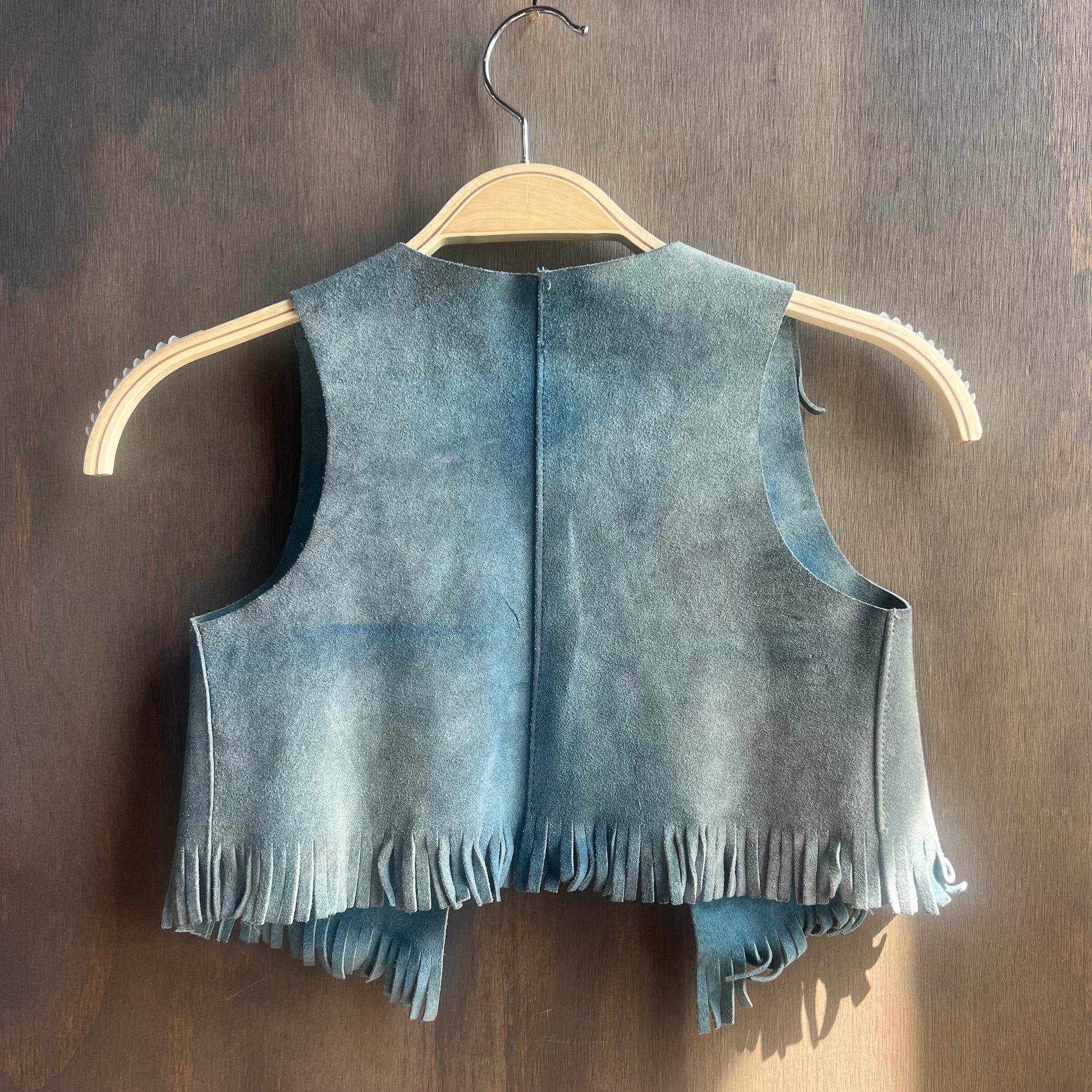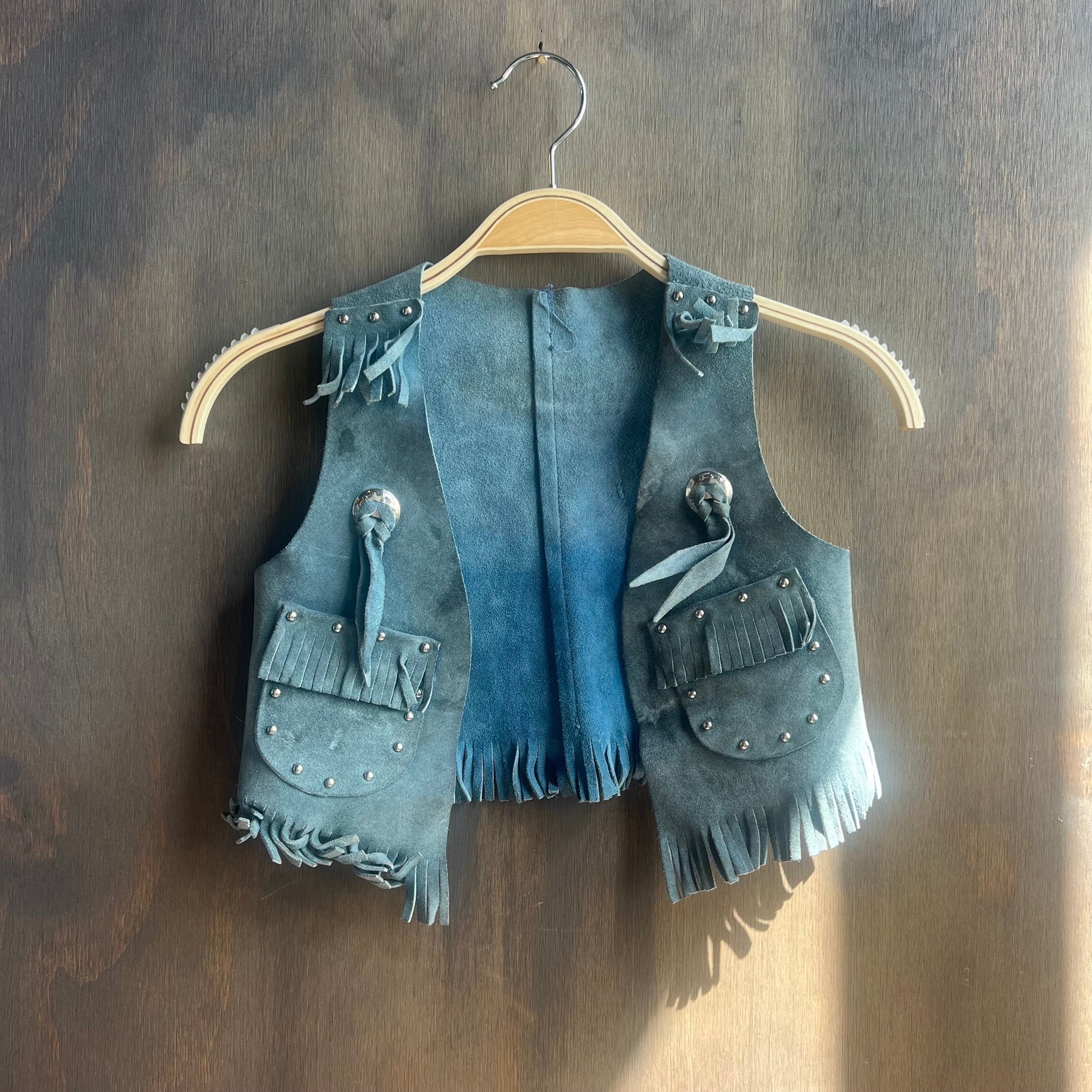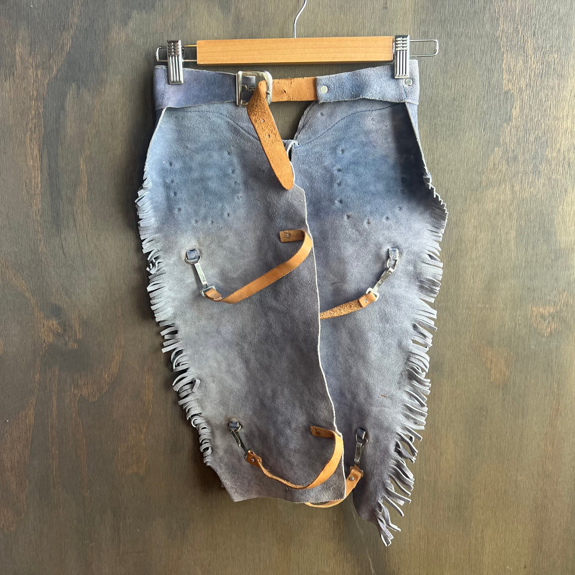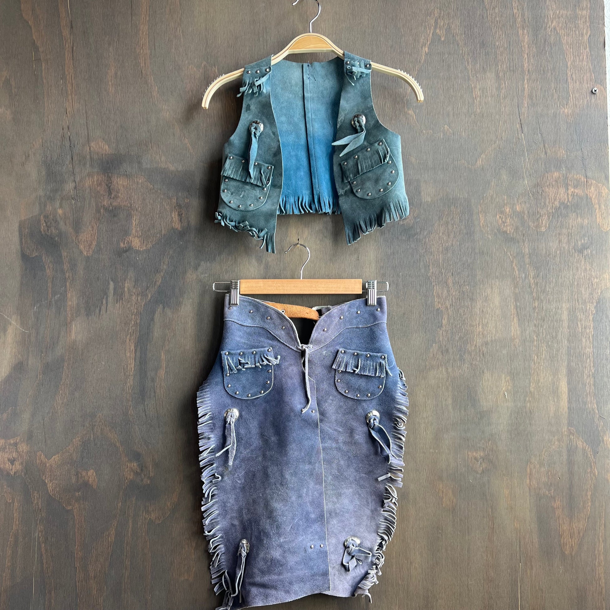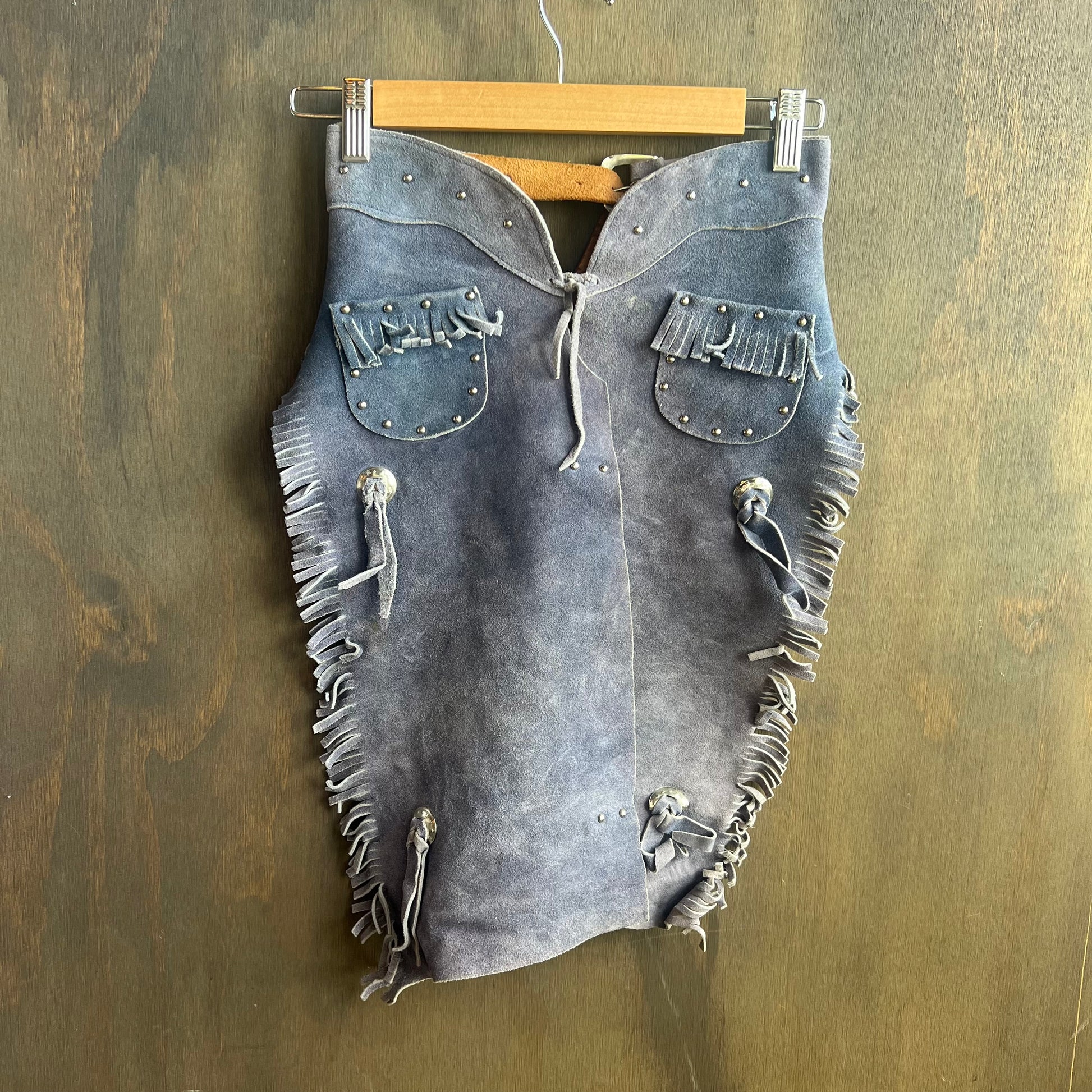 Adorable leather chaps and vest made from soft blue leather. Chaps and vest are embellished with silver studs and fringe. In excellent condition. Kids S.