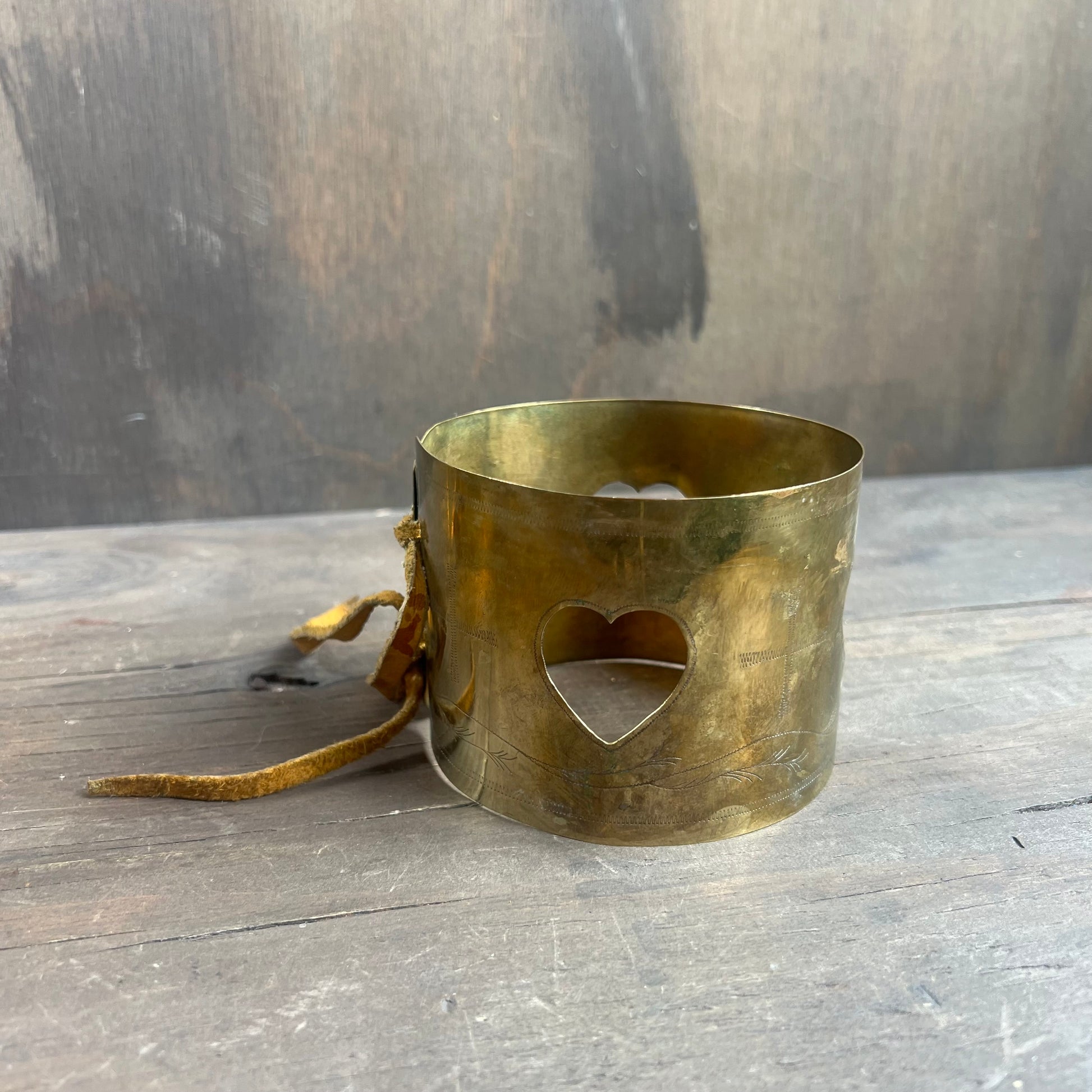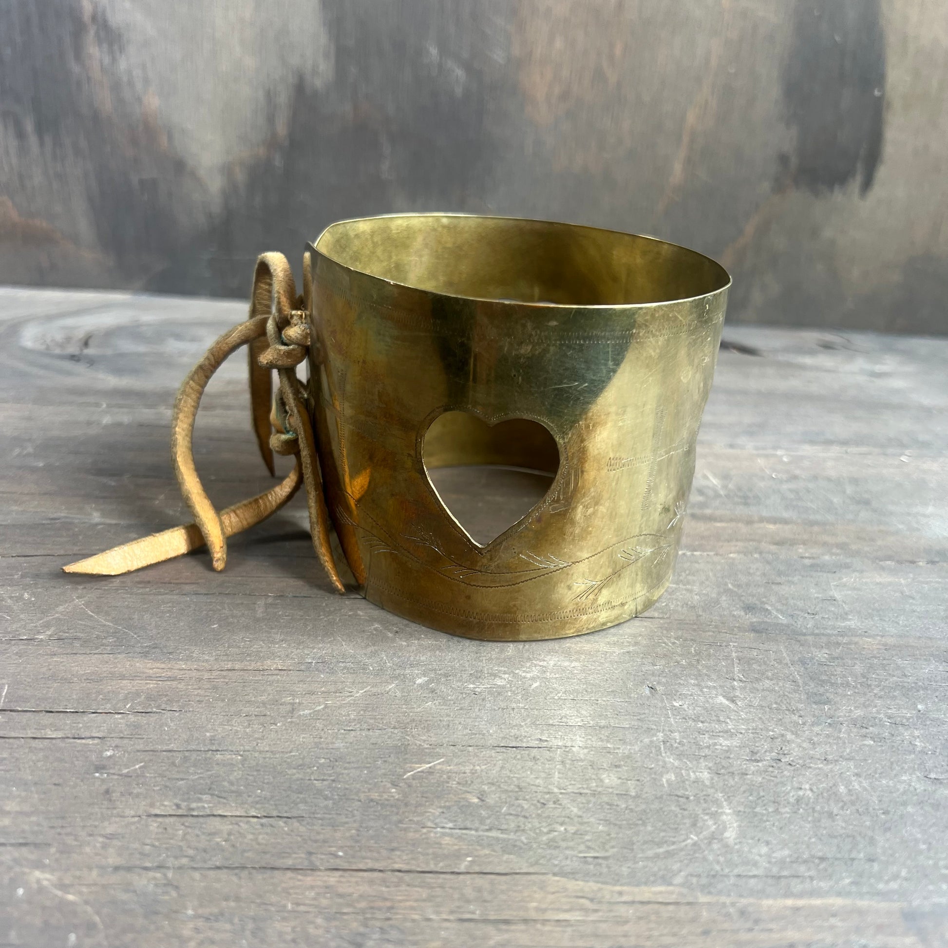 Vintage brass arm cuffs with heart cut outs. The arm cuffs can be fastened with leather ties, and can be adjusted as needed.