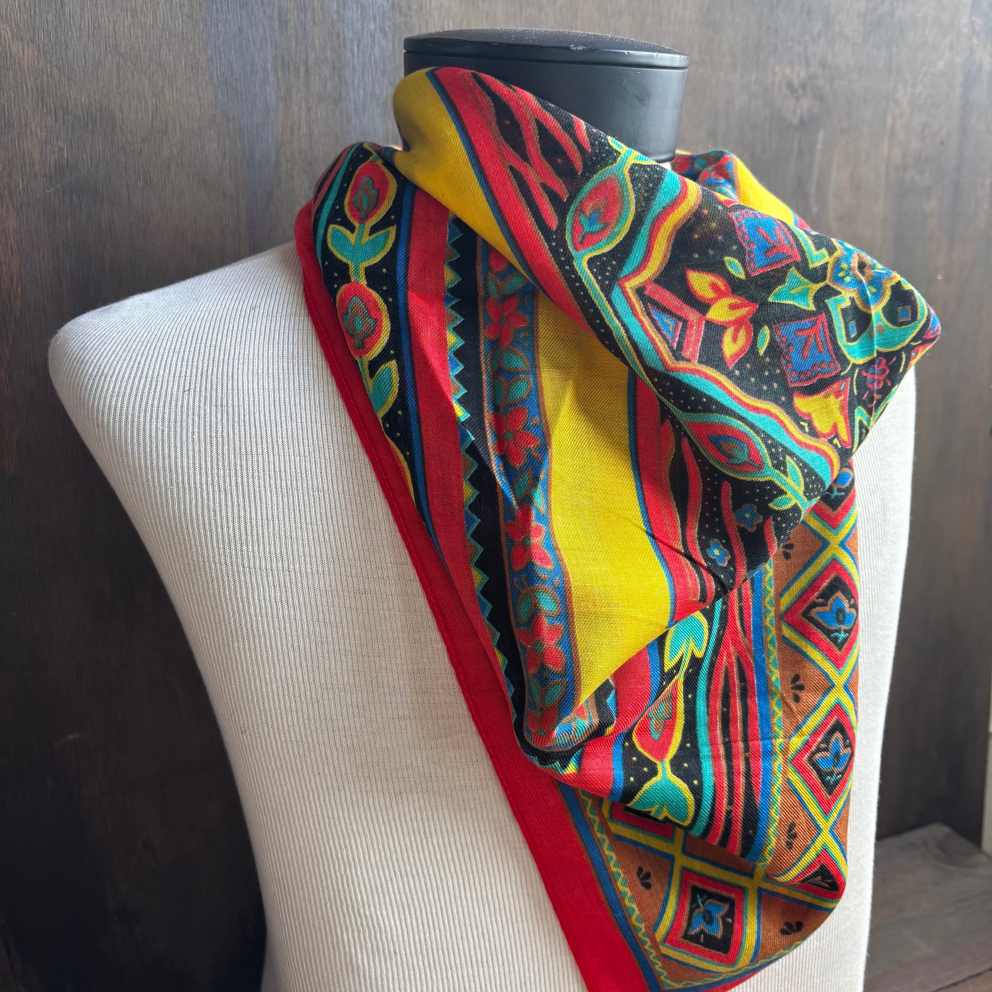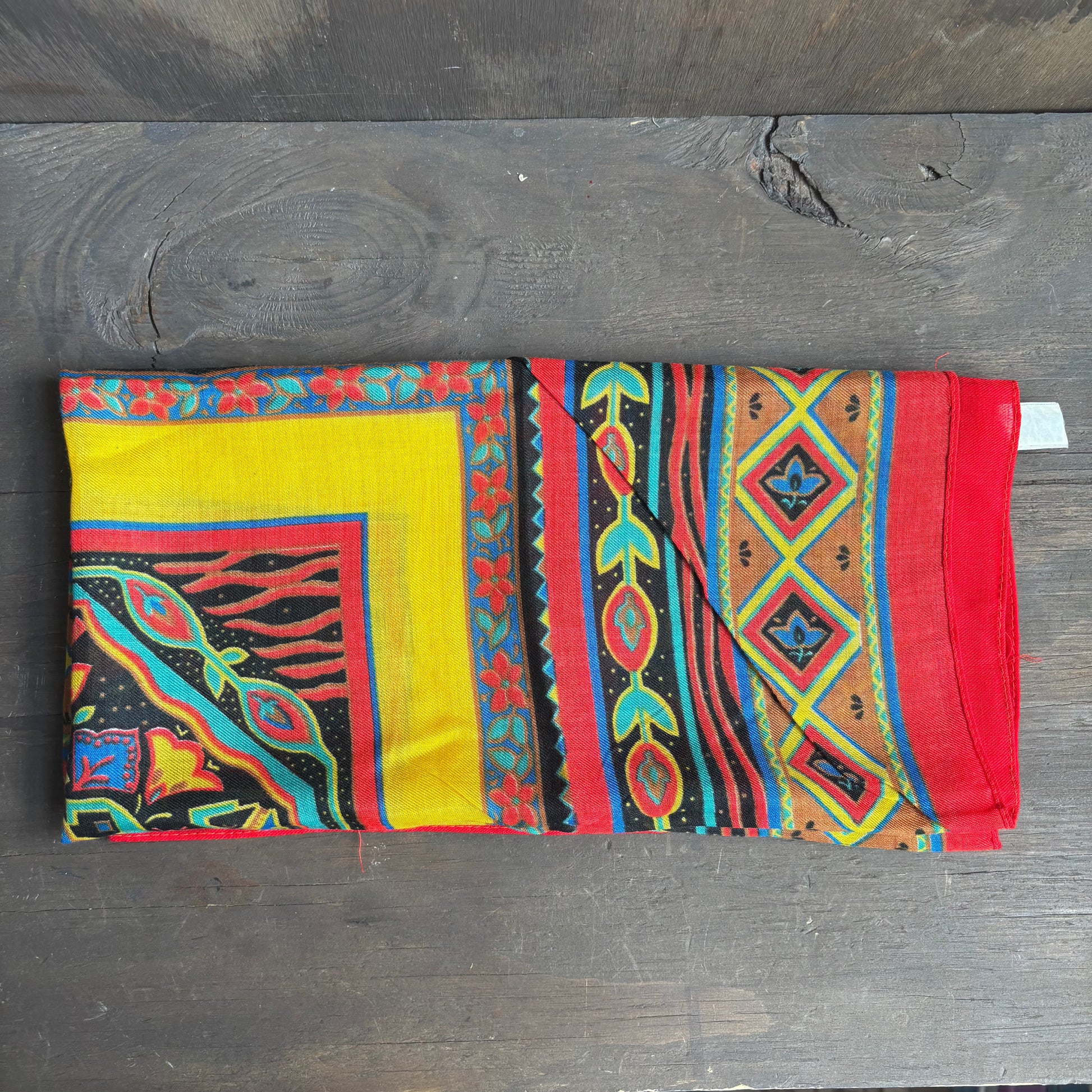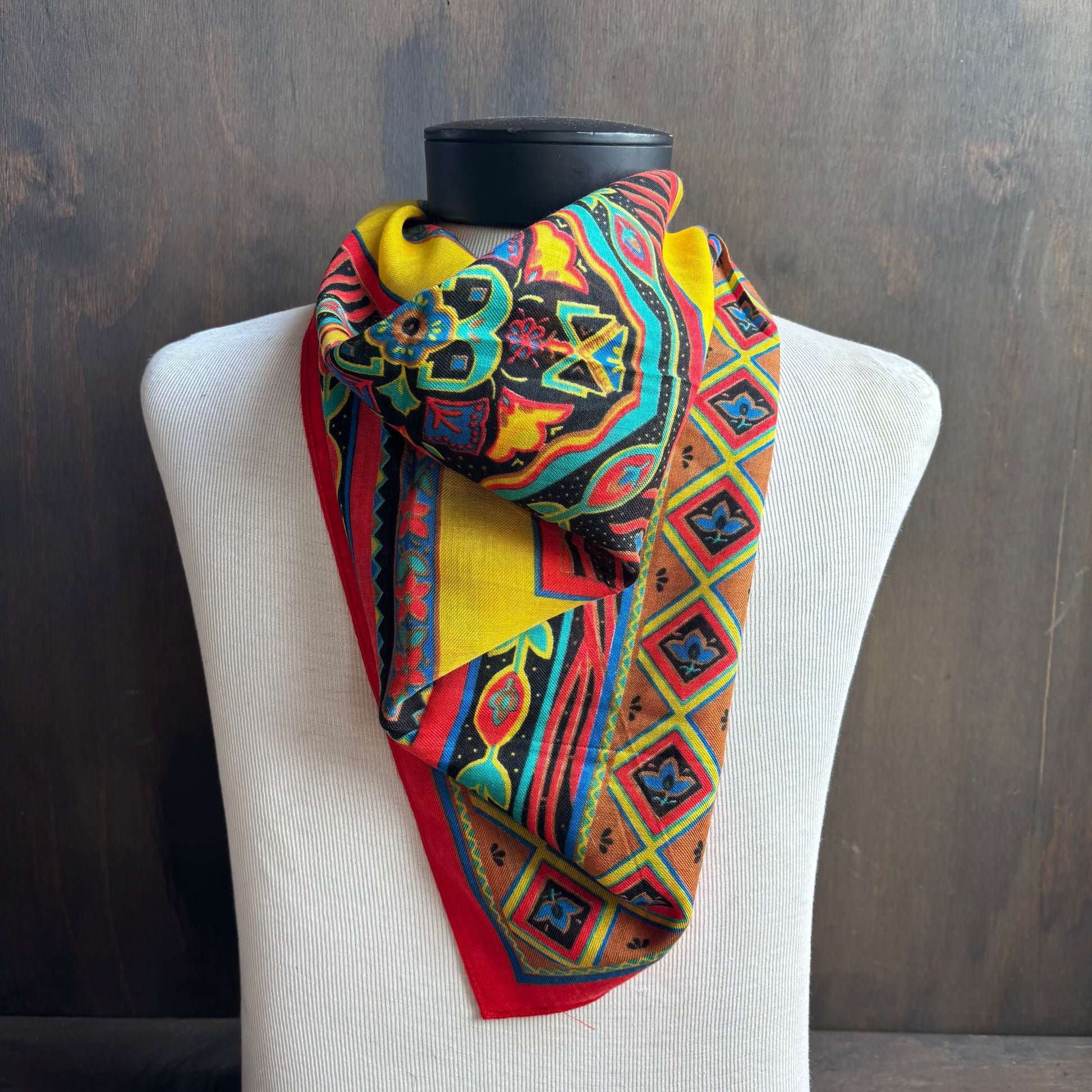Bright and unique oversized scarf featuring flowers and graphic designs, made in Japan.