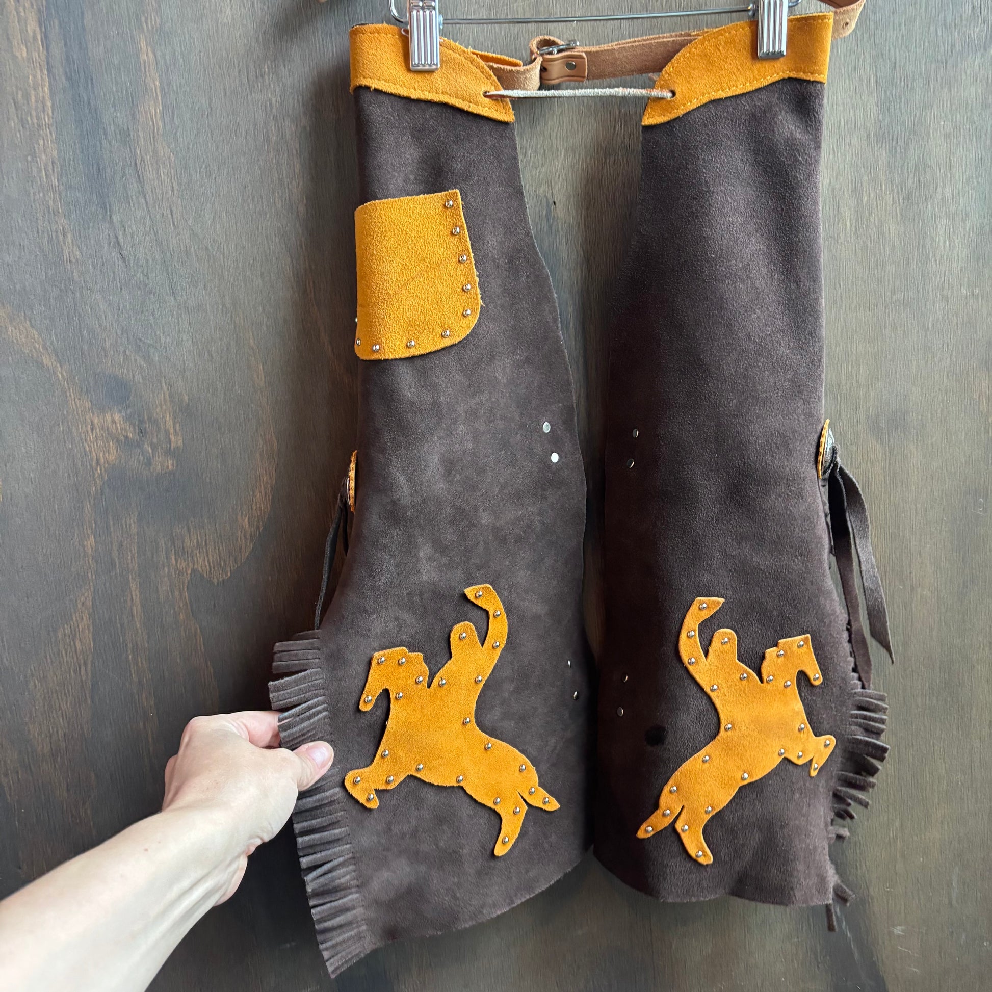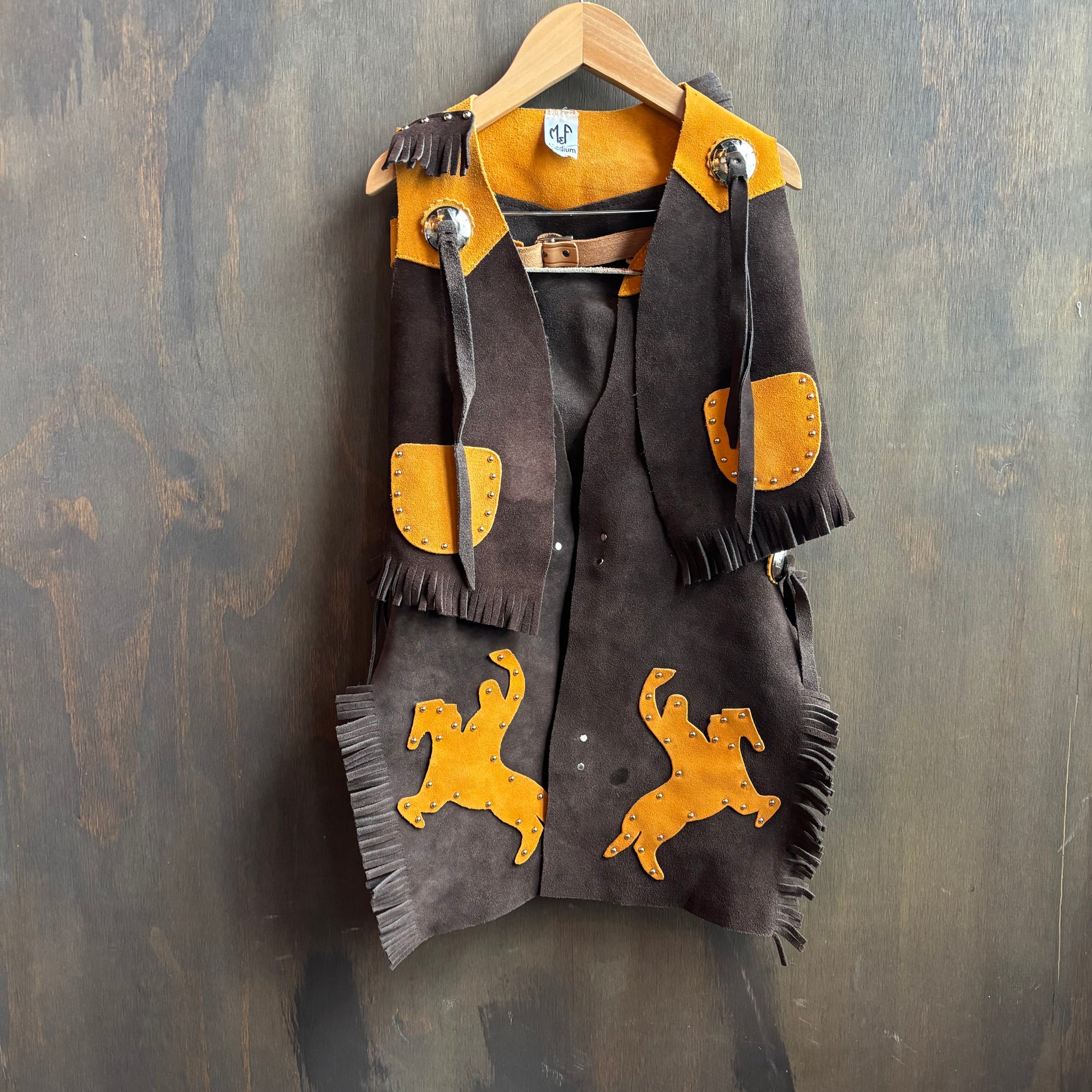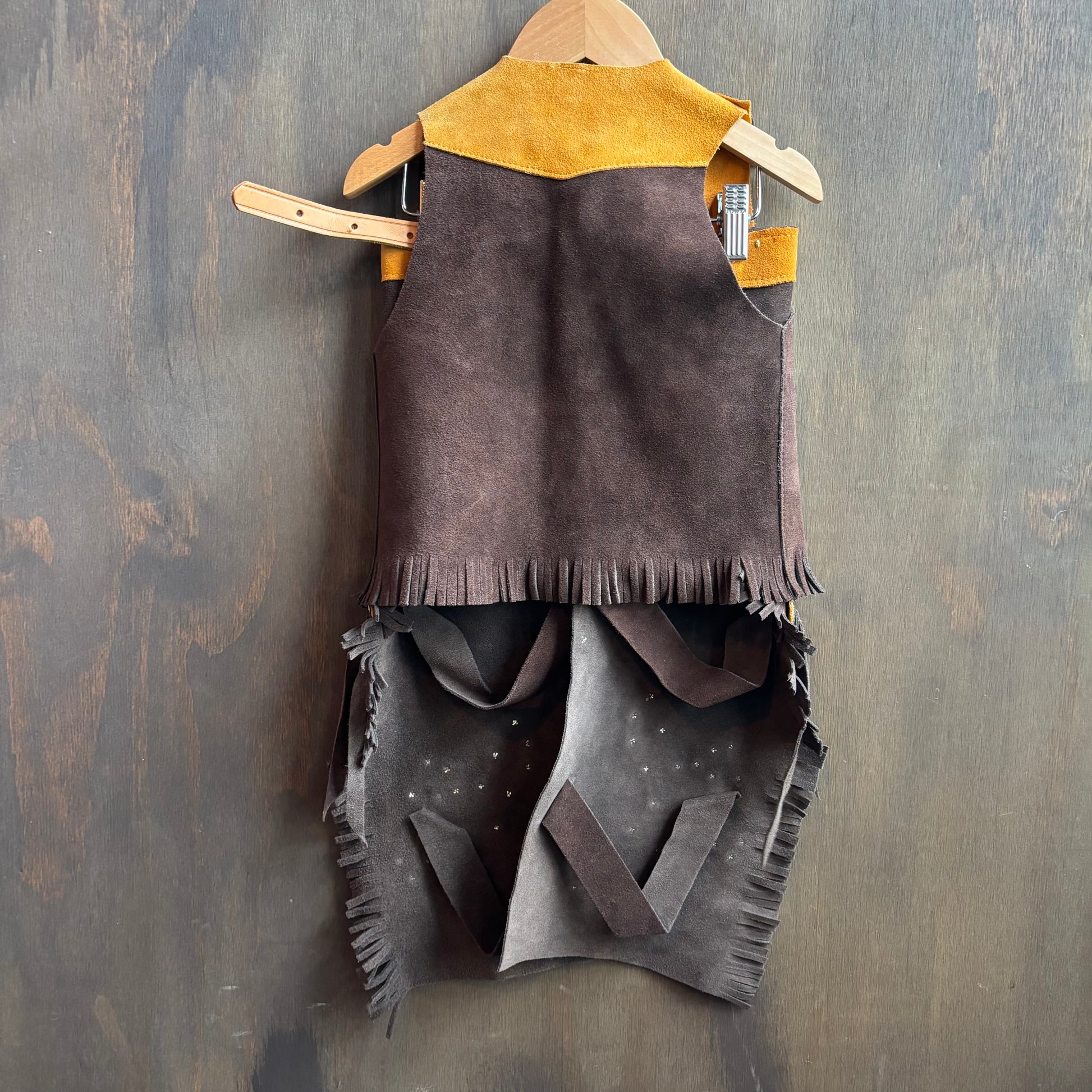 Super fun kids western set, including chaps and vest in all leather, size medium.