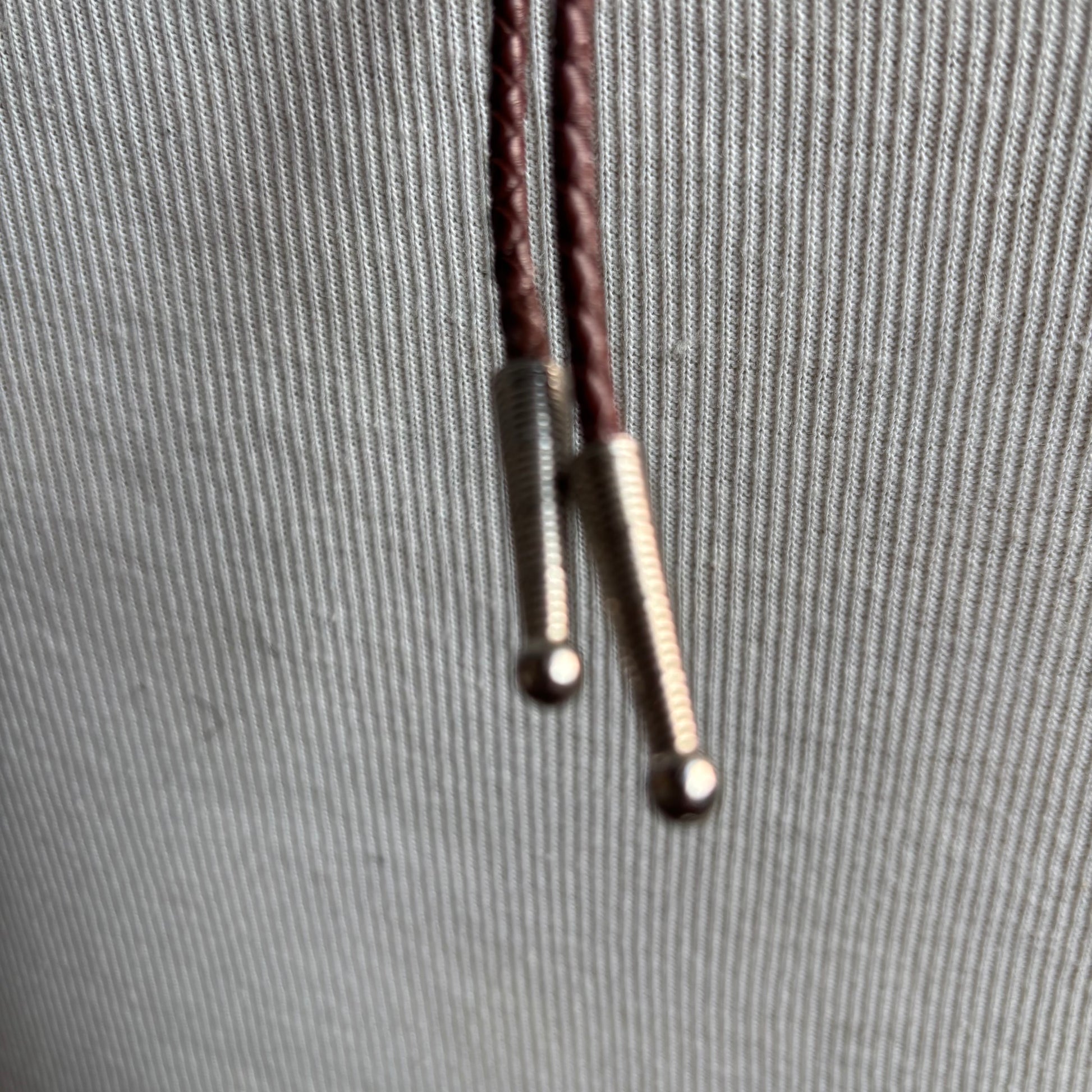 Good looking and simple polished brown stone bolo on brown tie with silver tone tips, has a nice neutral and earthy vibe to it.