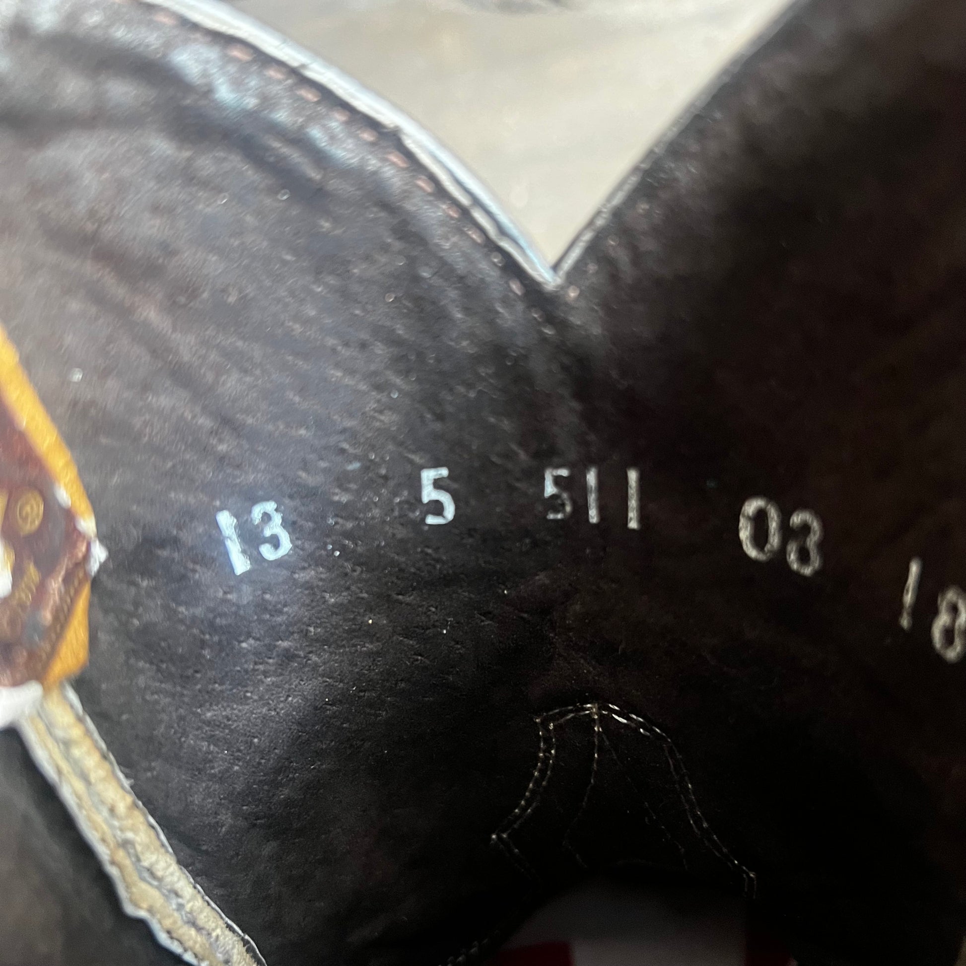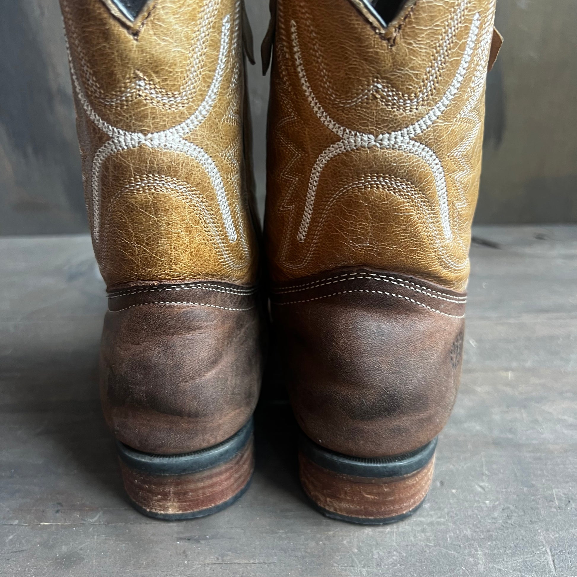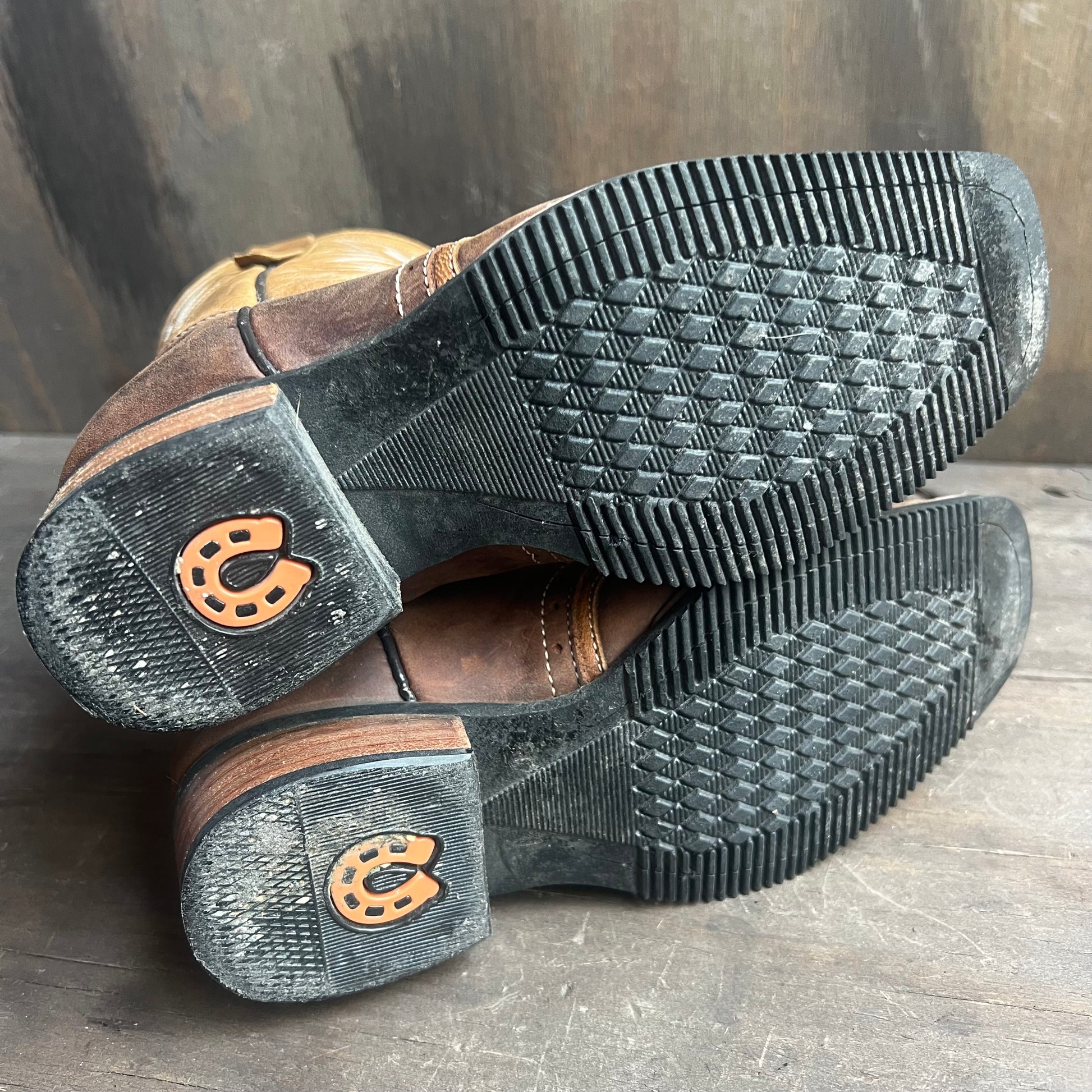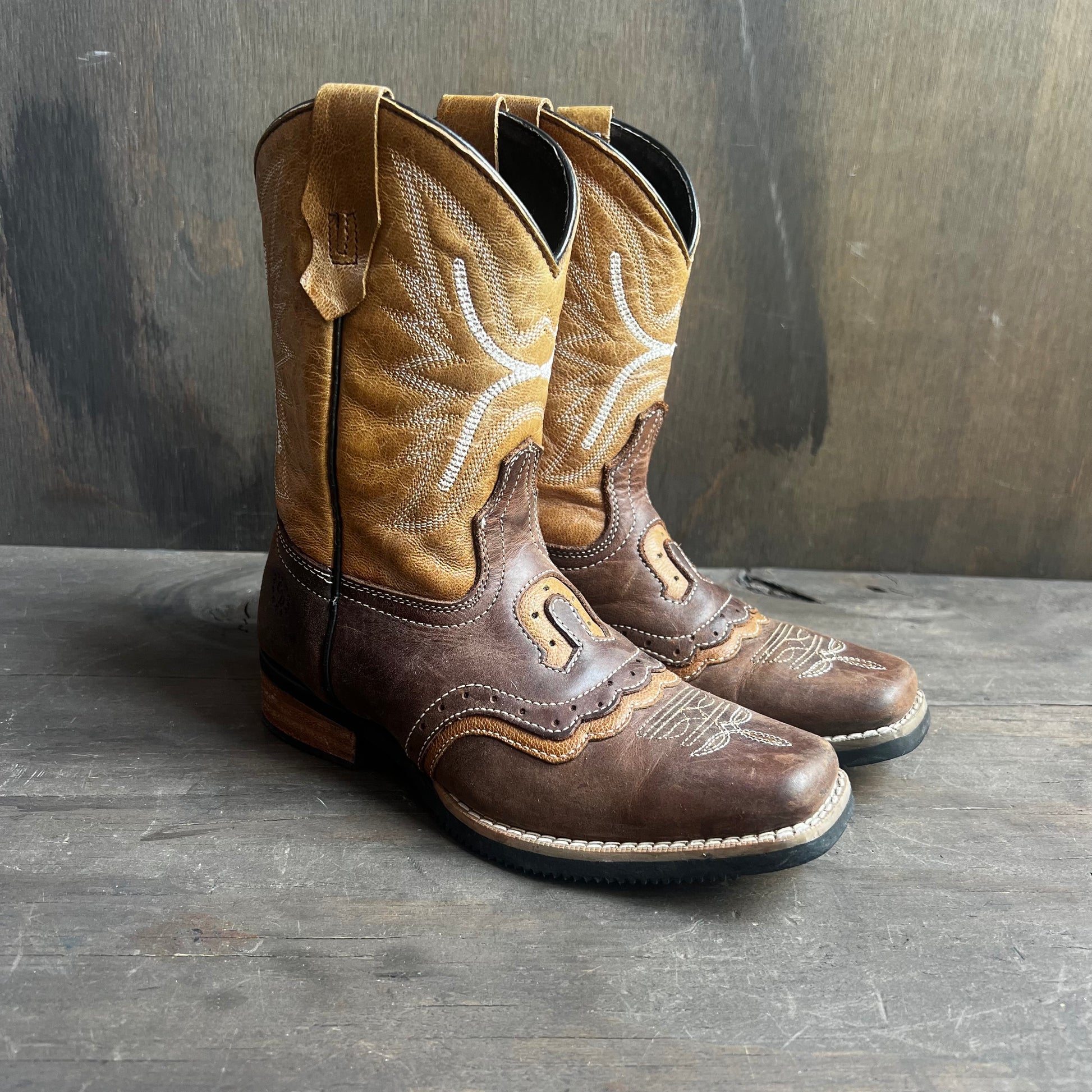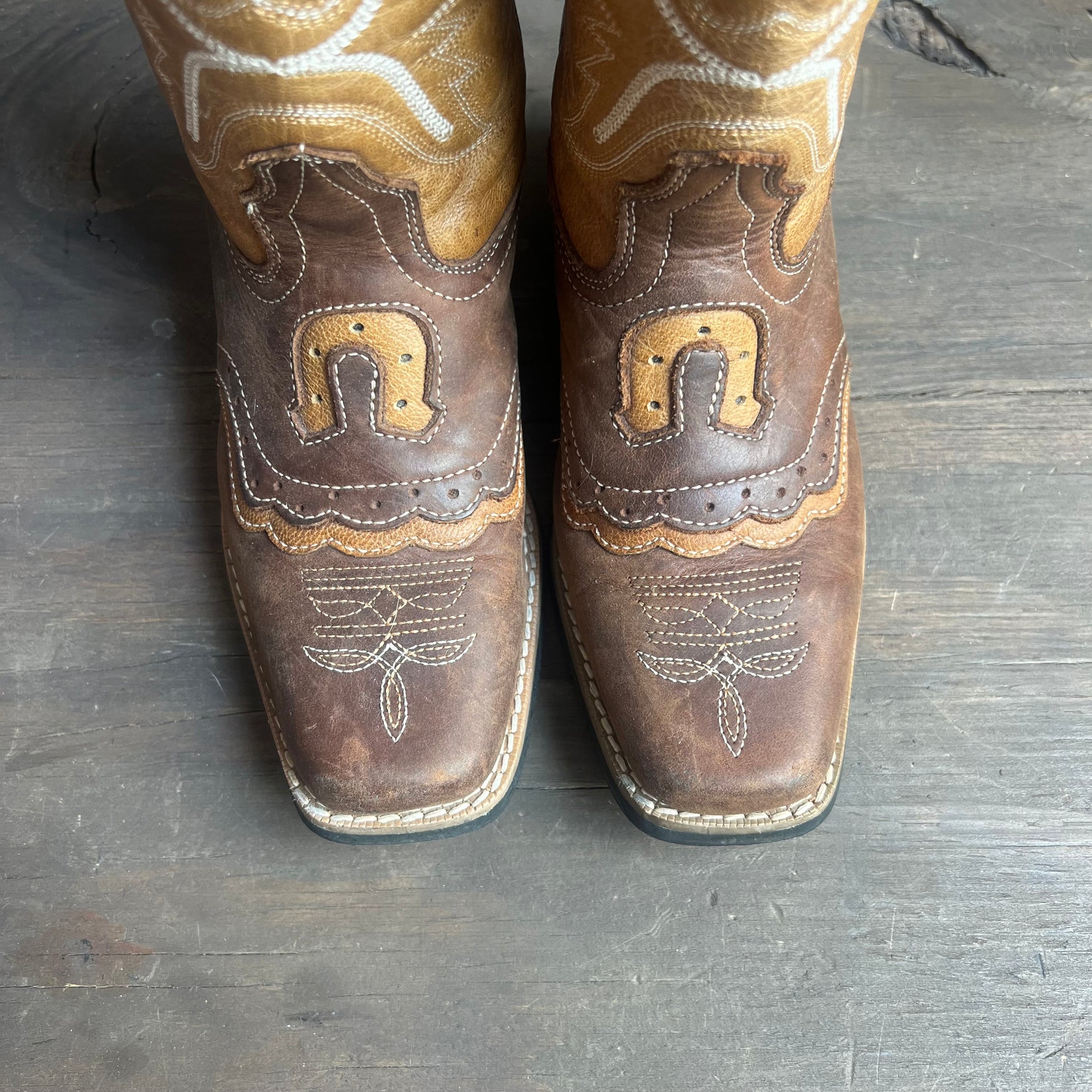 Adorable two-tone kids boots with a small leather horseshoe on the top of the vamp. These boots are in mint condition. Kids 13.