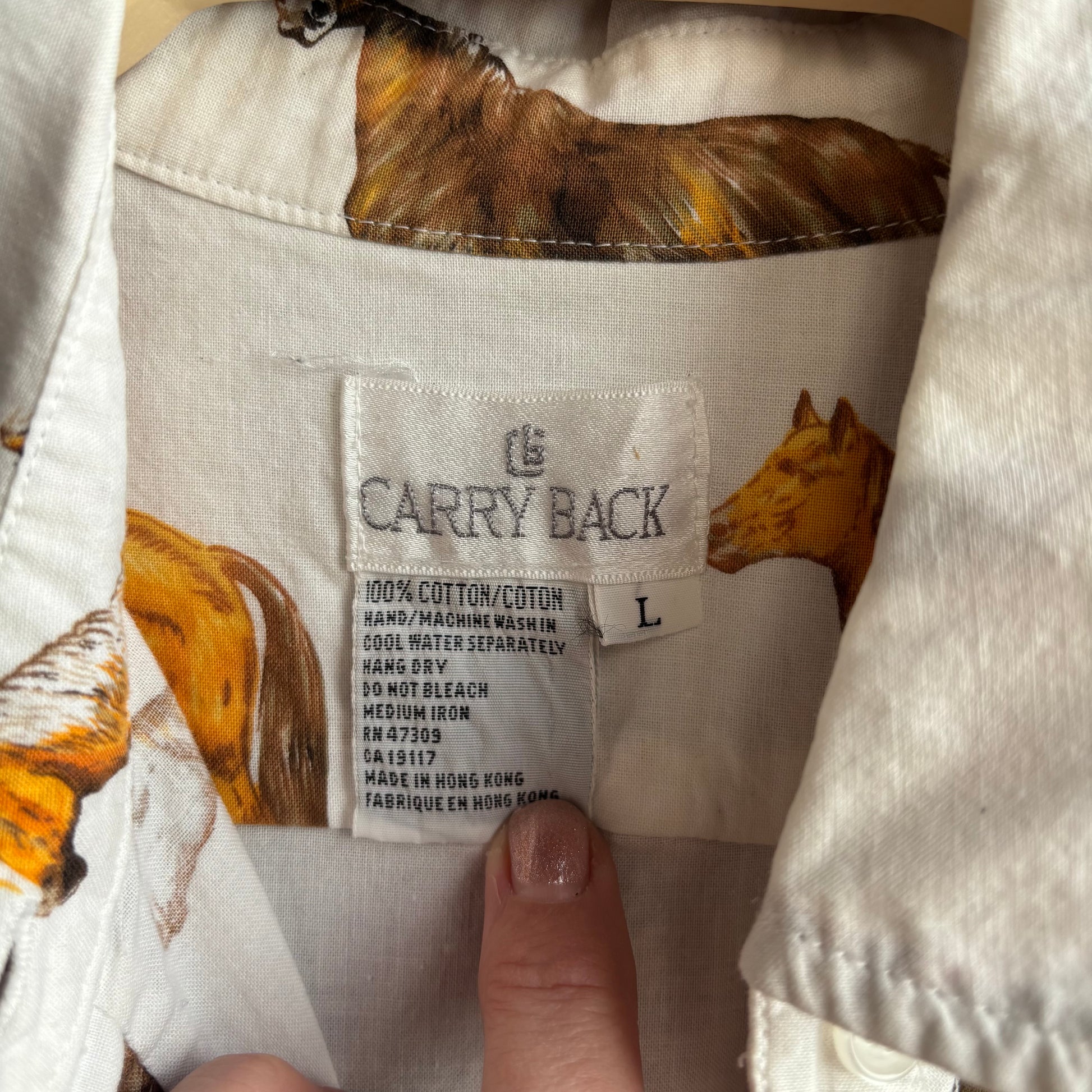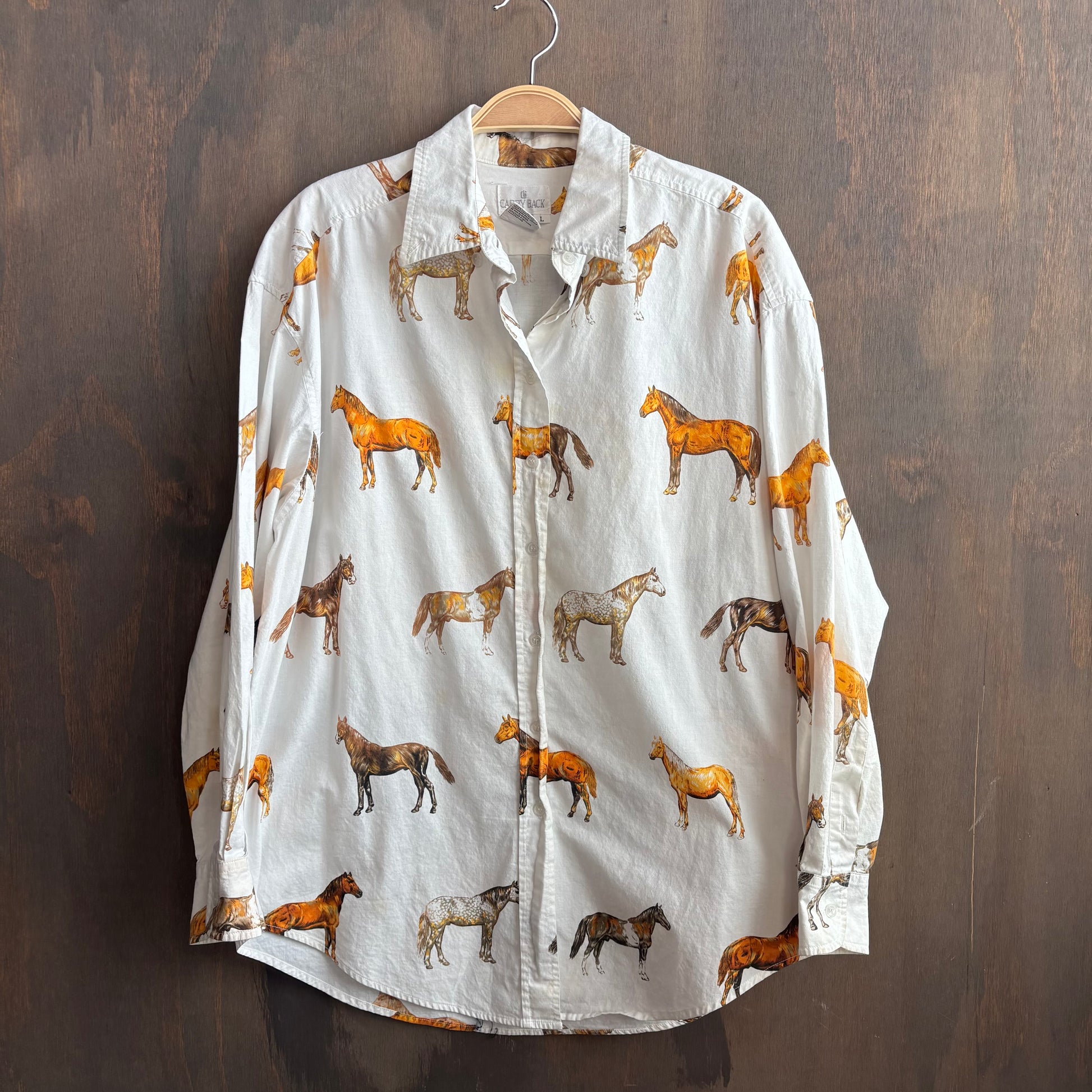Adorable 100% cotton Carry Black horse button up, some small stains - see photos, size L, priced as is