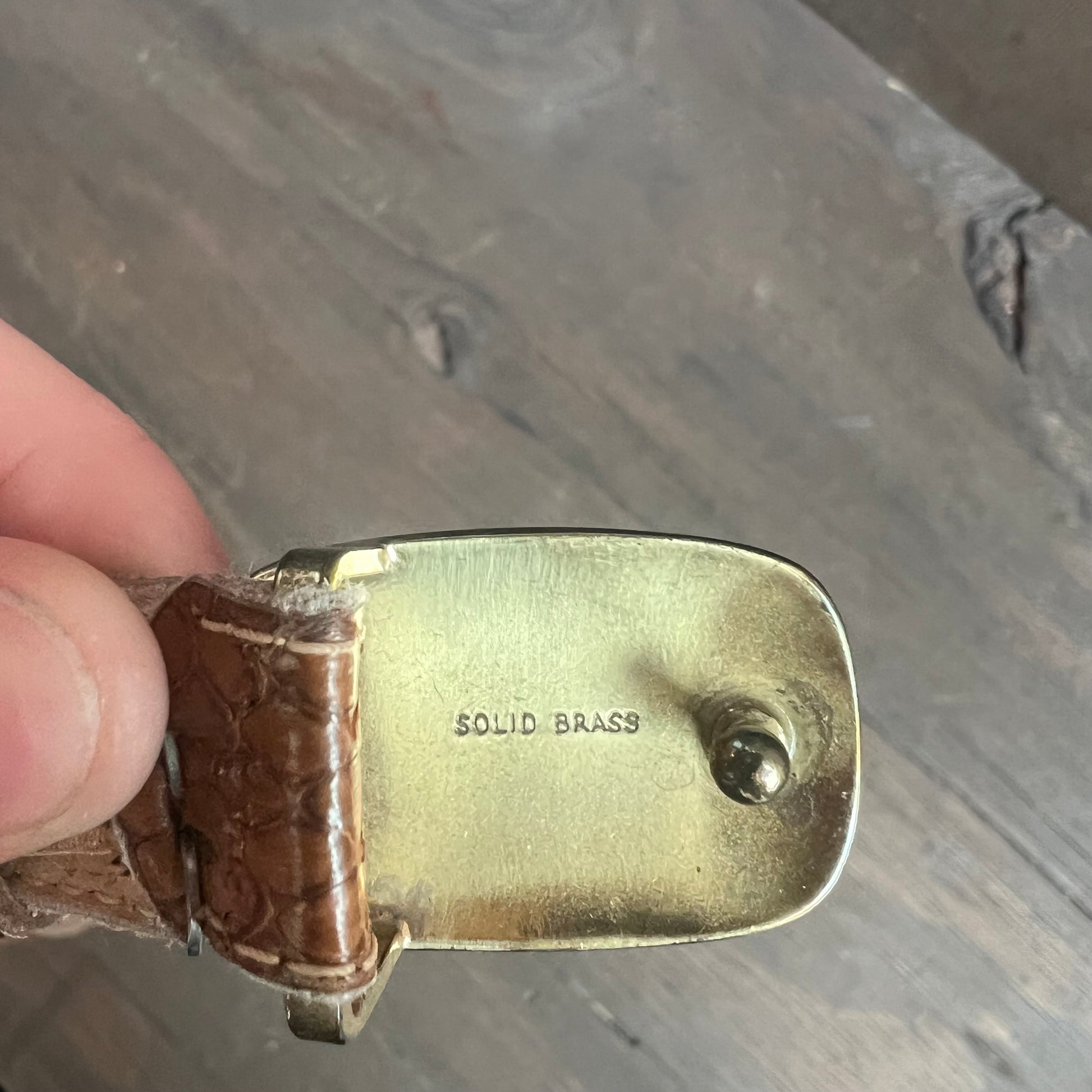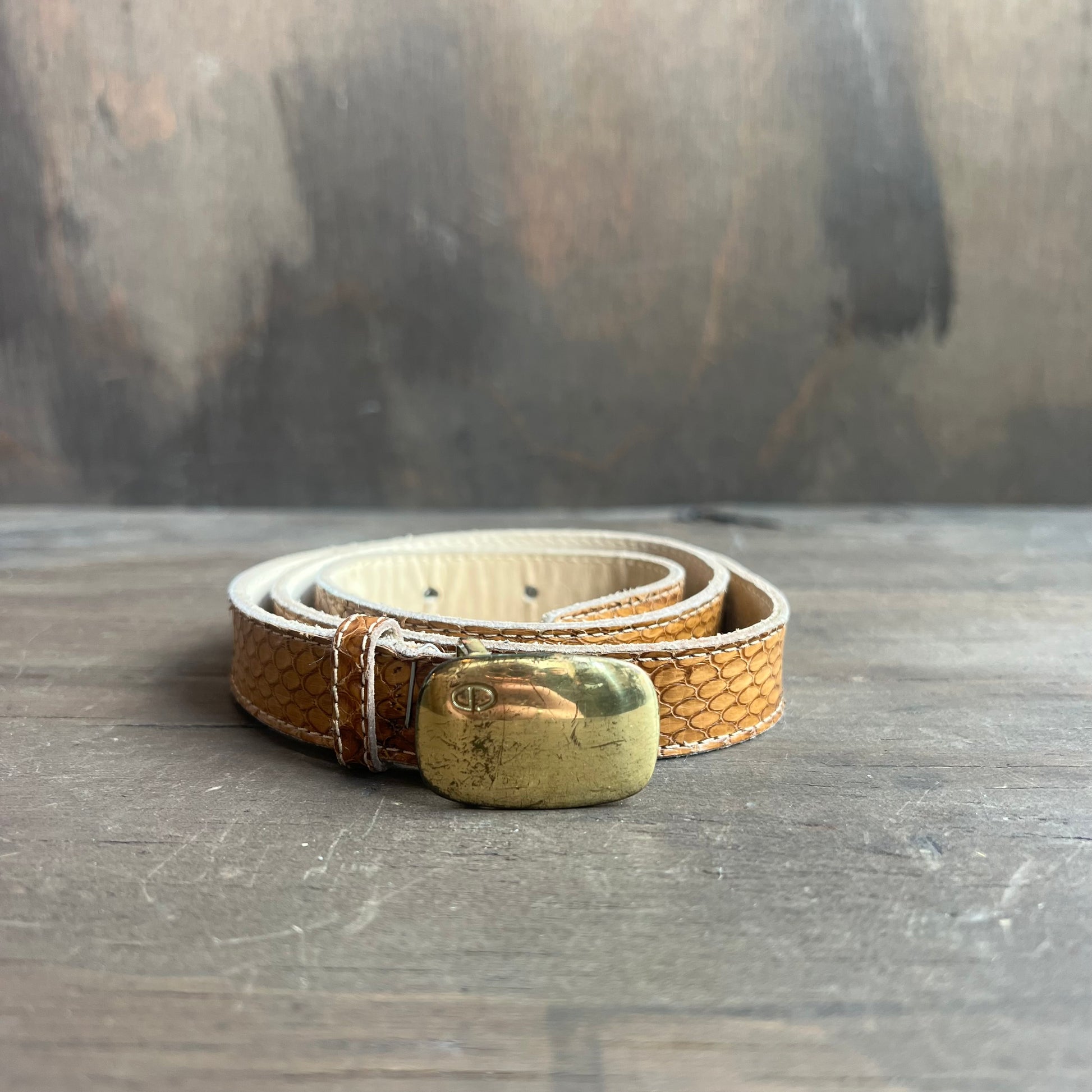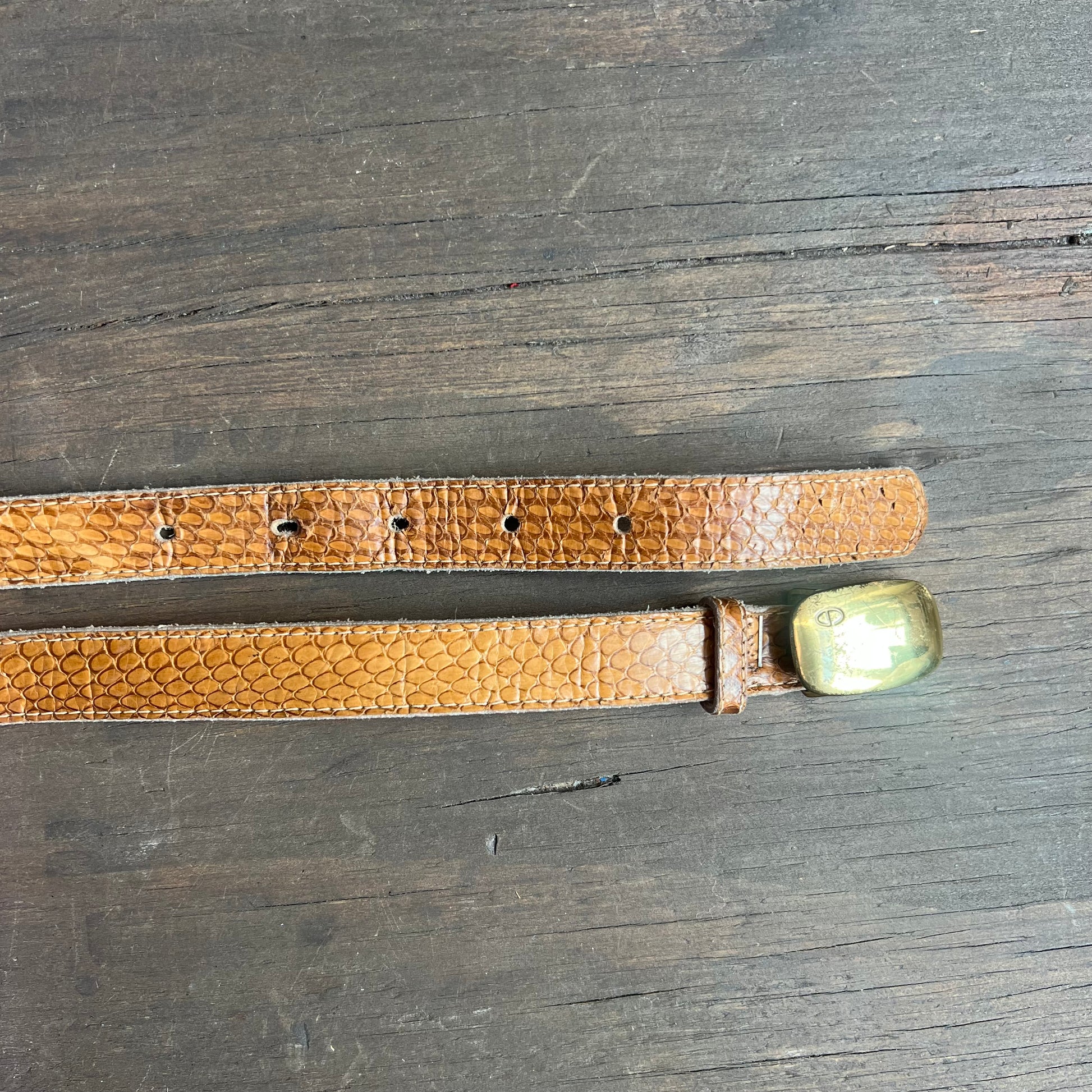 This belt is so classy and gorgeous, with a caramel colored snakeskin exterior. A sold brass buckle compliments the belt. Slightly worn from time, but adds to the vintage charm! Size M.