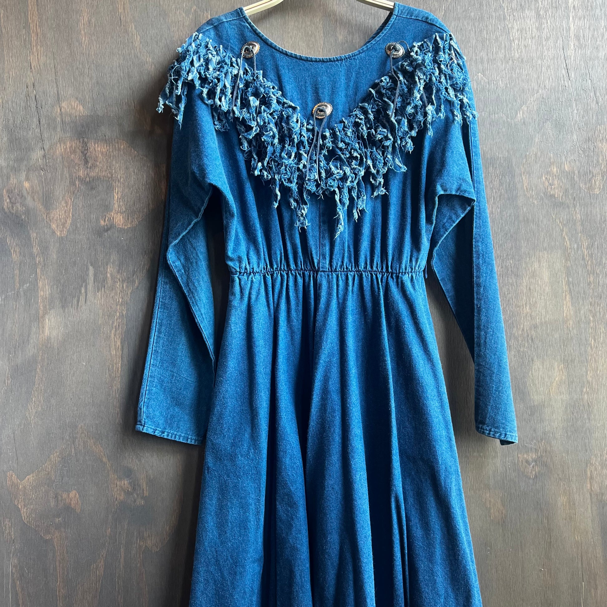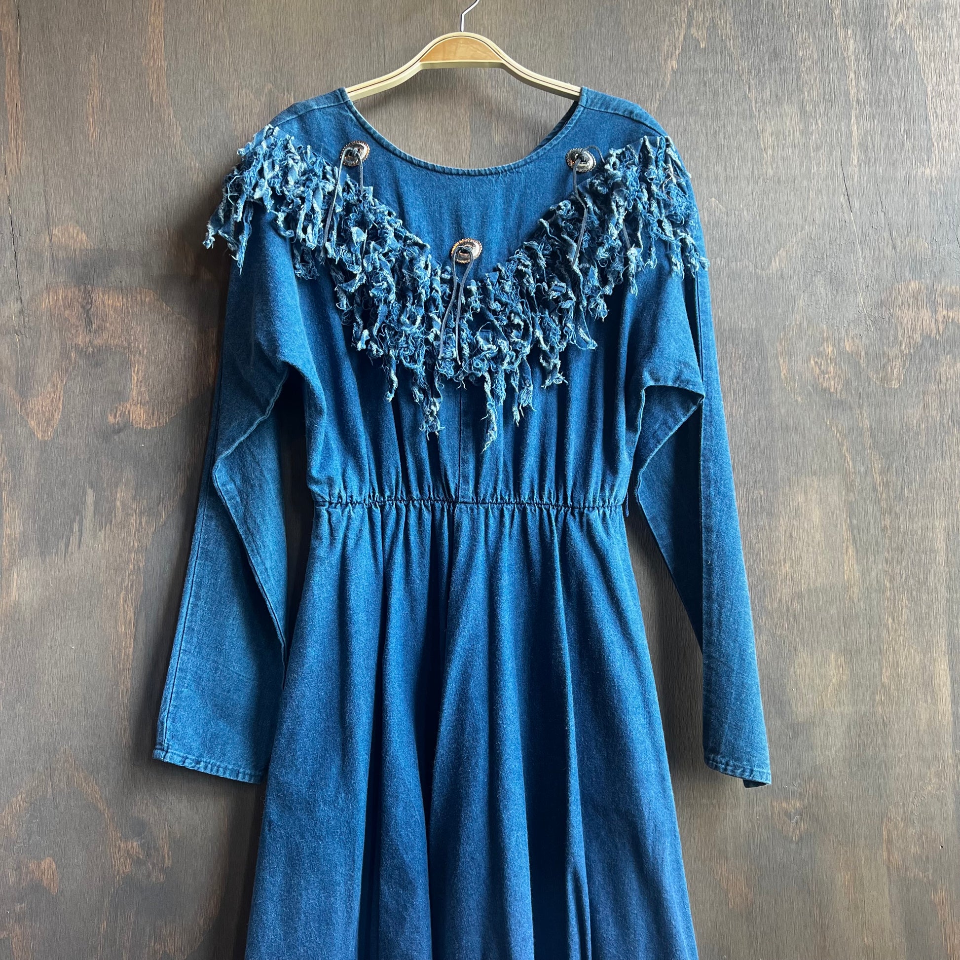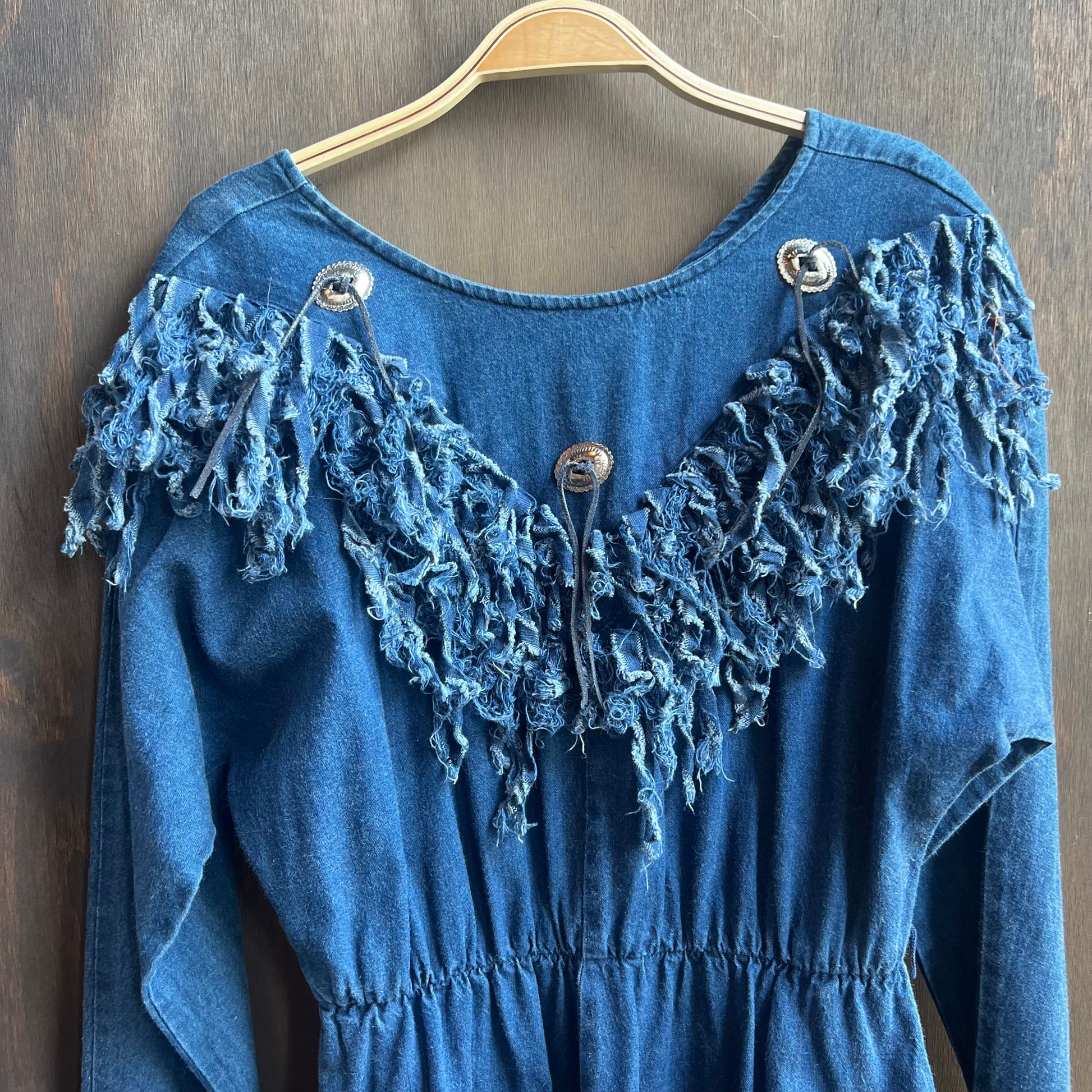 Gorgeous long sleeve denim dress with a denim ruffle chest and silver concho embellishments. In excellent condition. Fits size S.