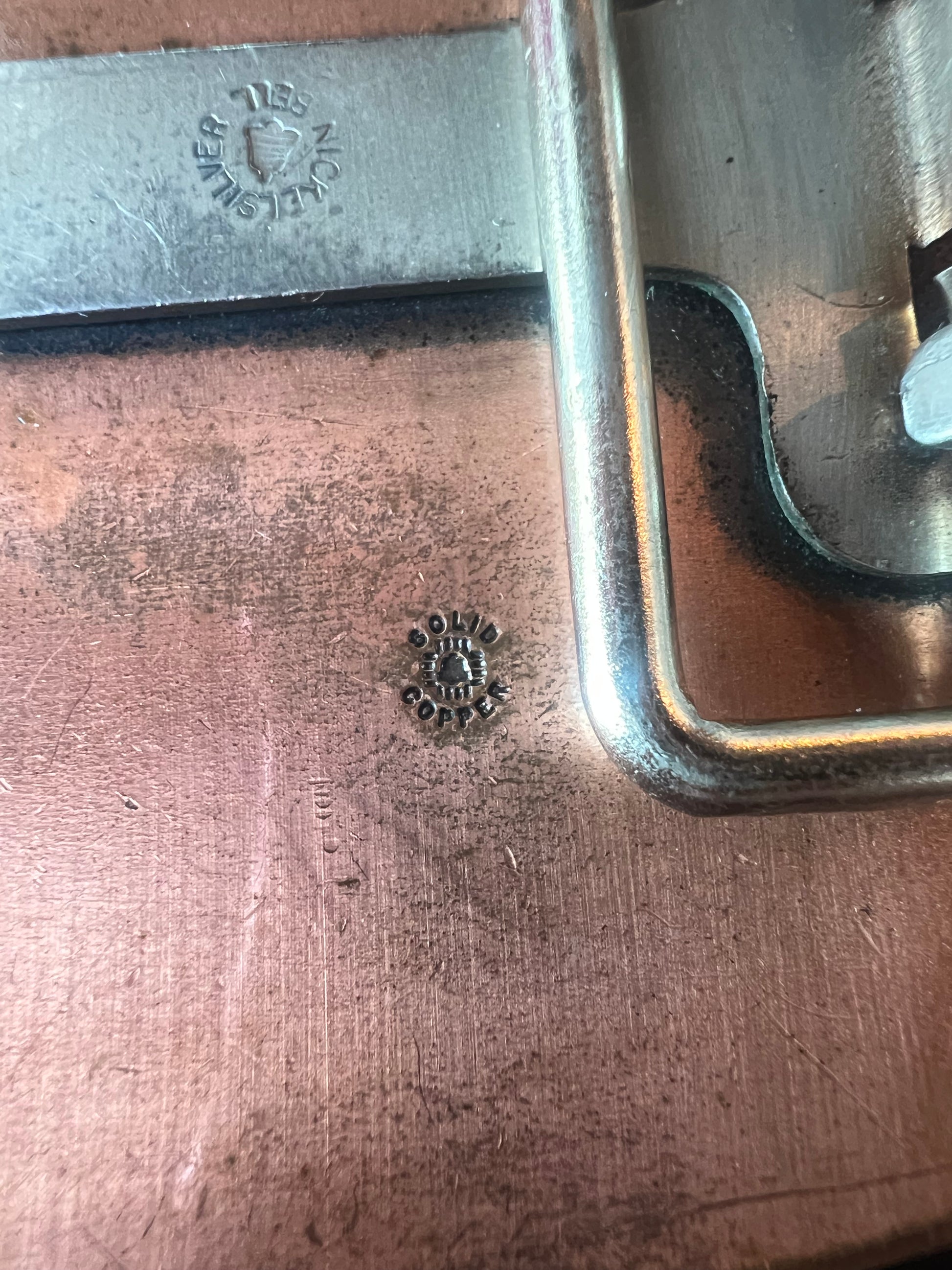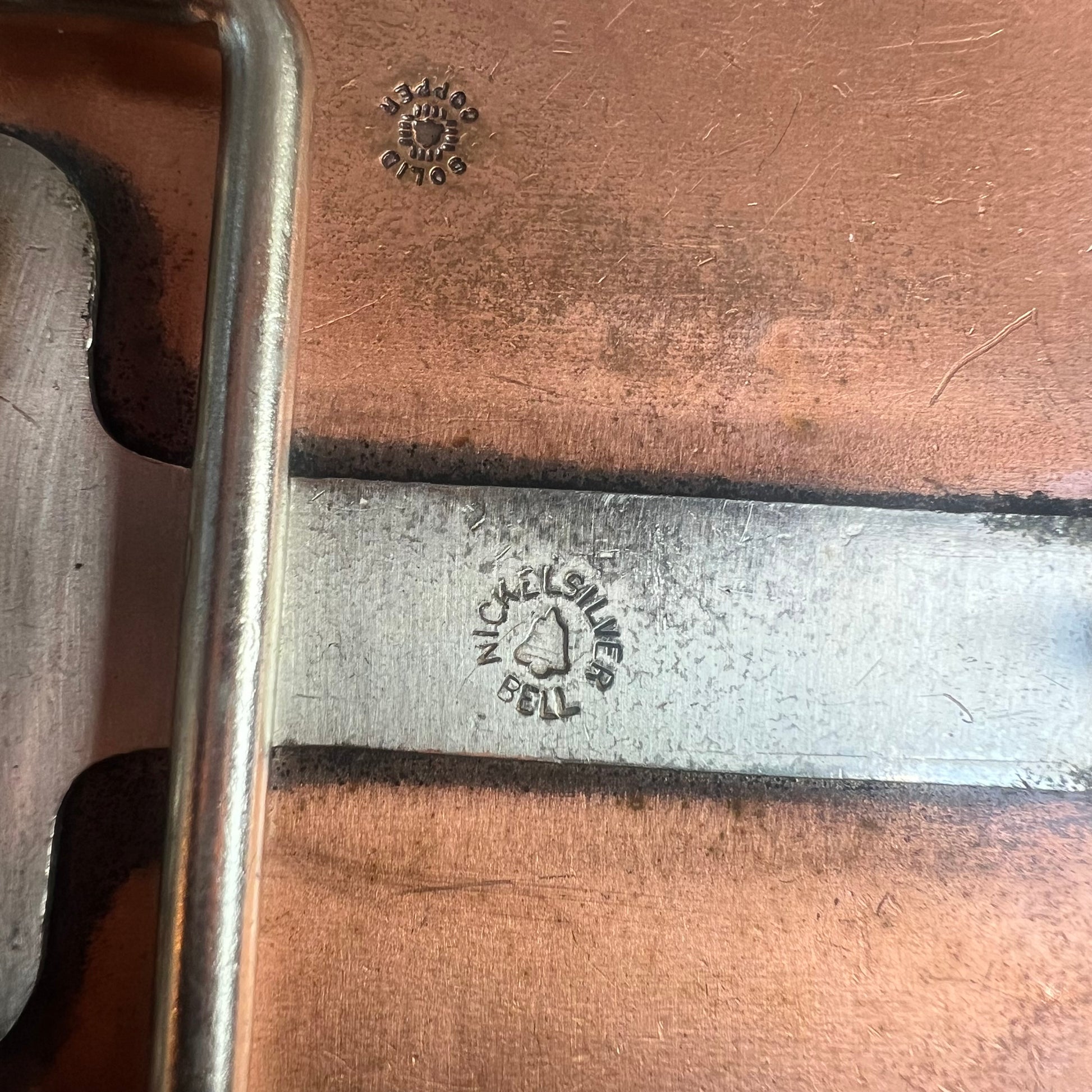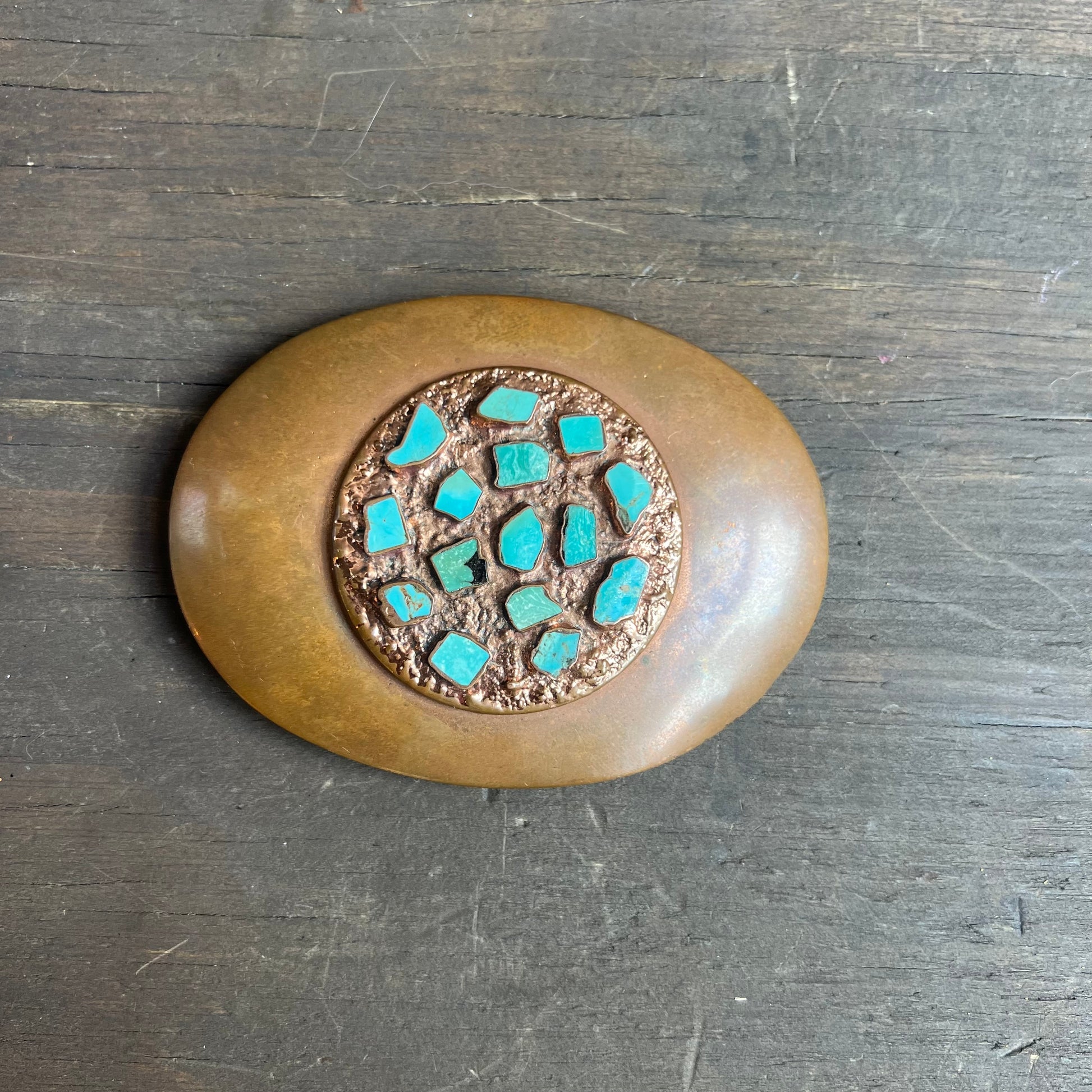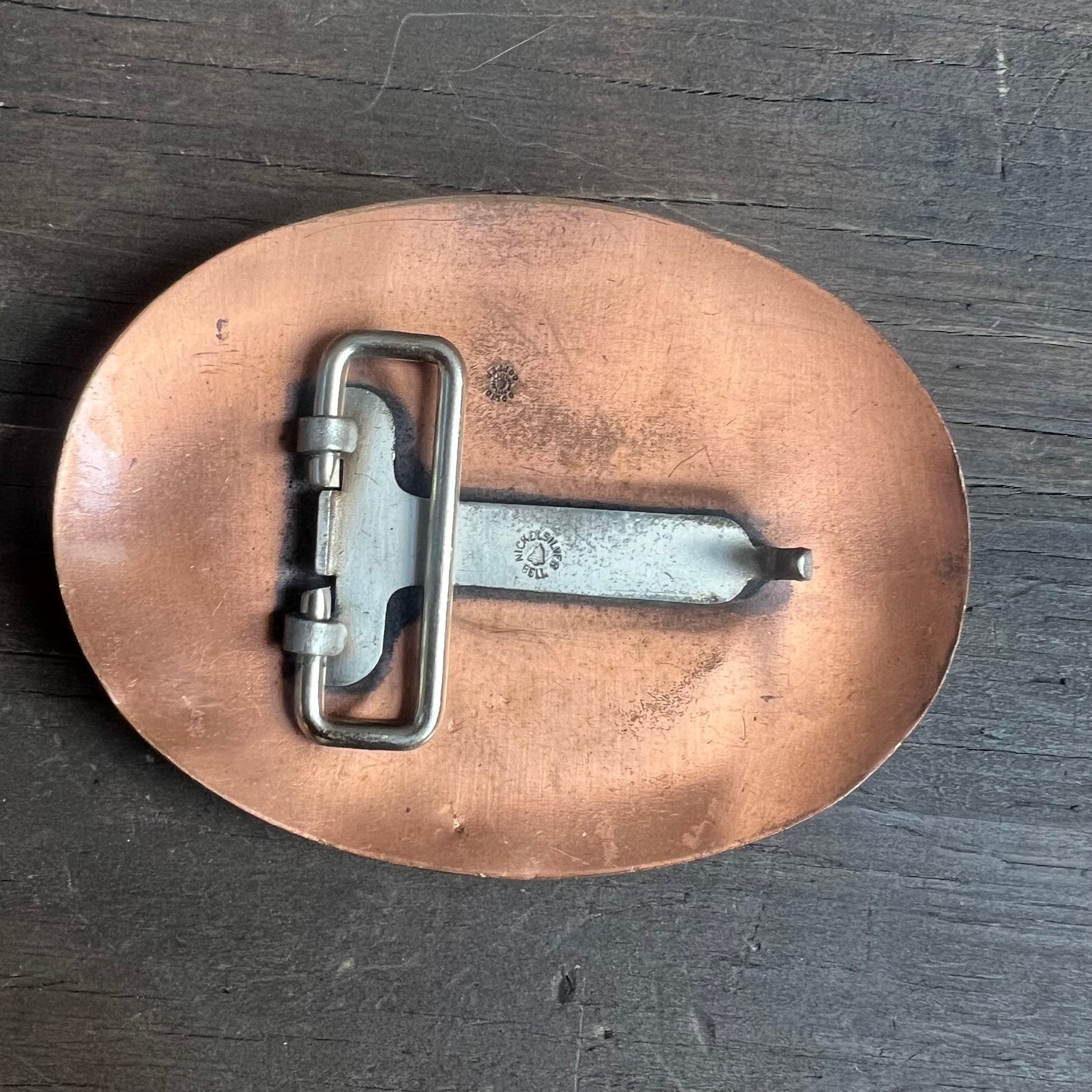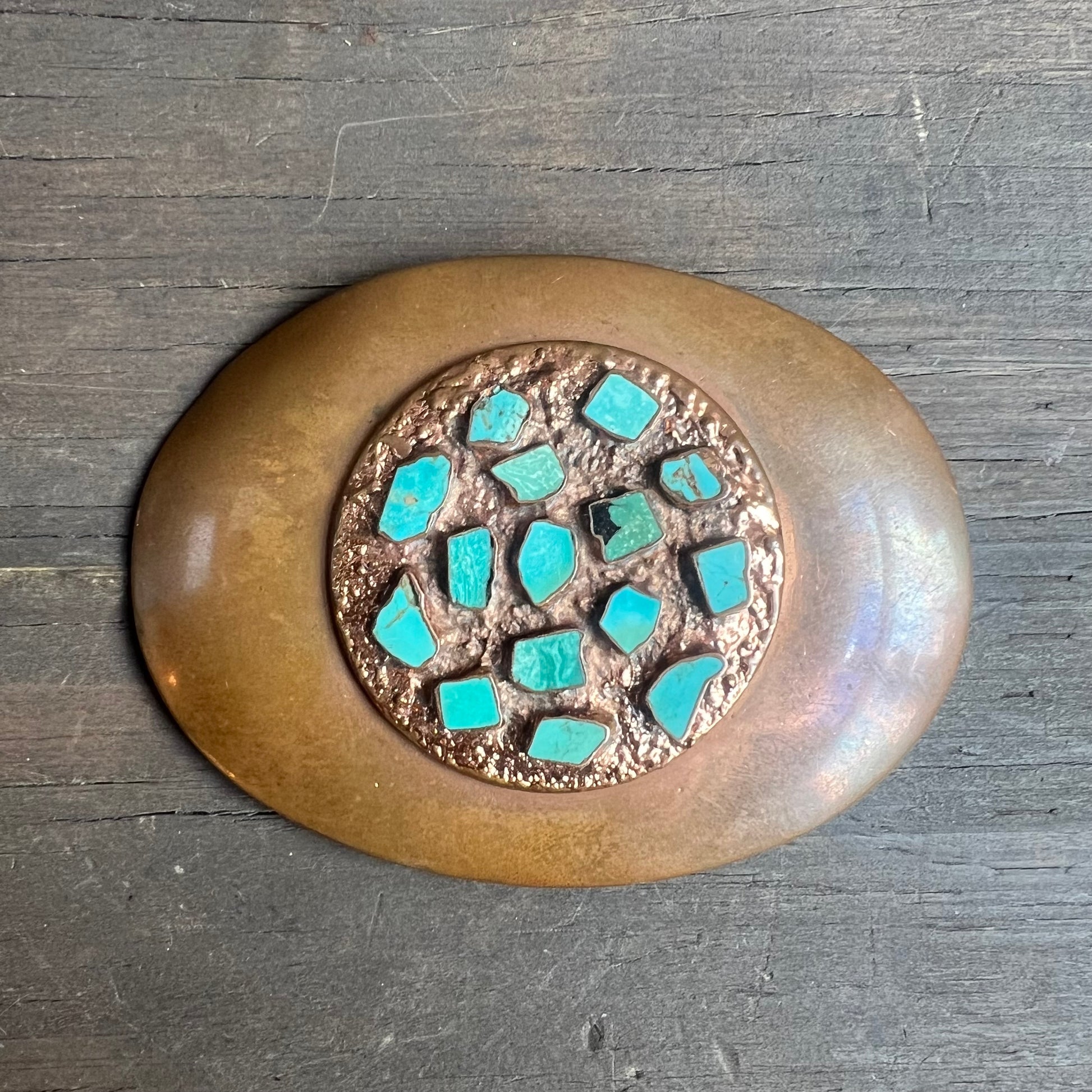 The coolest belt buckle made from a solid copper plate. The buckle is adorned with cut turquoise stones, and the fastener is nickel silver. In excellent condition and good quality. 4” across.