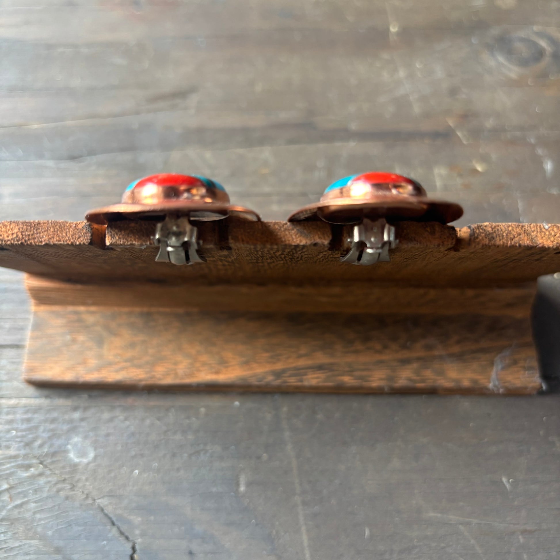 Oval shaped solid copper earrings made in the USA with faux resin stone details, giving a strong shoulder pads late 80's / early 90s vibes.