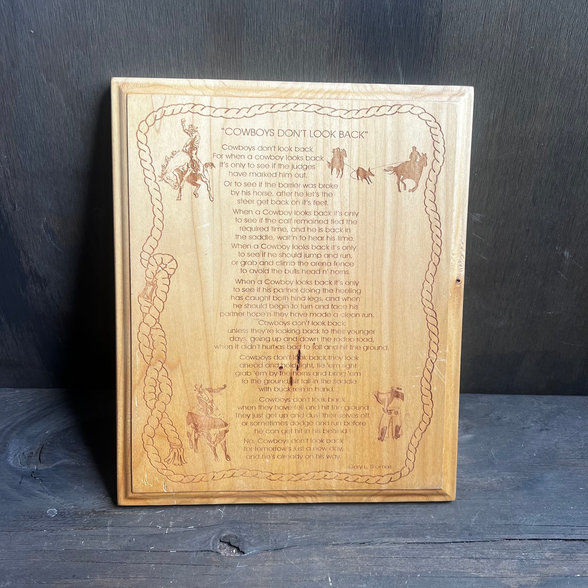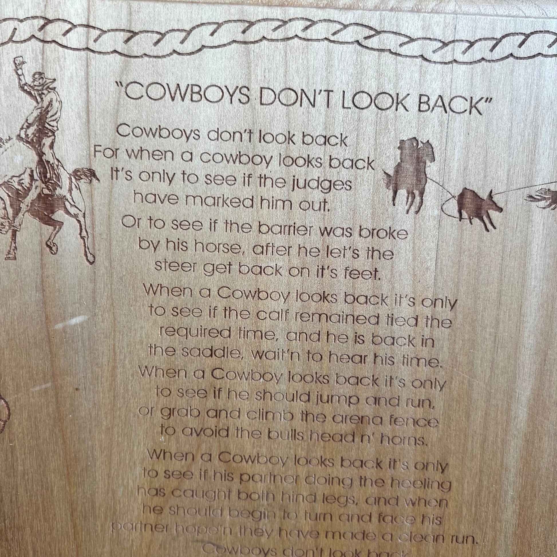 Wood plaque with the poem “Cowboys Don’t Look Back” etched into it. The back of the plaque says “Merry Christmas Bob Pickett.” In great condition, 12” by 10”.