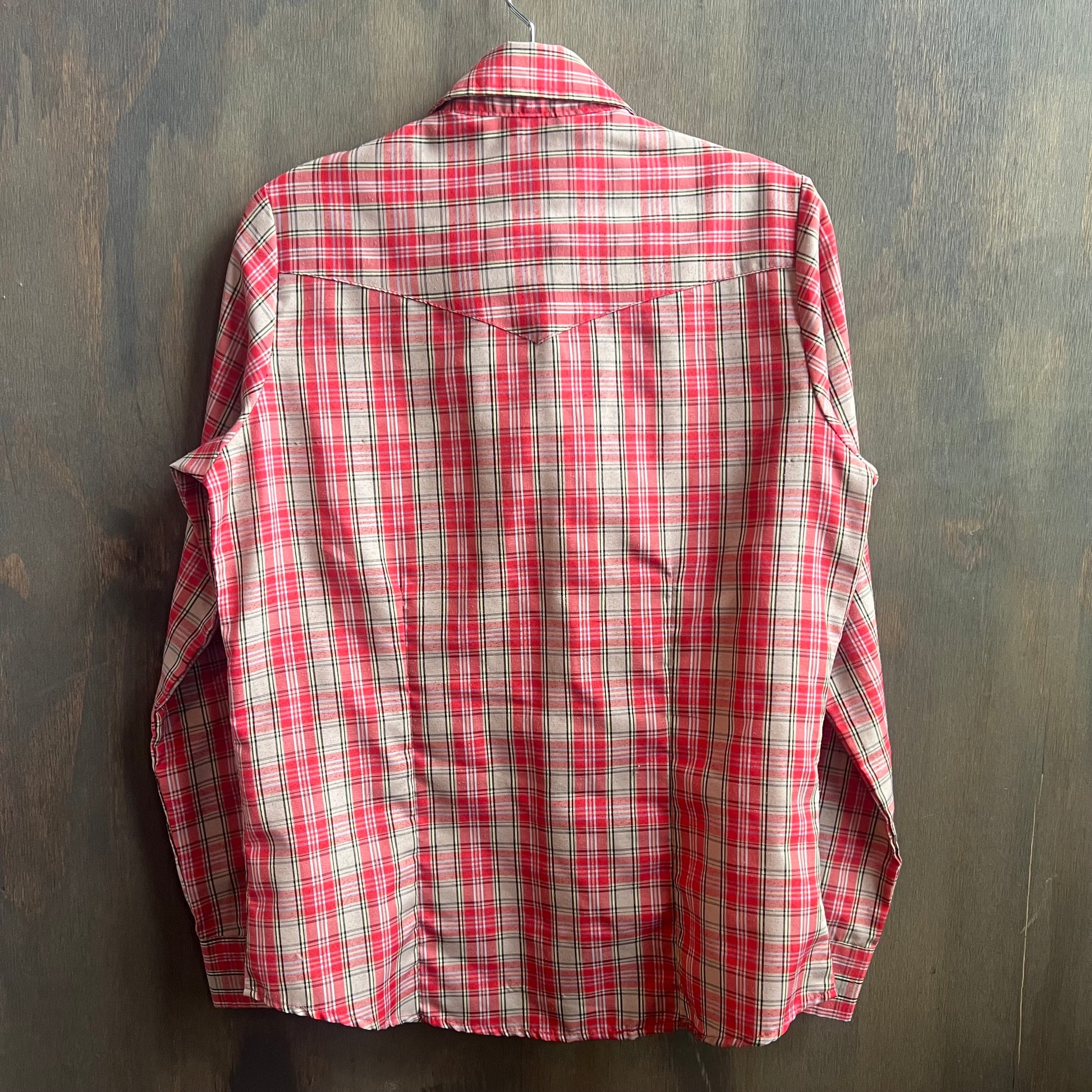 Stylish and lightweight pearl snap with a classic red plaid pattern. Features two small from pockets. In good condition, left sleeve is missing the top of the snap but it still closes. Size L.