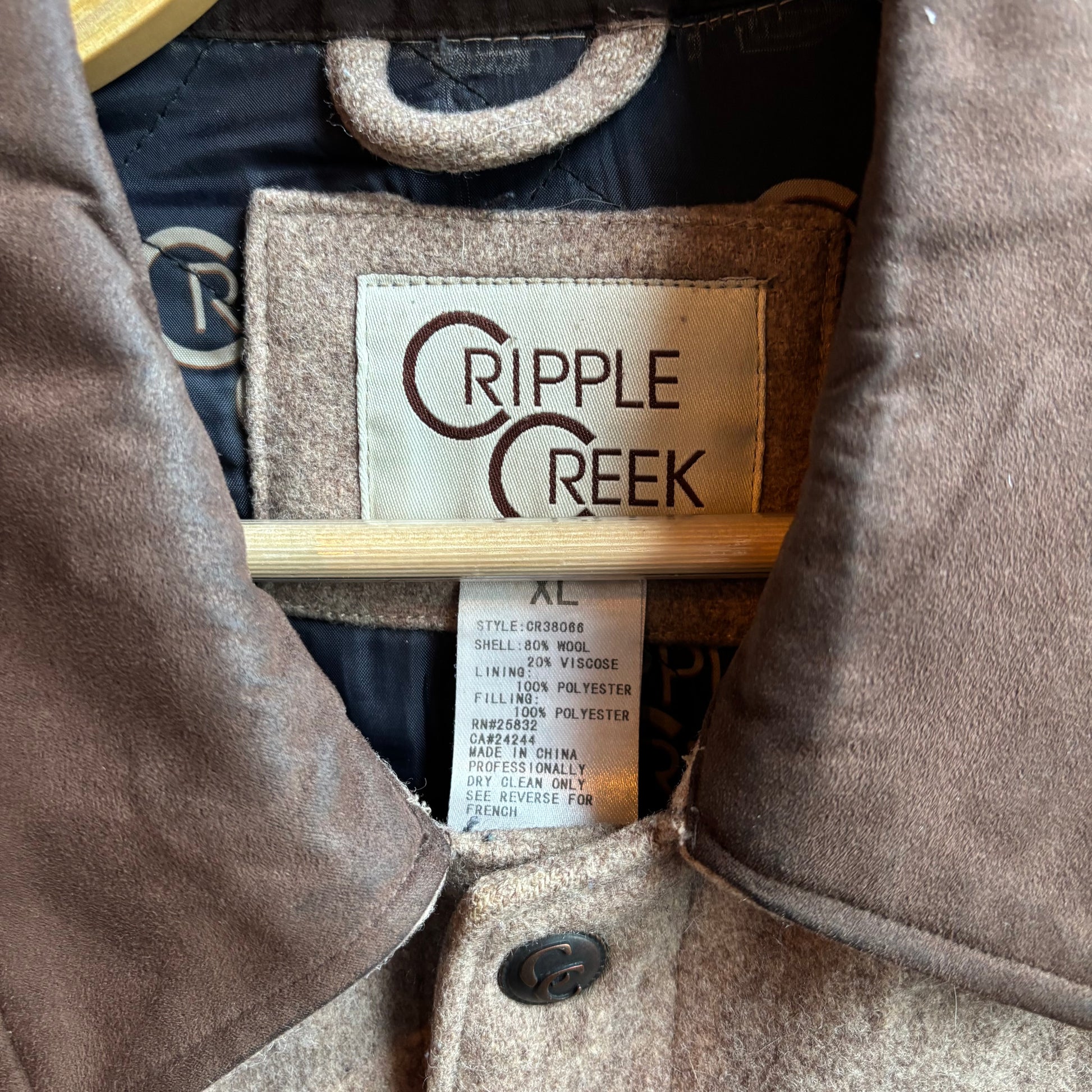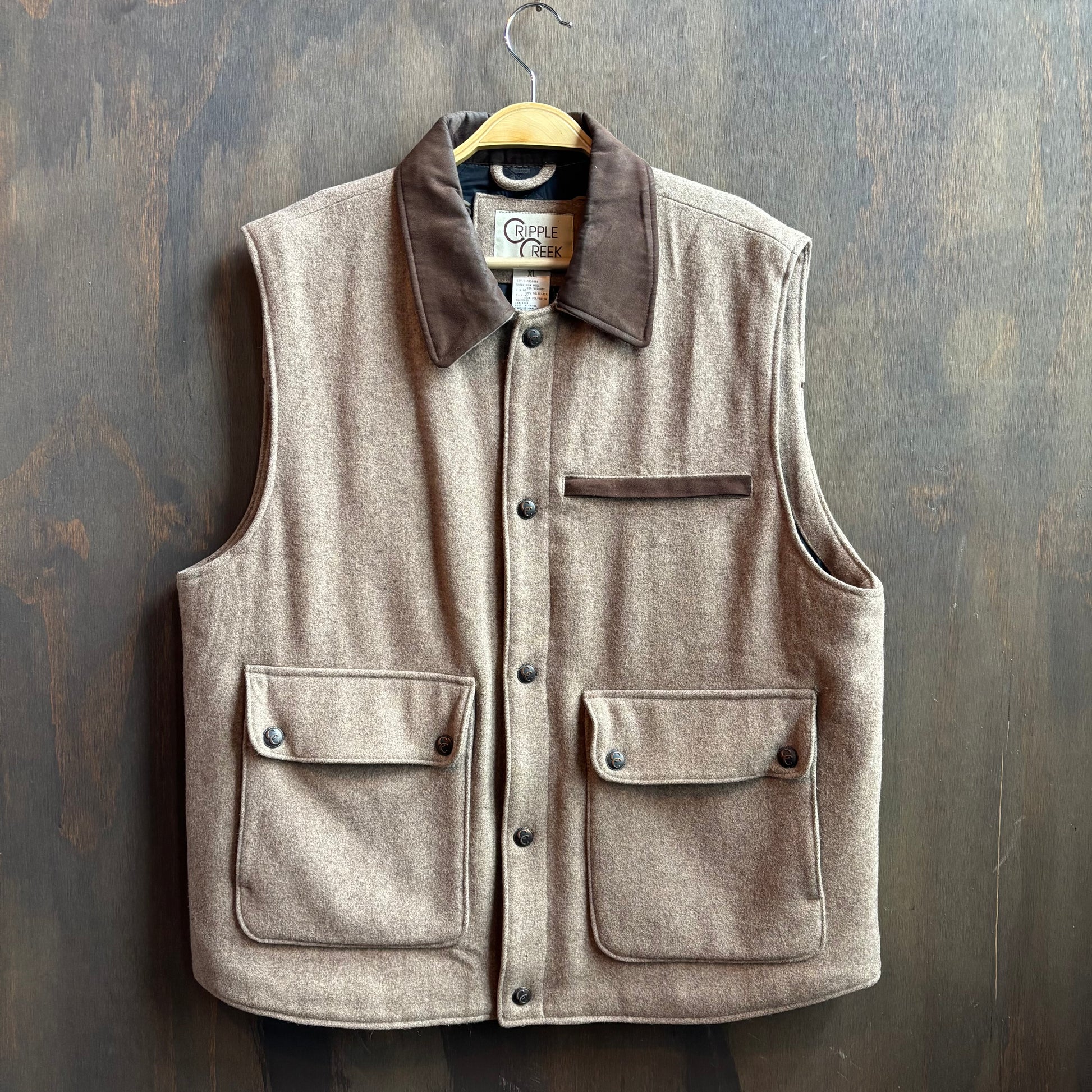 Handsome beige Cripple Creek wool vest with brown suede details with large pockets, fully lined, great condition, size XL