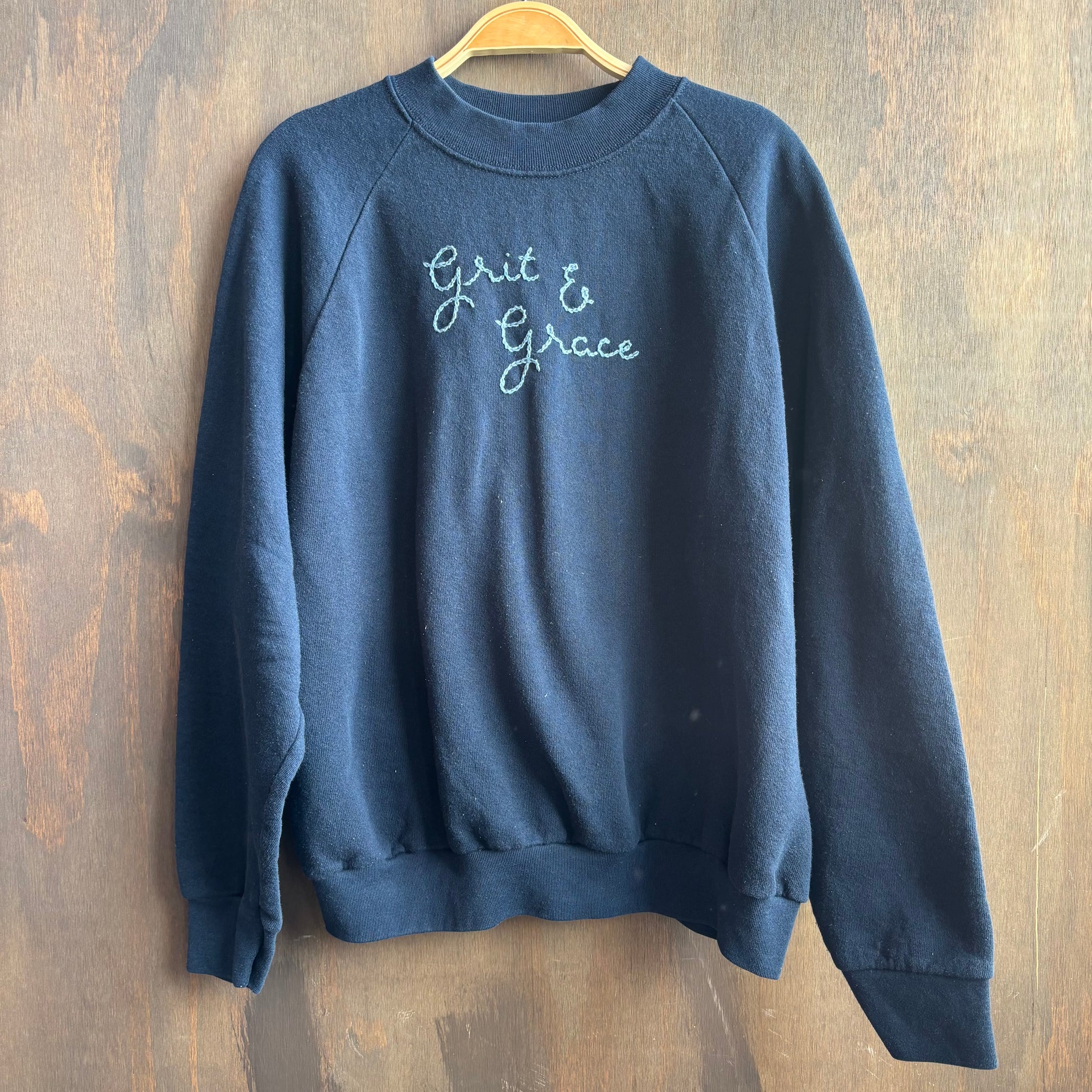 Custom navy "Grit & Grace" sweatshirt with hand done chain stitch embroidery, size XL