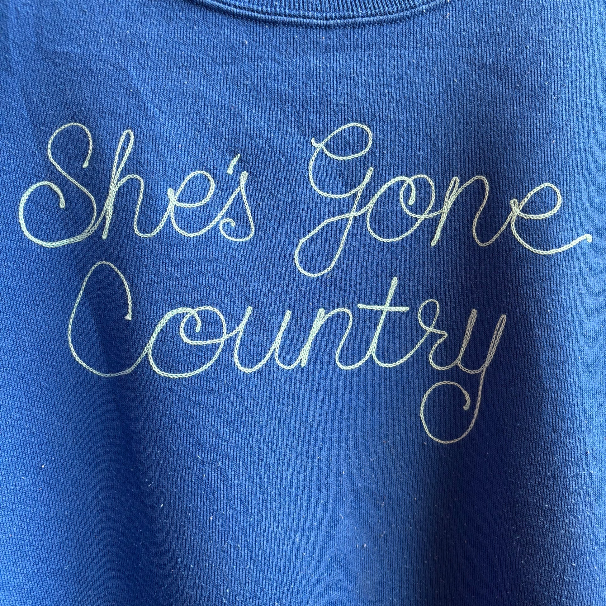 Custom blue "She's Gone Country" sweatshirt with chain stitch embroidery, no tag but fits like a size XL