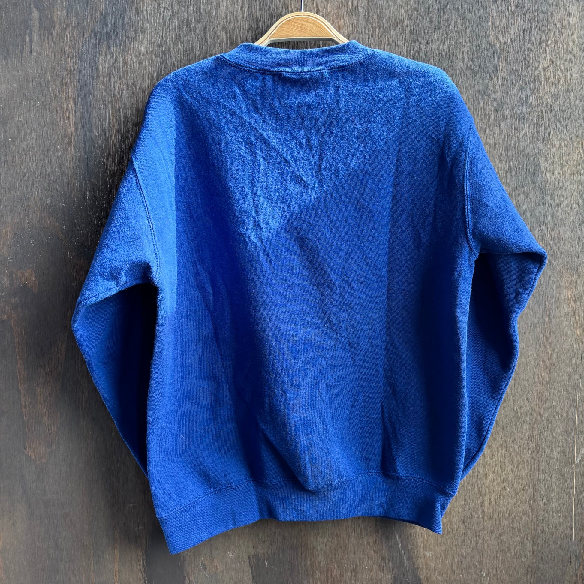 Custom blue "Trailbound" sweatshirt featuring chain-stitching by Denver artist Psychic Stitch, size XL