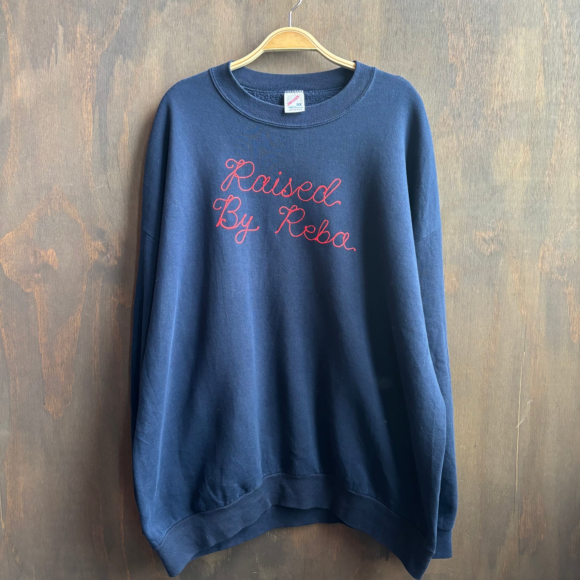 Custom navy "Raised by Reba" sweatshirt with chain stitch embroidery, size 3X