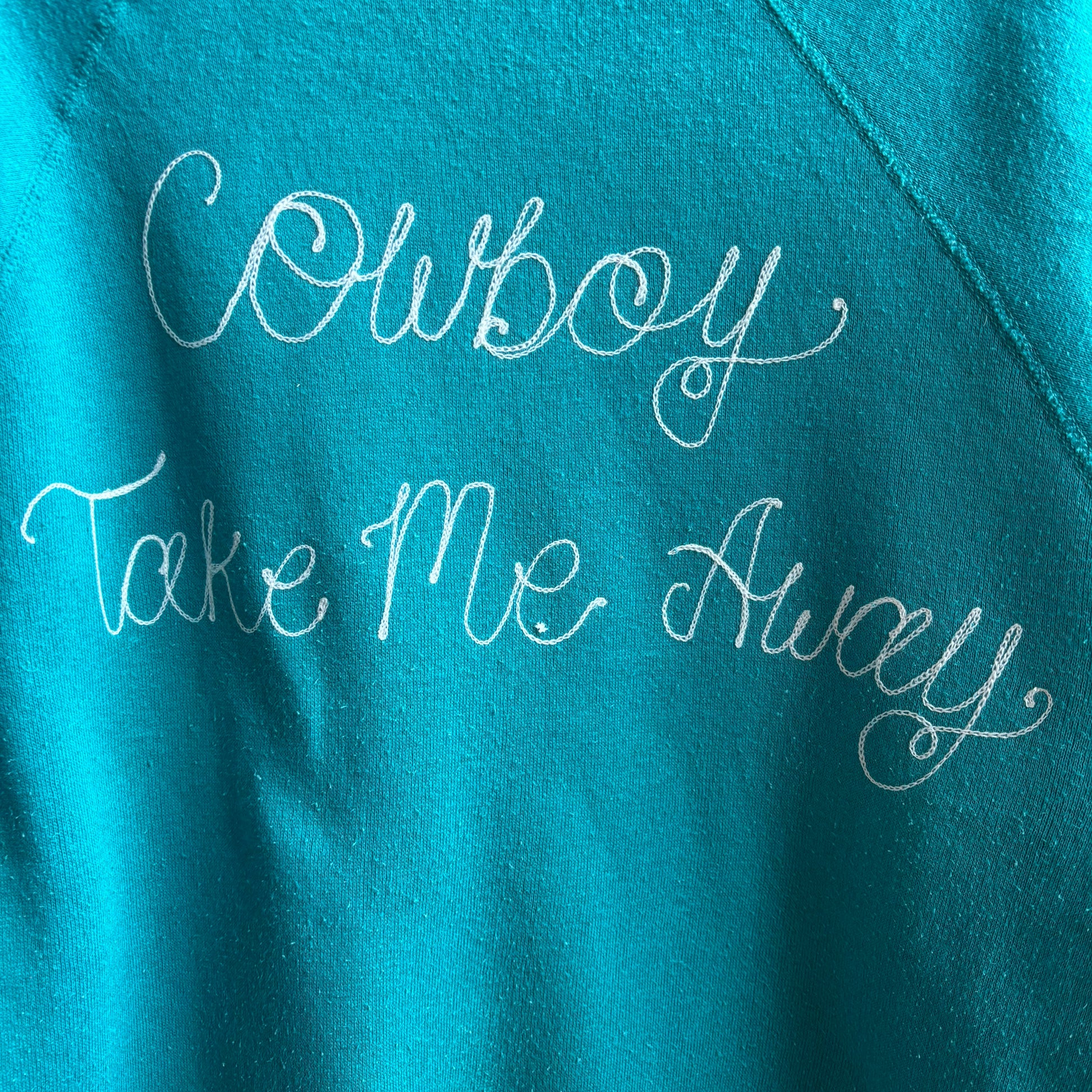 Custom teal "Cowboy Take Me Away" sweatshirt with chain stitch embroidery, size XL