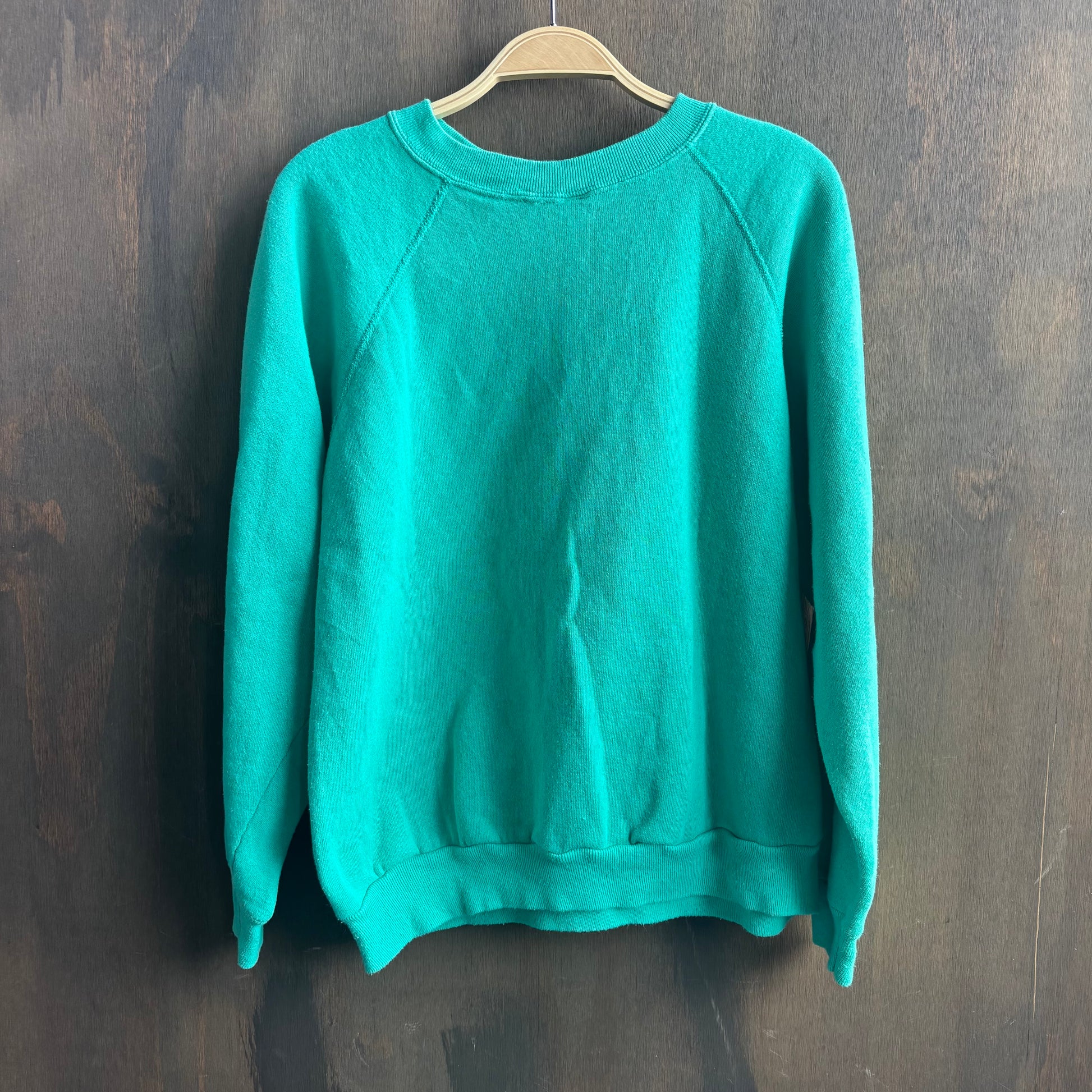 Custom teal "Hitched" sweatshirt with chain stitch embroidery, no size tag but fits like a M/L