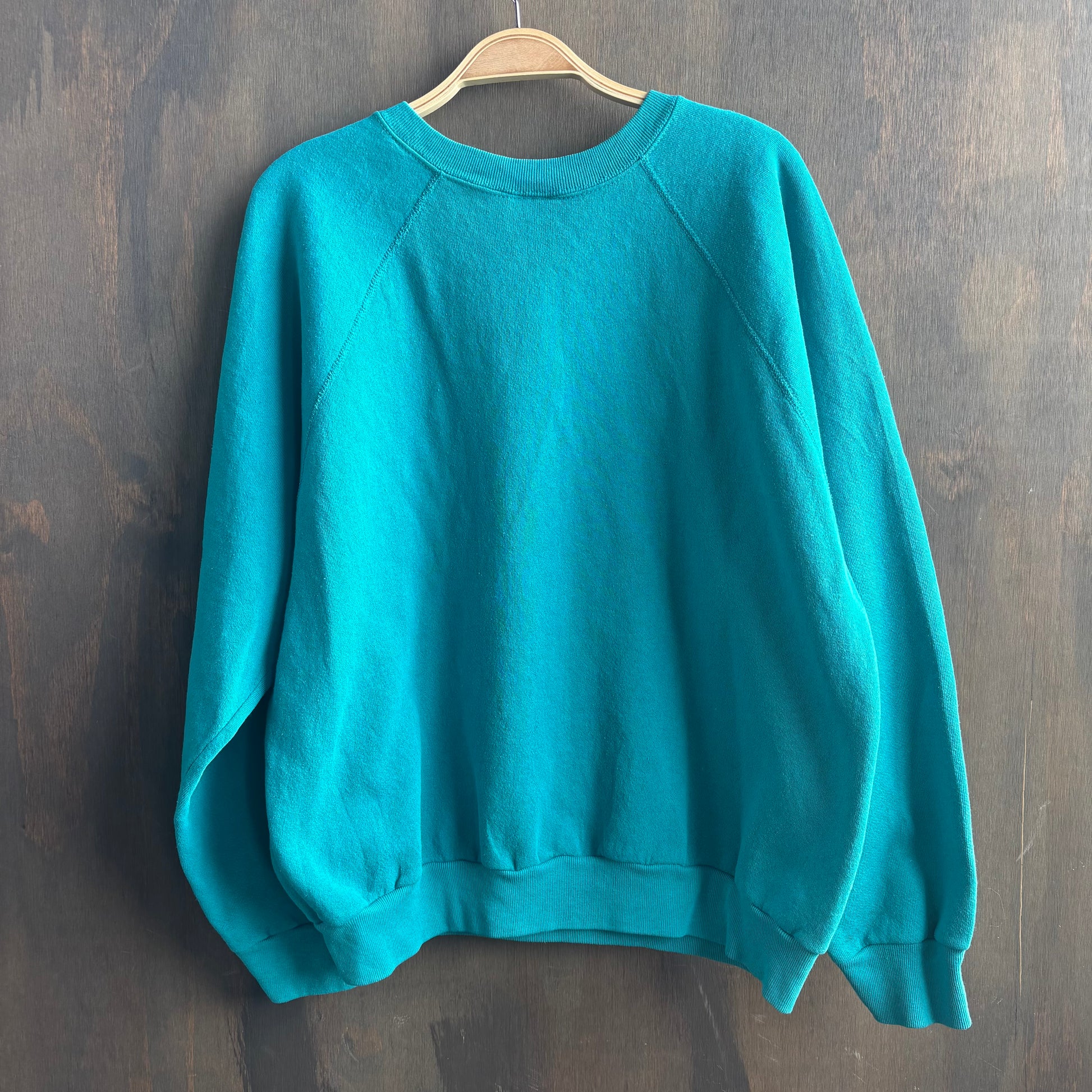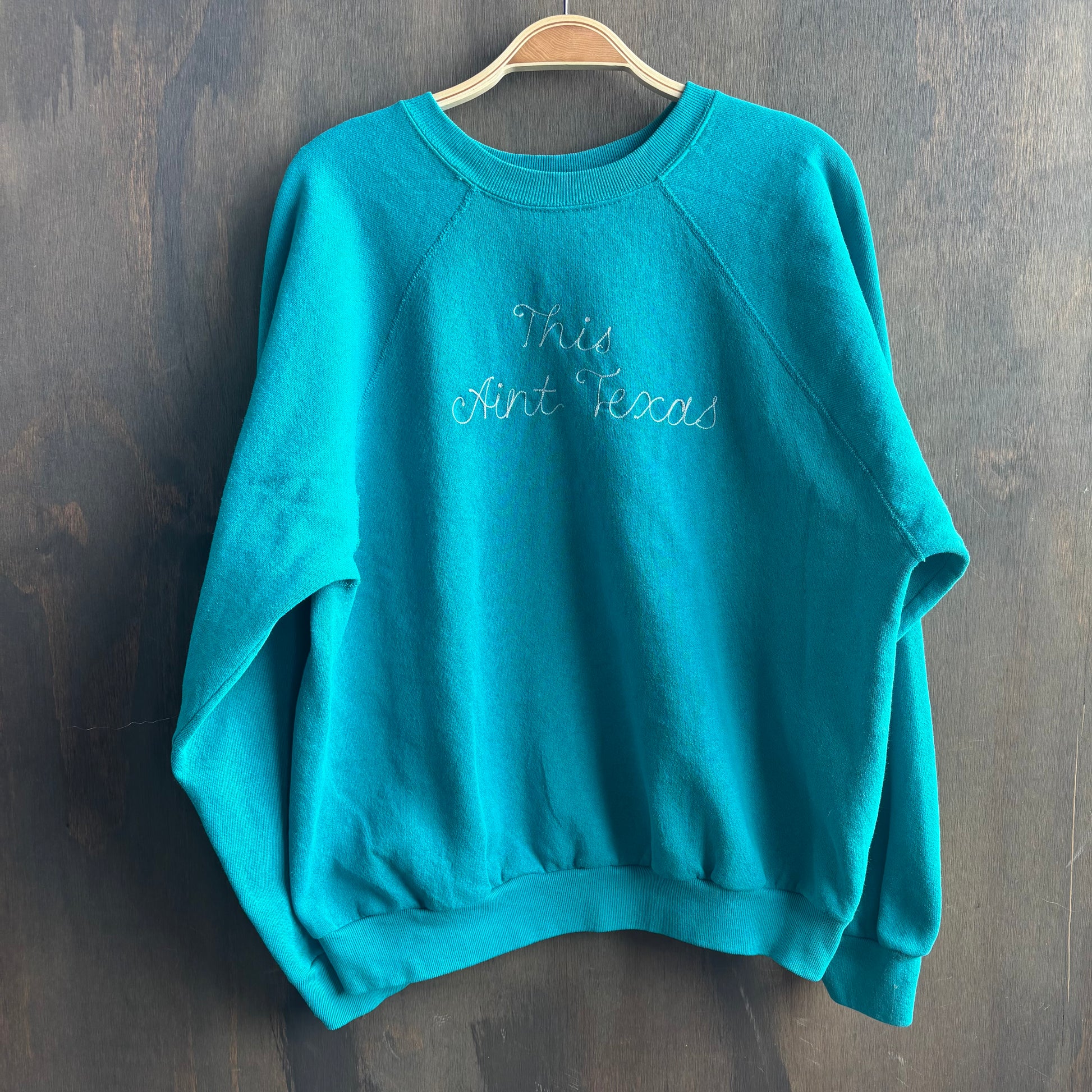Custom teal "This Ain't Texas" sweatshirt with chain stitch embroidery, size L