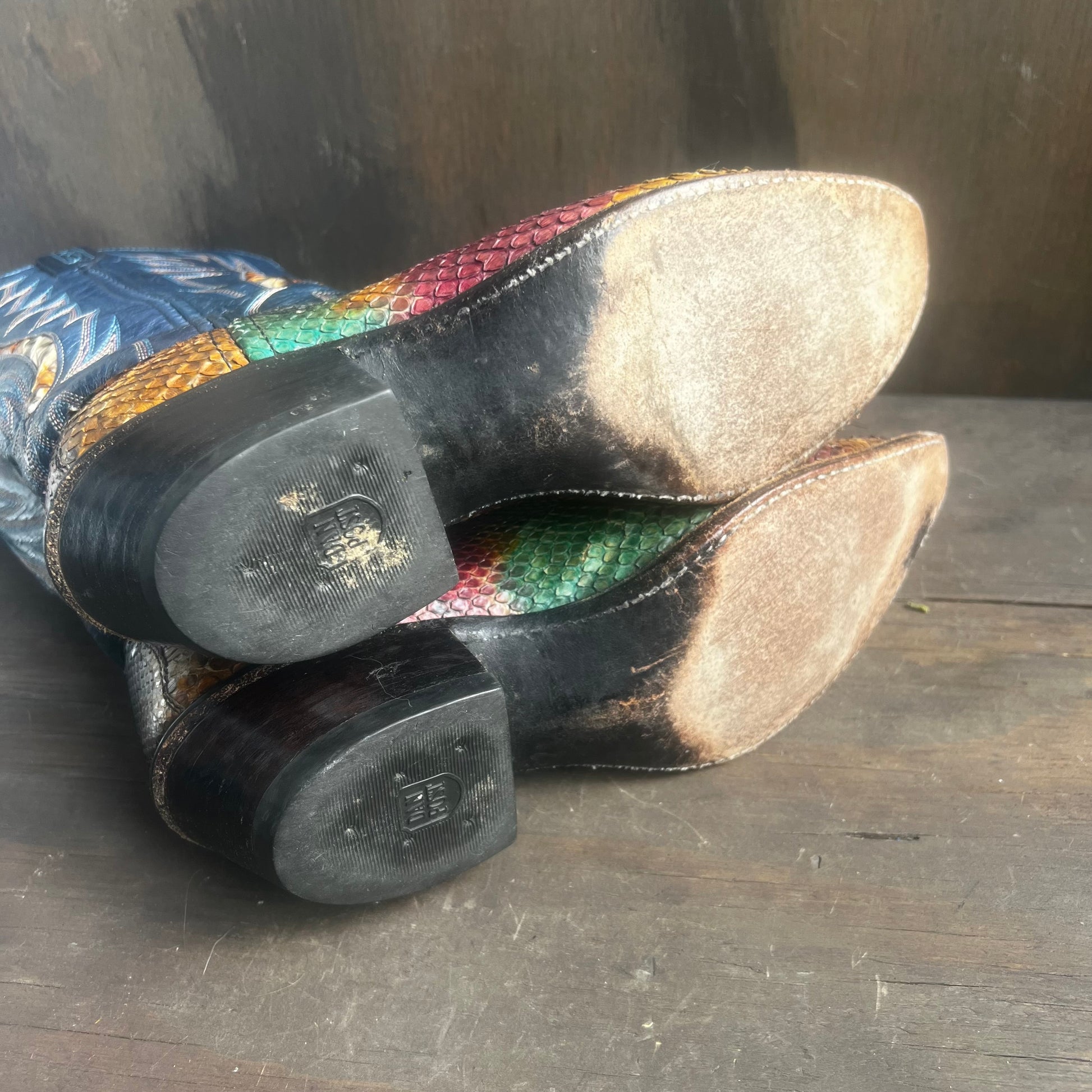 Stunning and unique boots with a colorful reptile skin vamp, and a dark blue shaft. These boots look like autumn leaves! In good vintage condition, women’s 7, men’s 5.5.