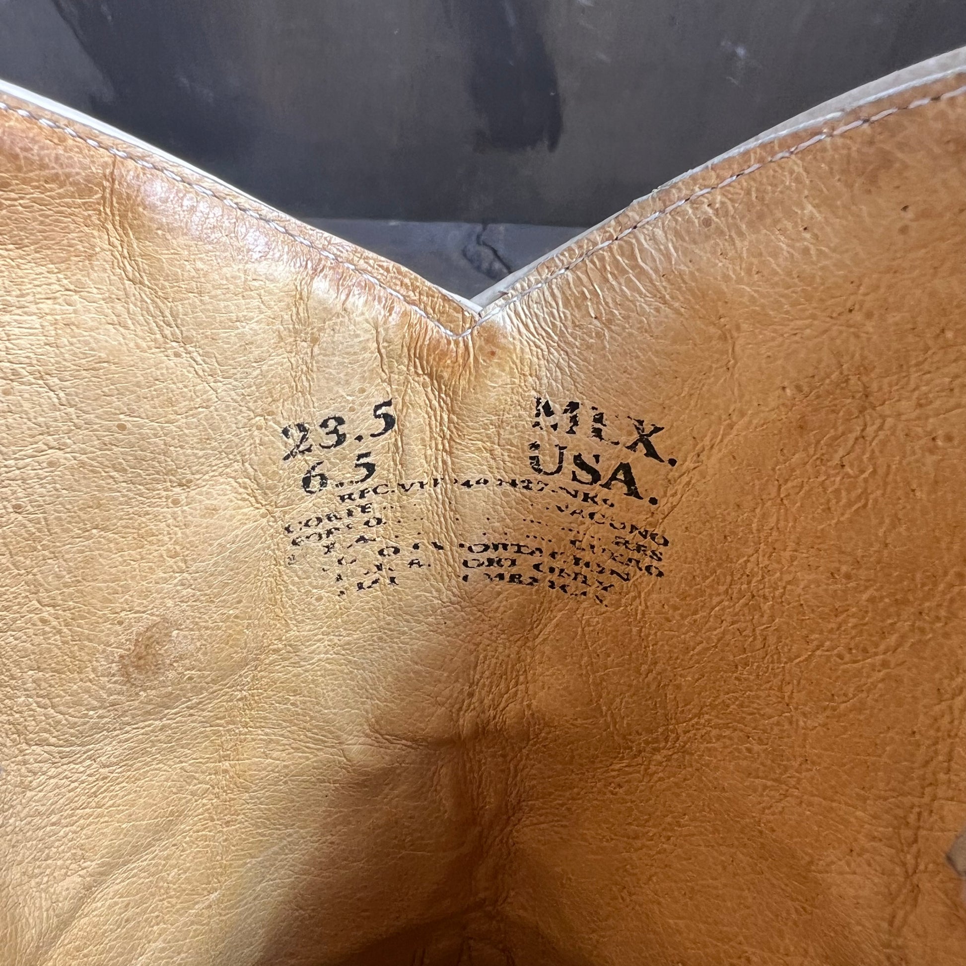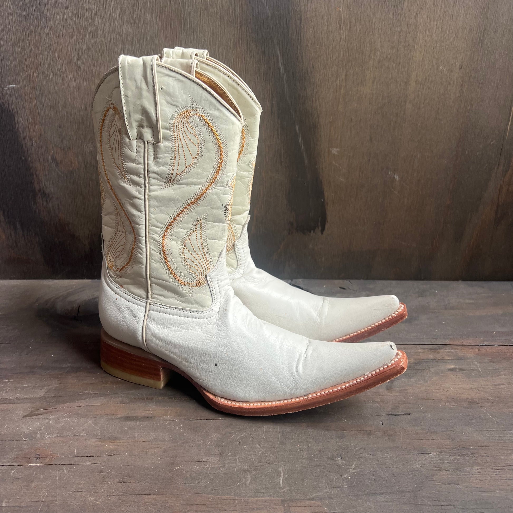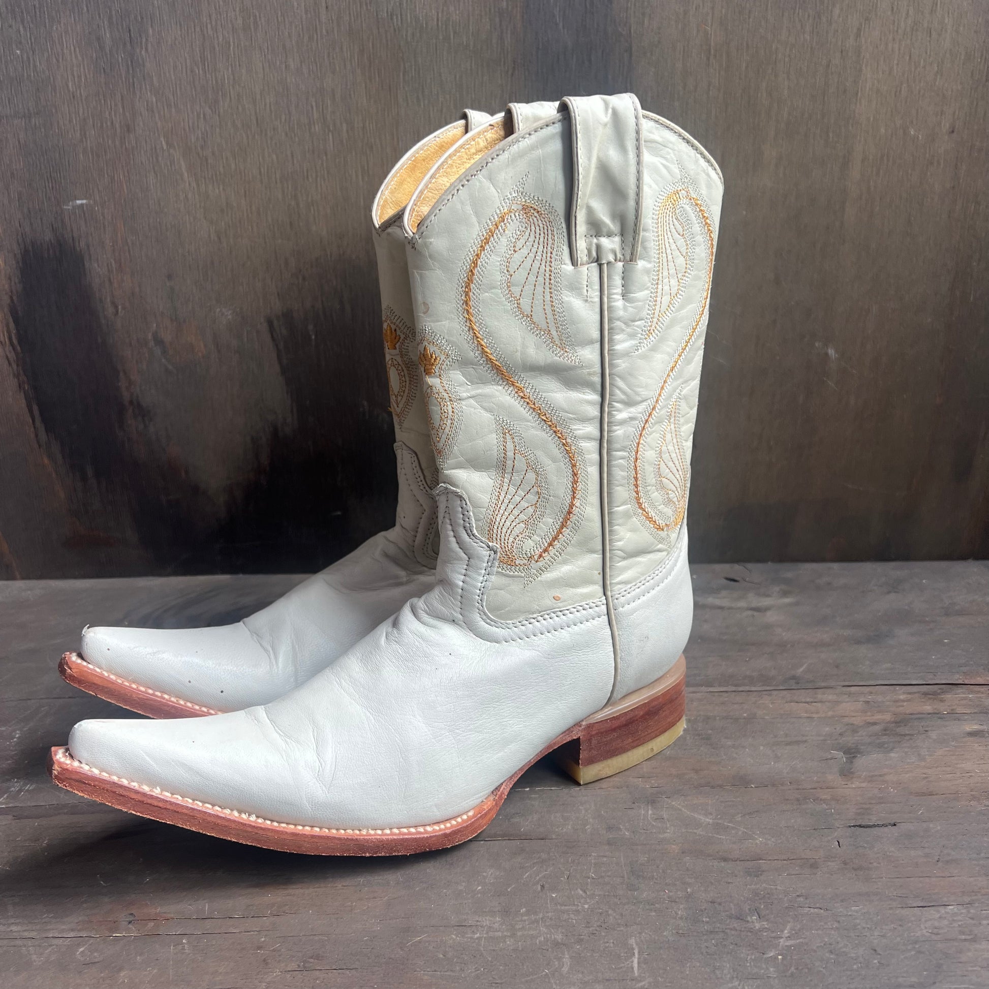 Beautiful white leather boots with yellow embroidery decorating the shaft. Boots feature unique and classy pointed and raised toe. In great condition, one black spot on the leather as shown in images. Men’s 6.5, women’s 8.