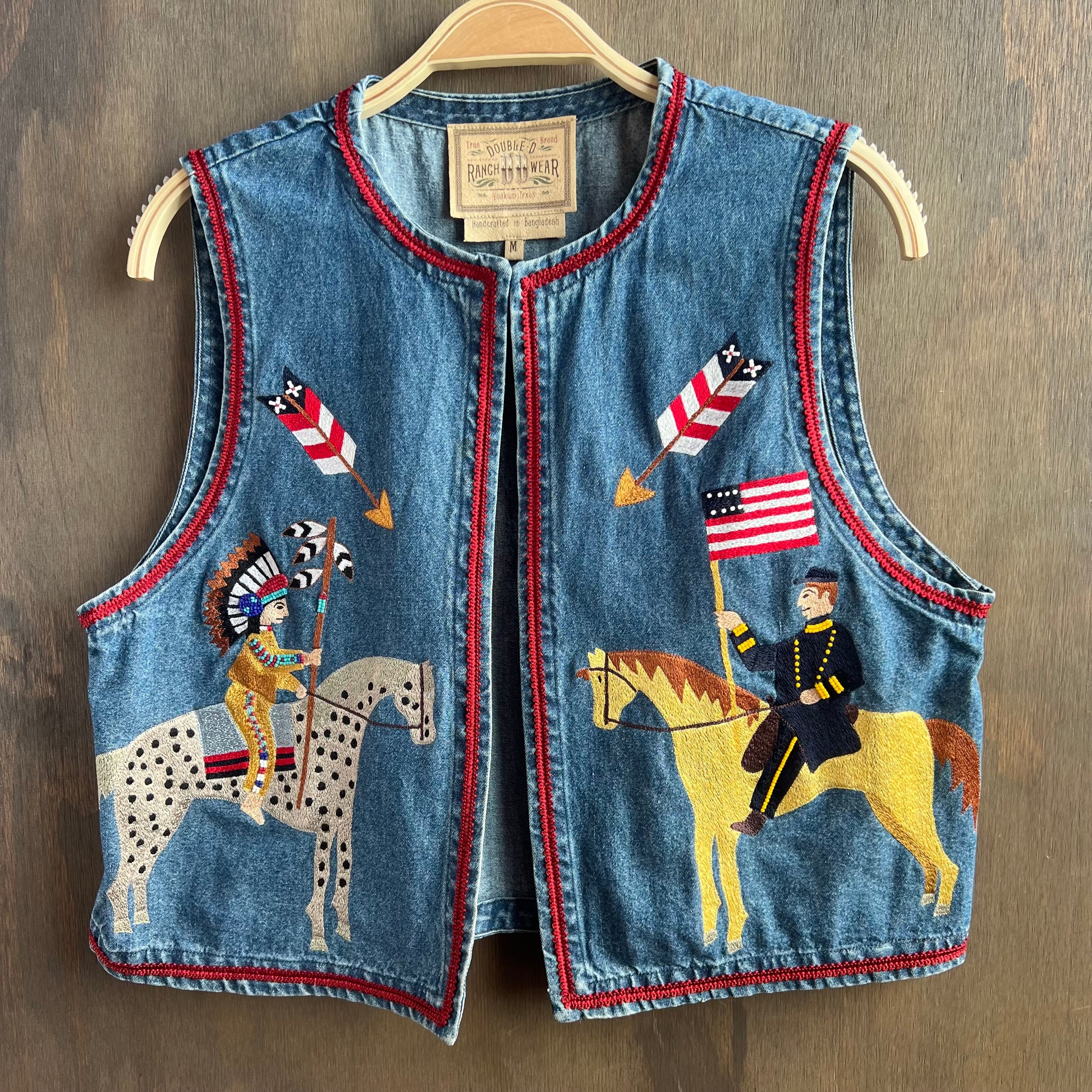 This denim vest is unique and beautiful, featuring stitched designs that depict a soldier and a Native American facing each other in horses. The vest is trimmed with a vibrant red thread. There’s one small clasp at the top of the vest to fasten it, but it will also look great worn open! In great condition, size M.