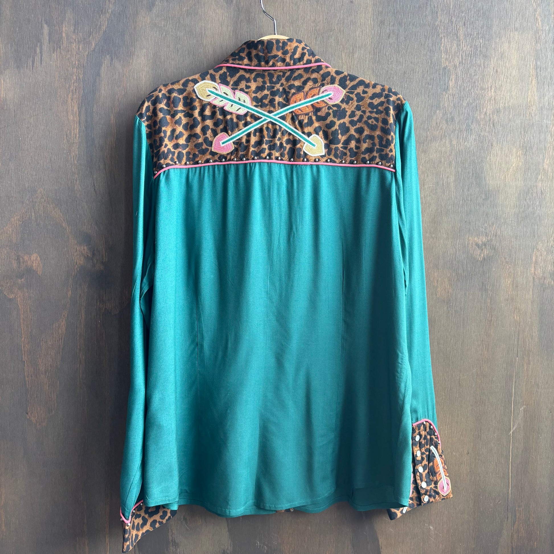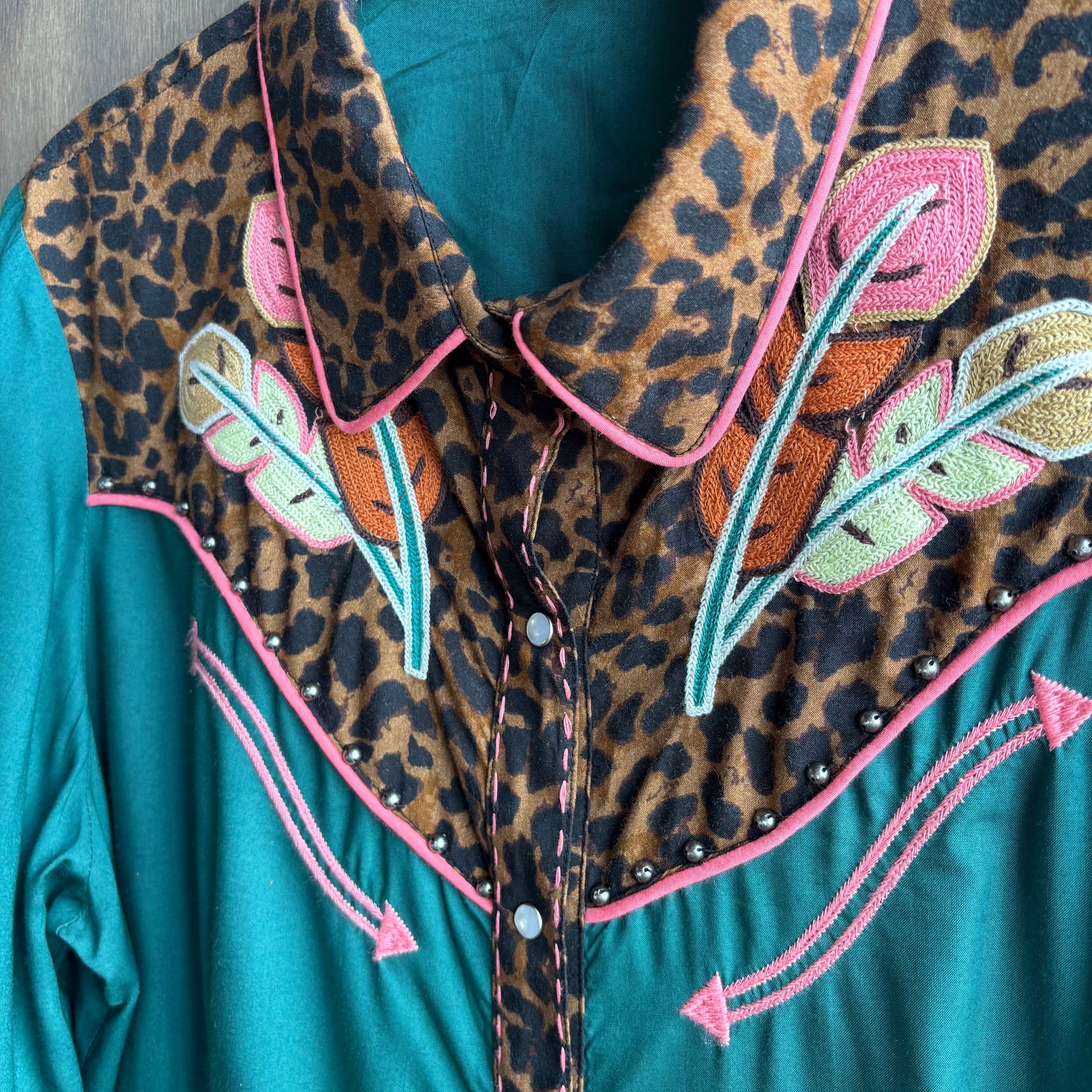 Playful and unique Double D Ranchwear teal button up with animal print on cuffs and yoke, as well as embroidery, size L