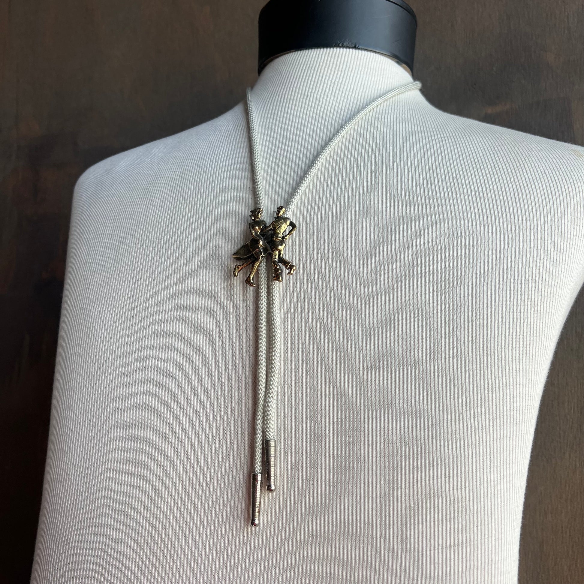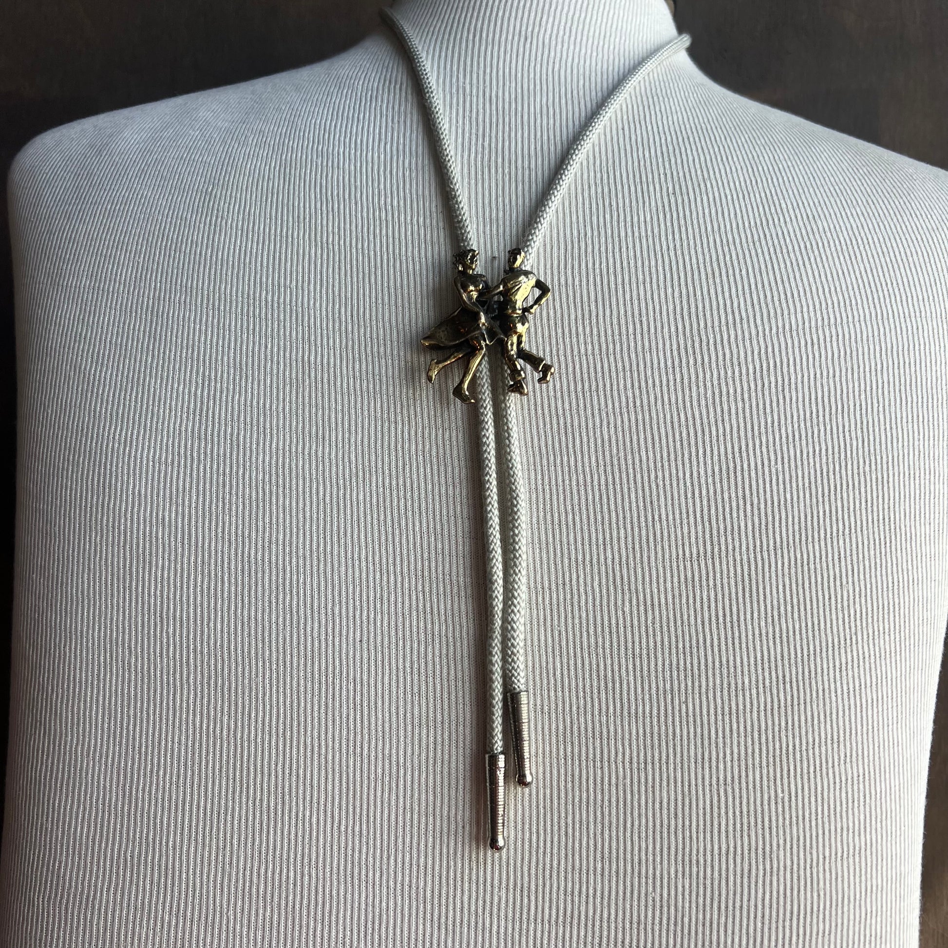 A romantic bolo tie with a couple dancing on a cream colored cotton cord band. Silver tips, condition like new.