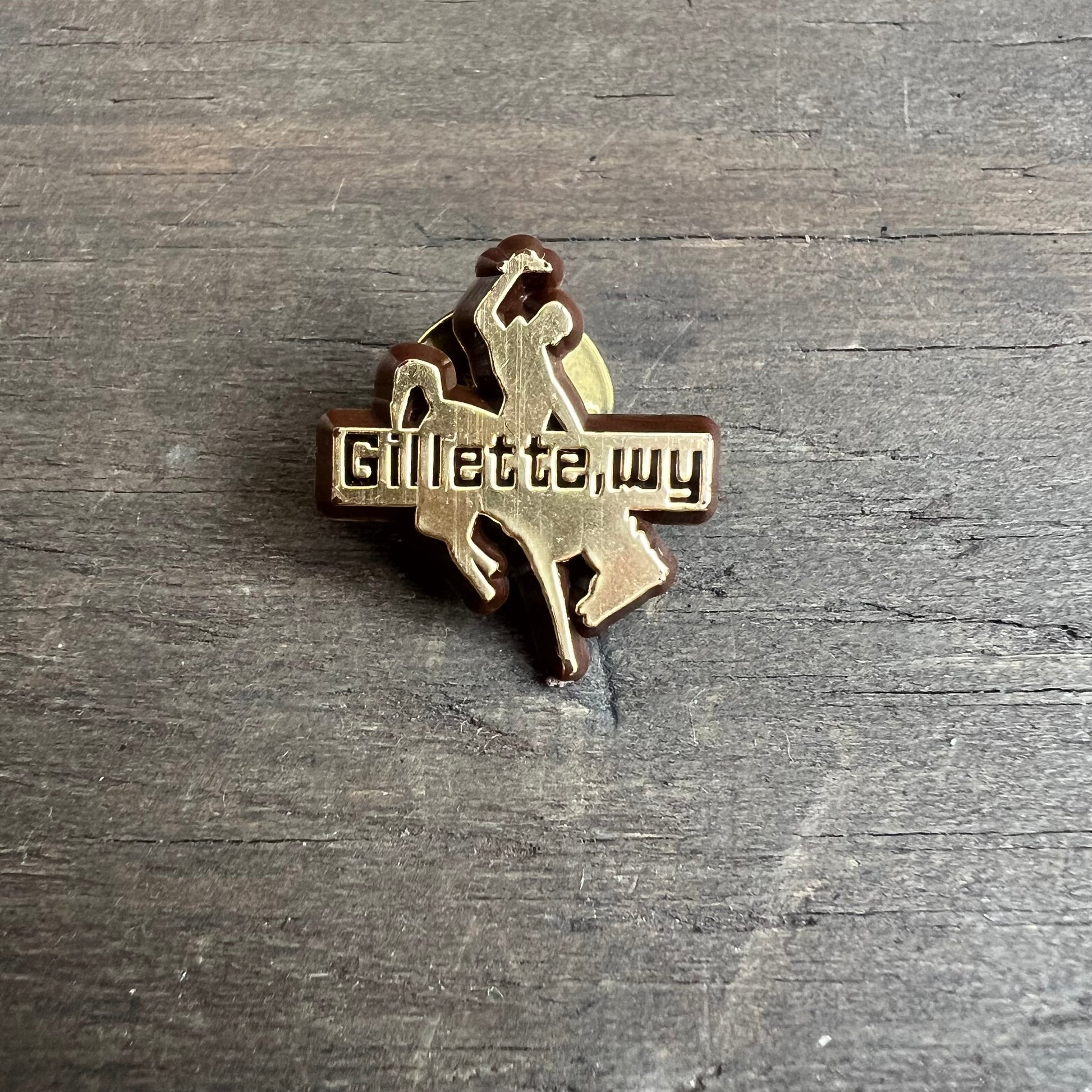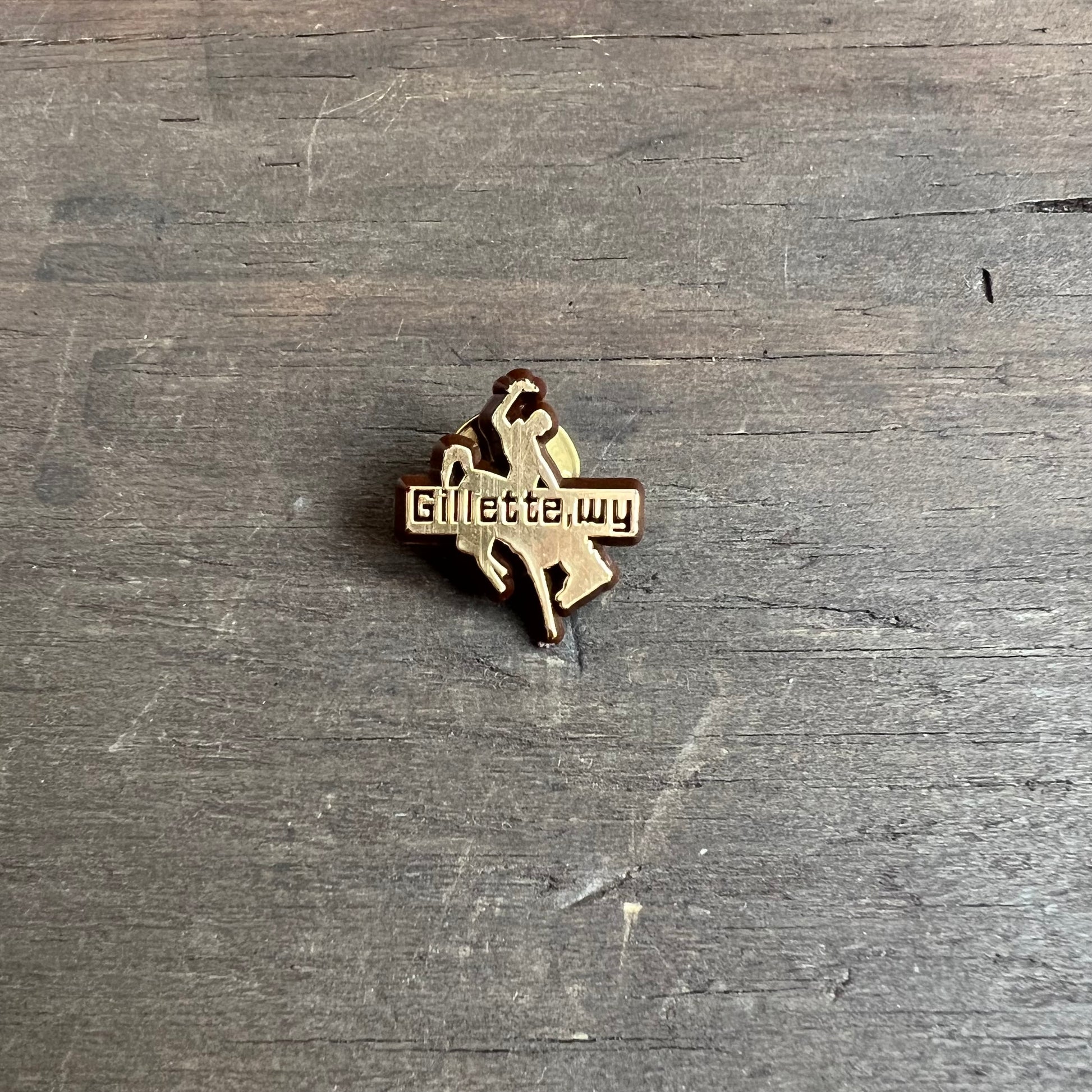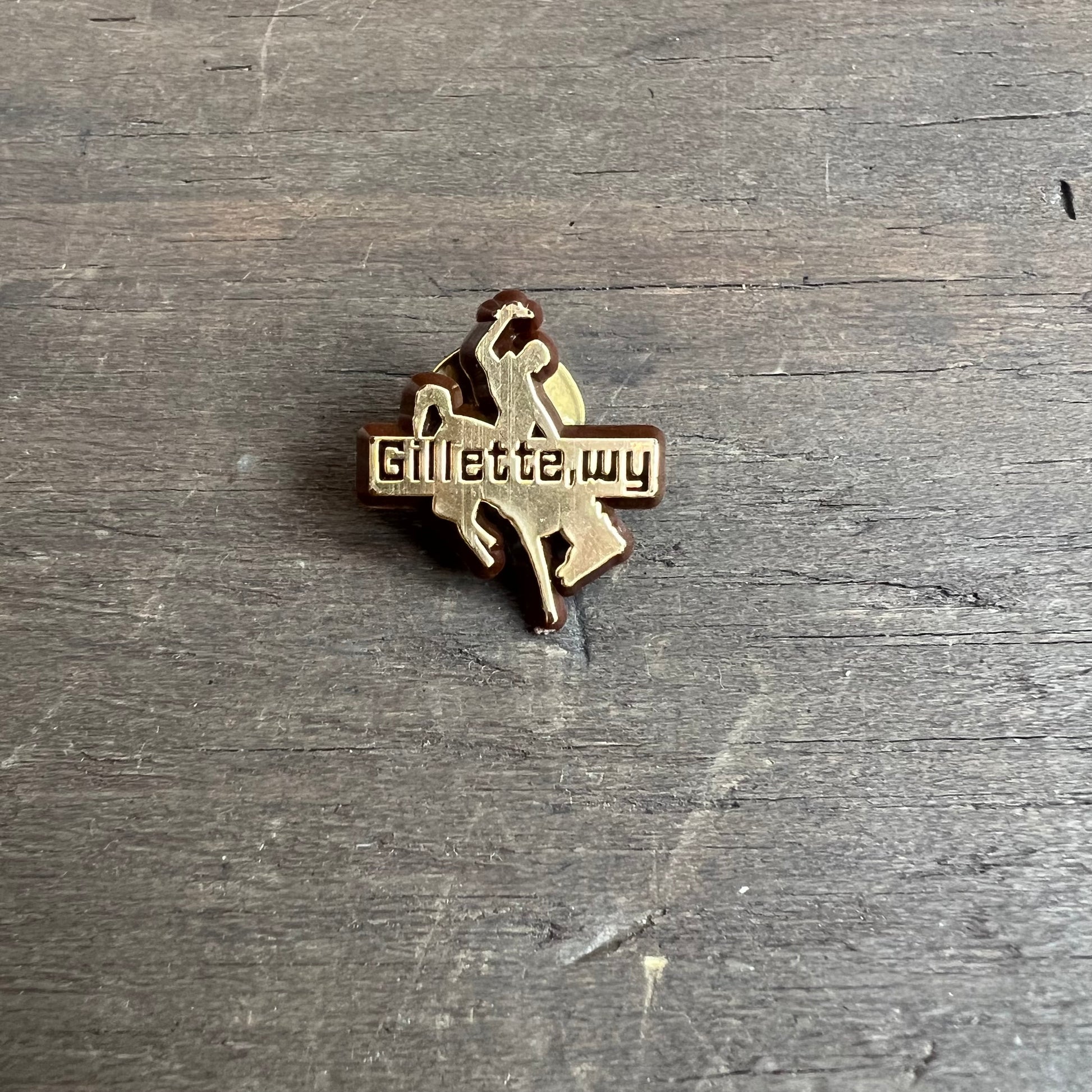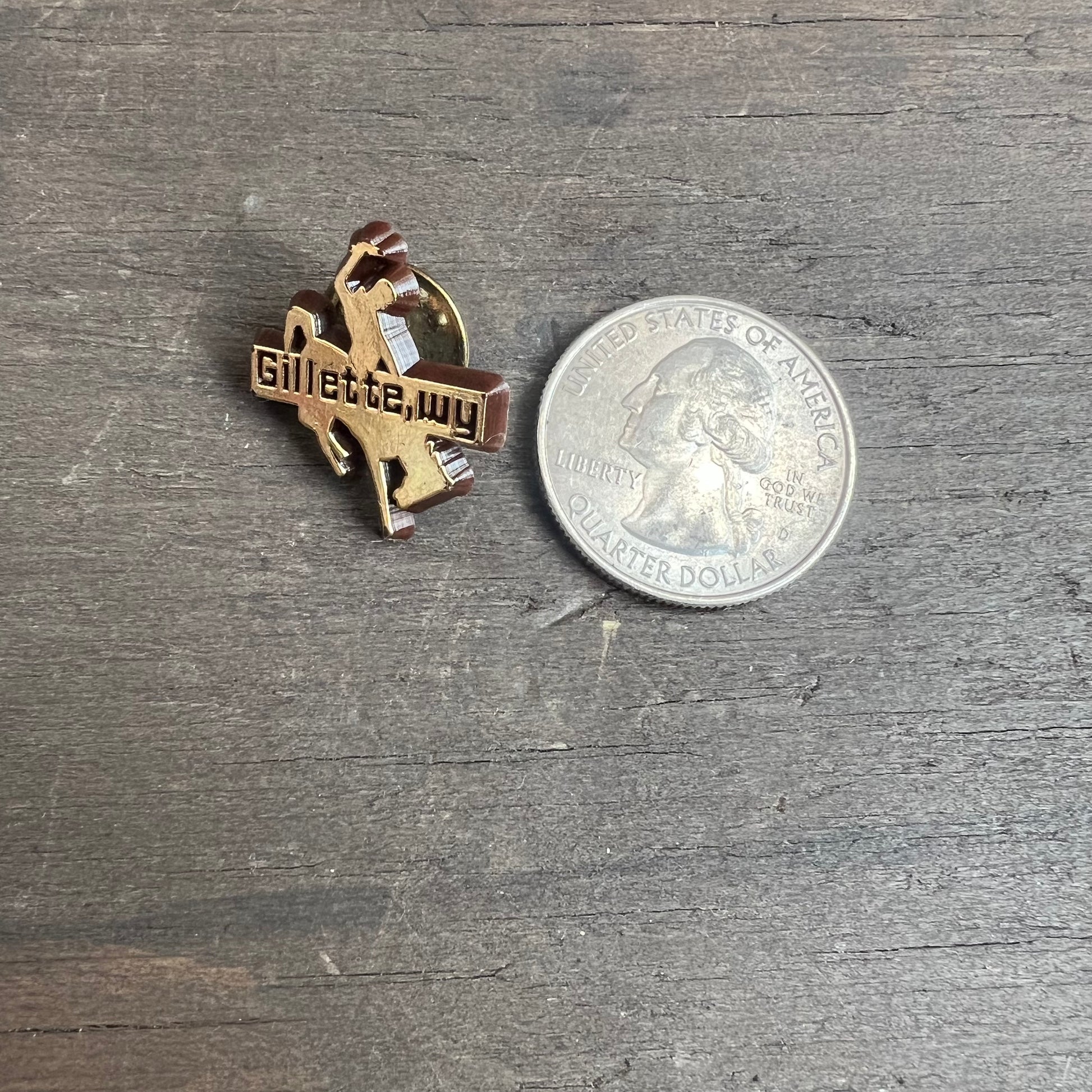 This striking gold-colored bucking bronco pun captures the spirit of the wild American West. “Gillette, WY” is etched across the pin in bold black lettering. Perfect for adding a bit of western flair to jackets, hats, or bags. In great condition. See image with quarter for scale.