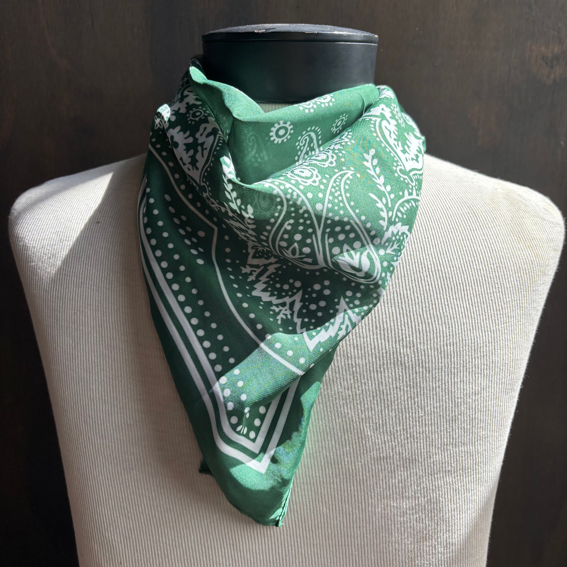 Kelly green bandana style scarf with traditional paisley print, super fun piece!