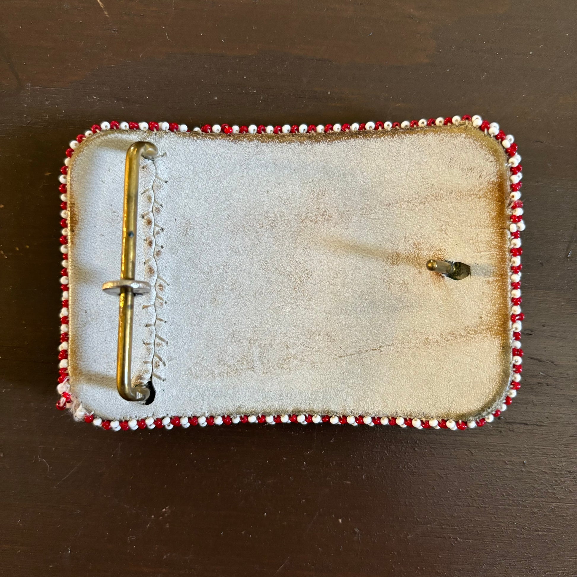Beautiful handmade Native American seed bead belt buckle featuring light blue, red, white, blue, and yellow beads on a leather backing.
