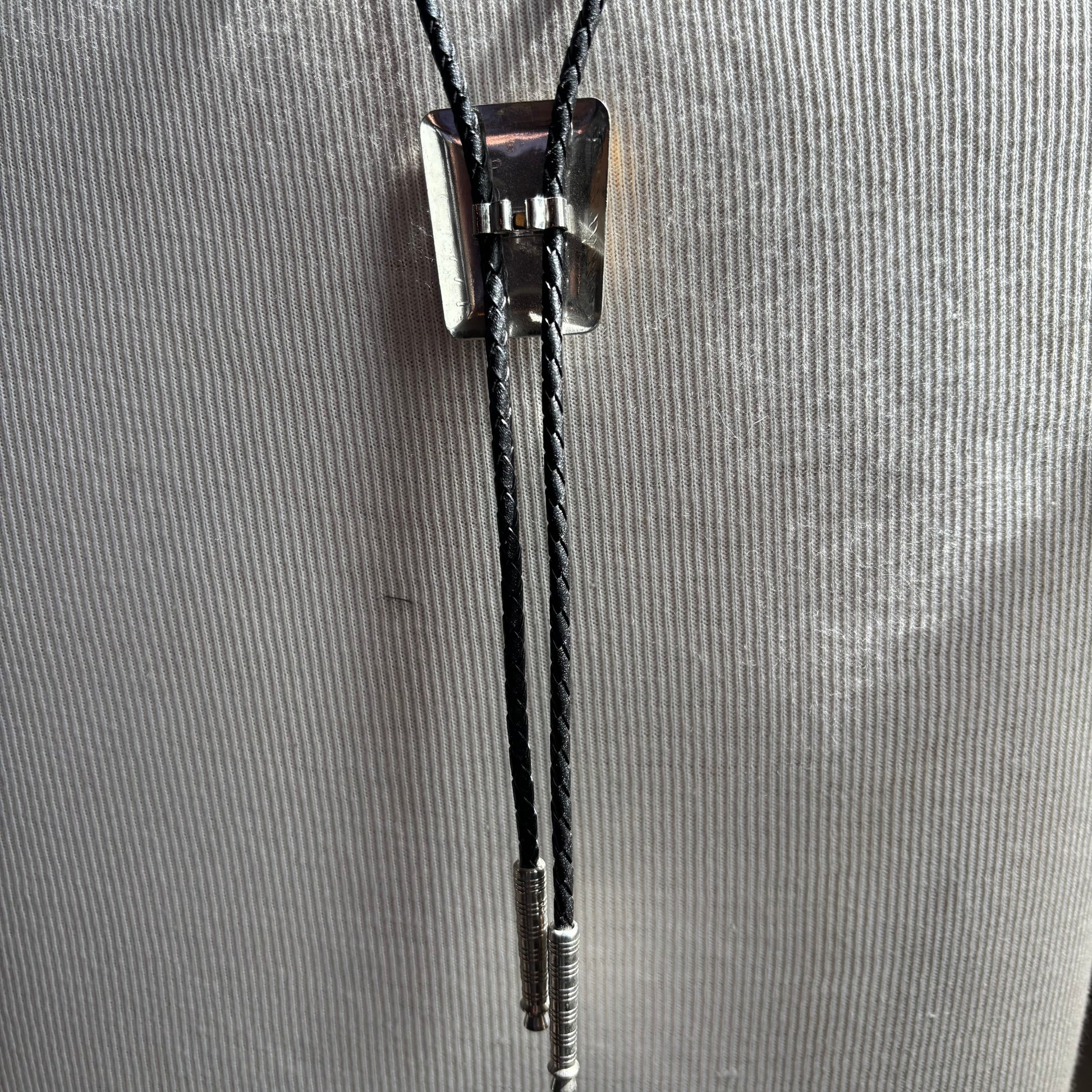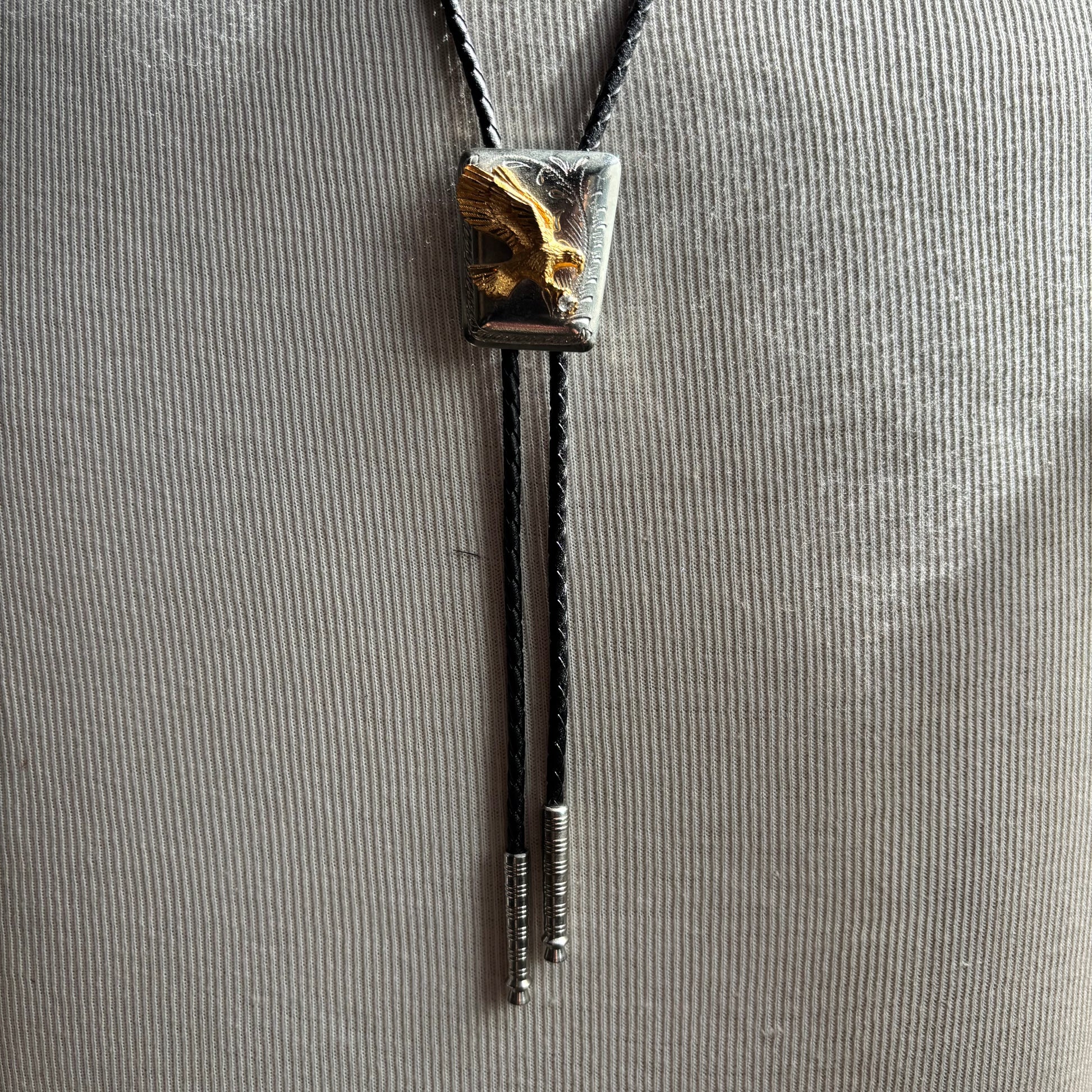 Gorgeous bolo tie of a gold eagle on a silver backing. The eagle is holding a fake diamond. The bolo tie is on a black braided cord with silver tips. In excellent condition.