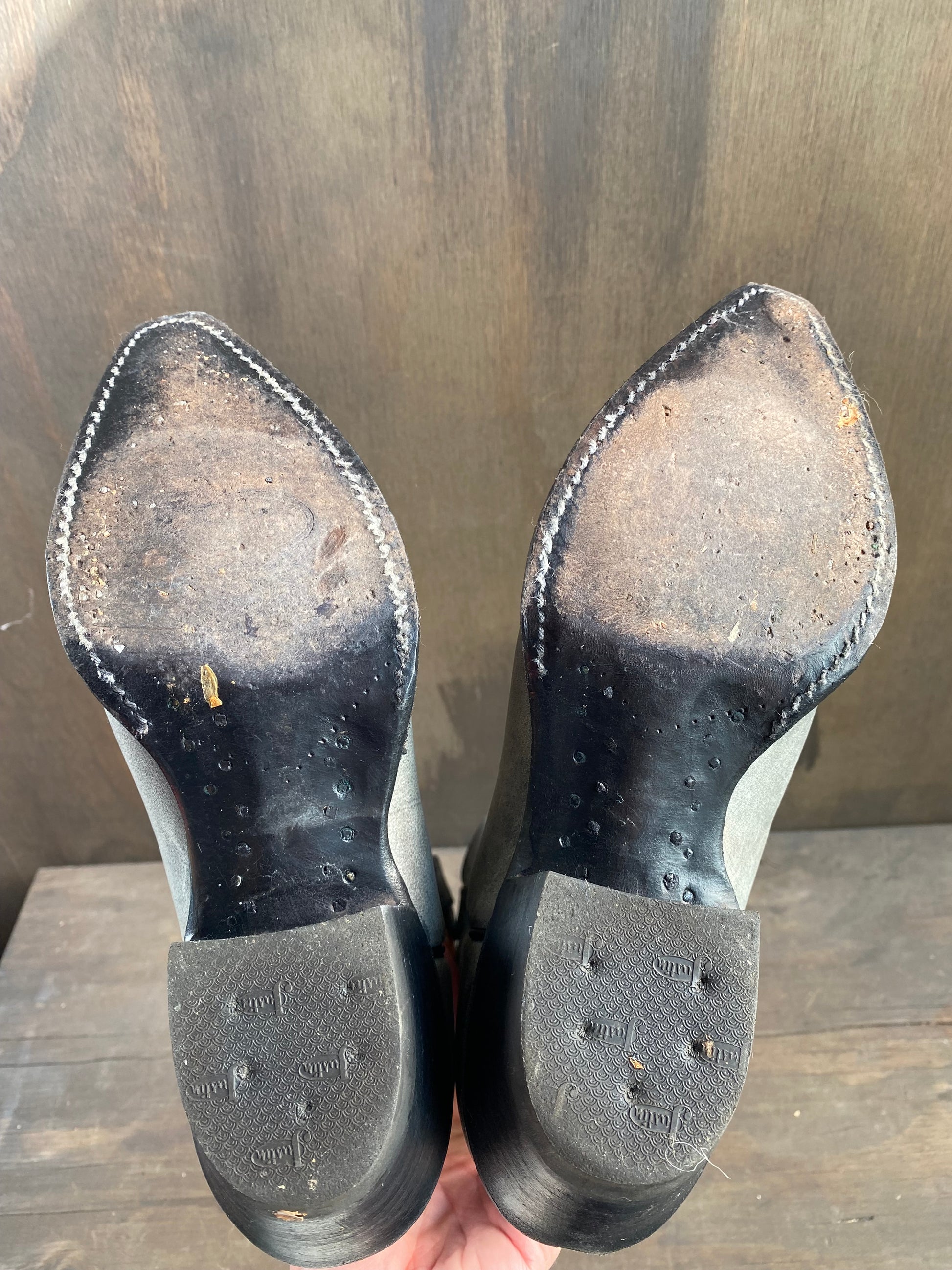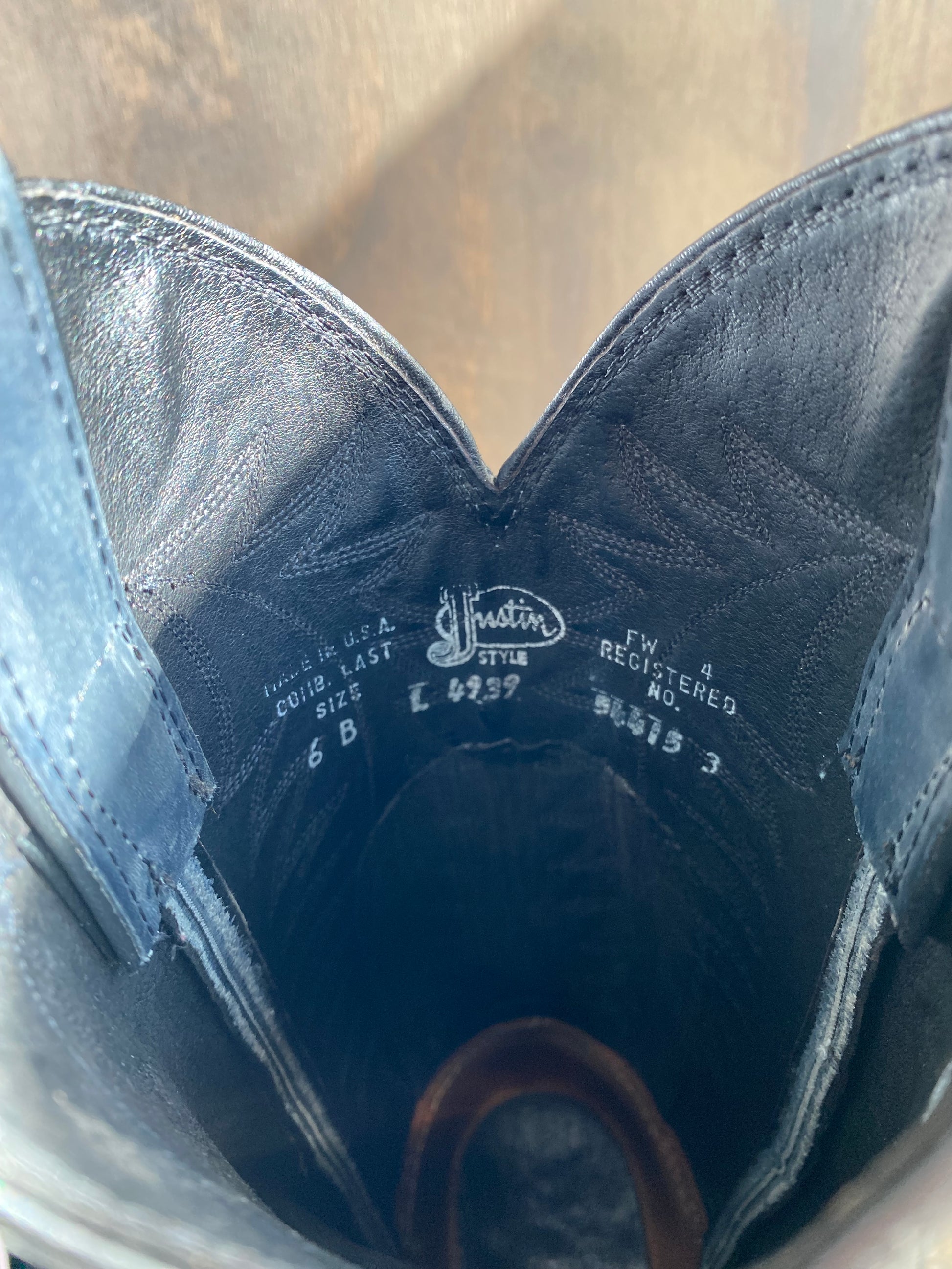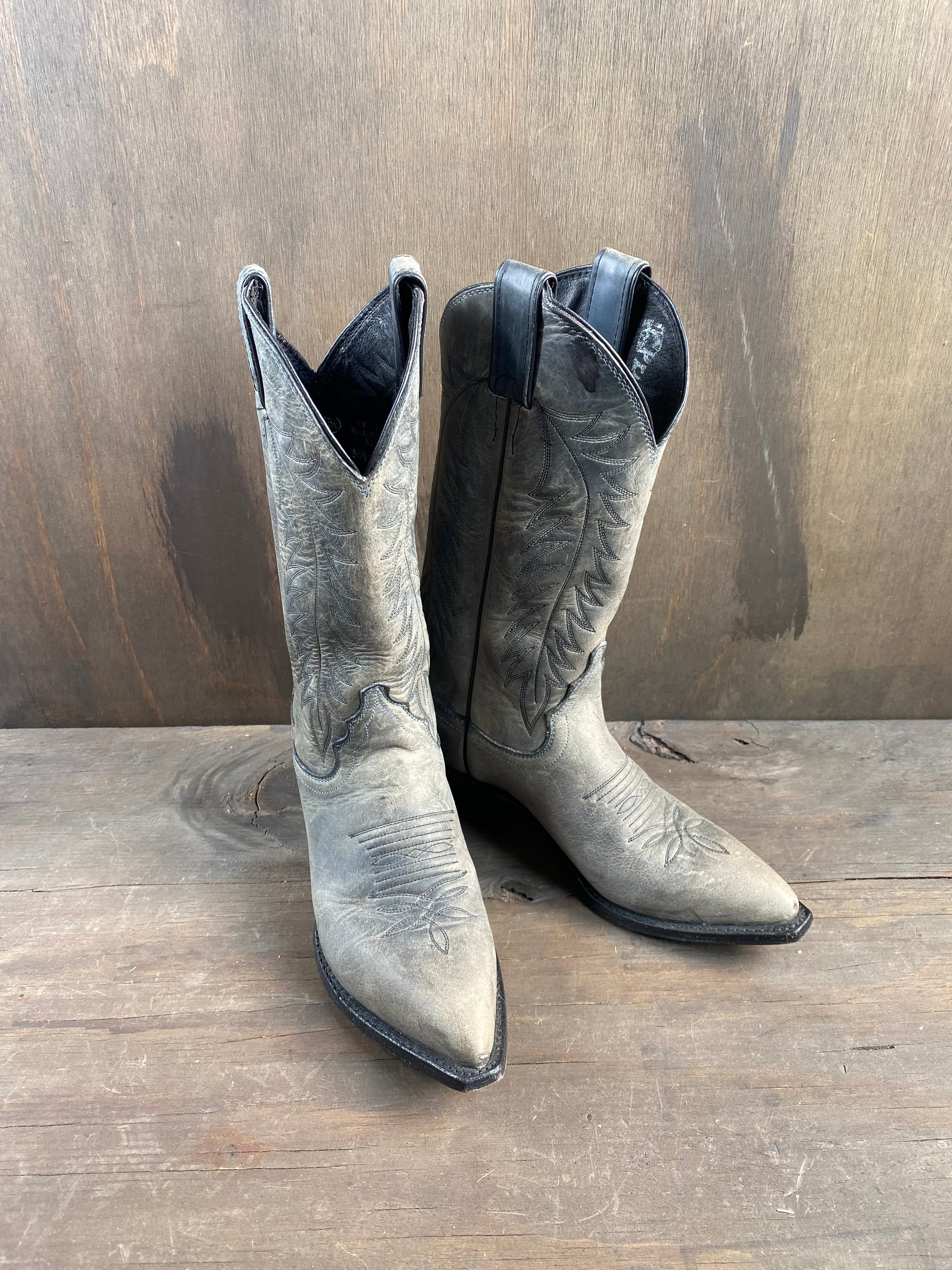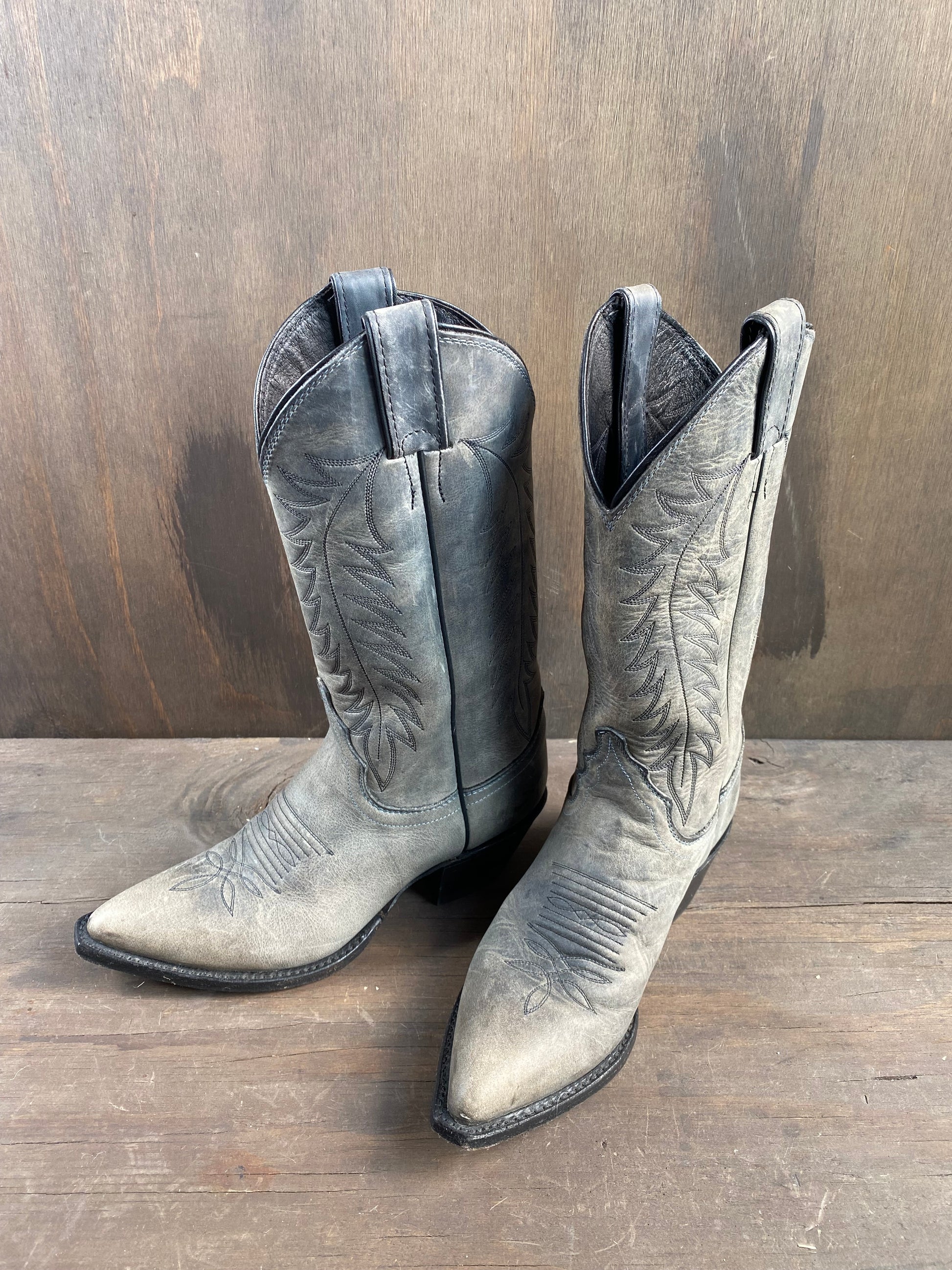 Gray Justins cowboy boots with black stitched embroidery, in great condition. Men’s size 6, women’s 7.5.