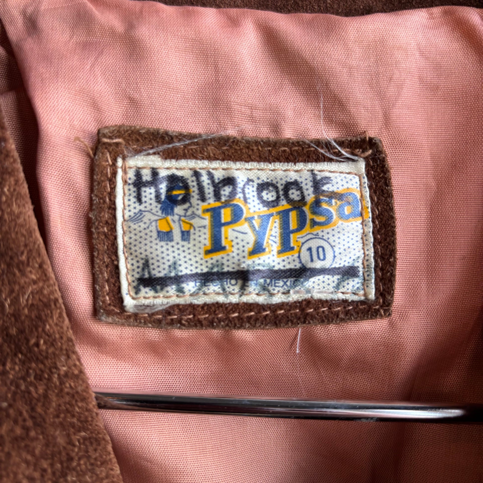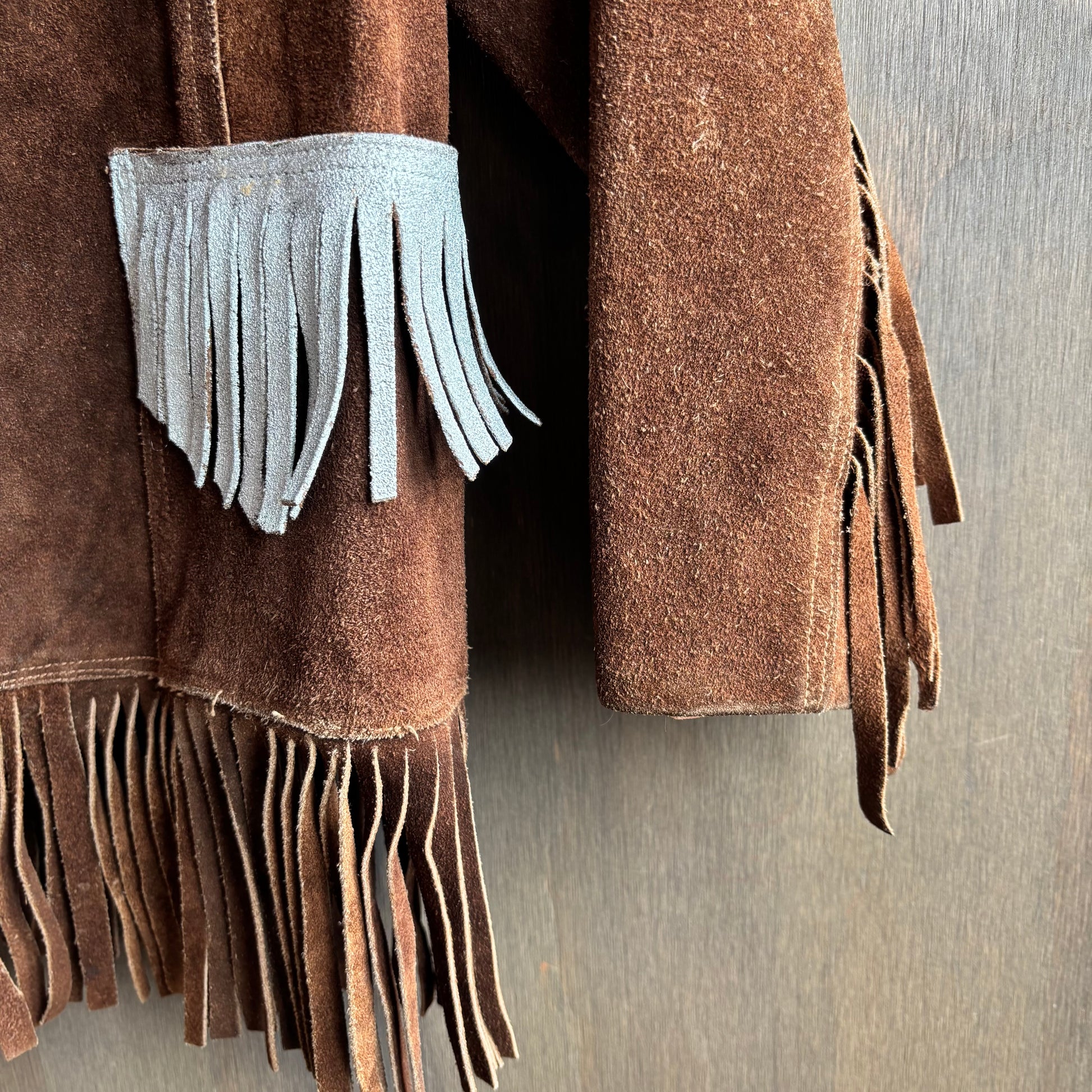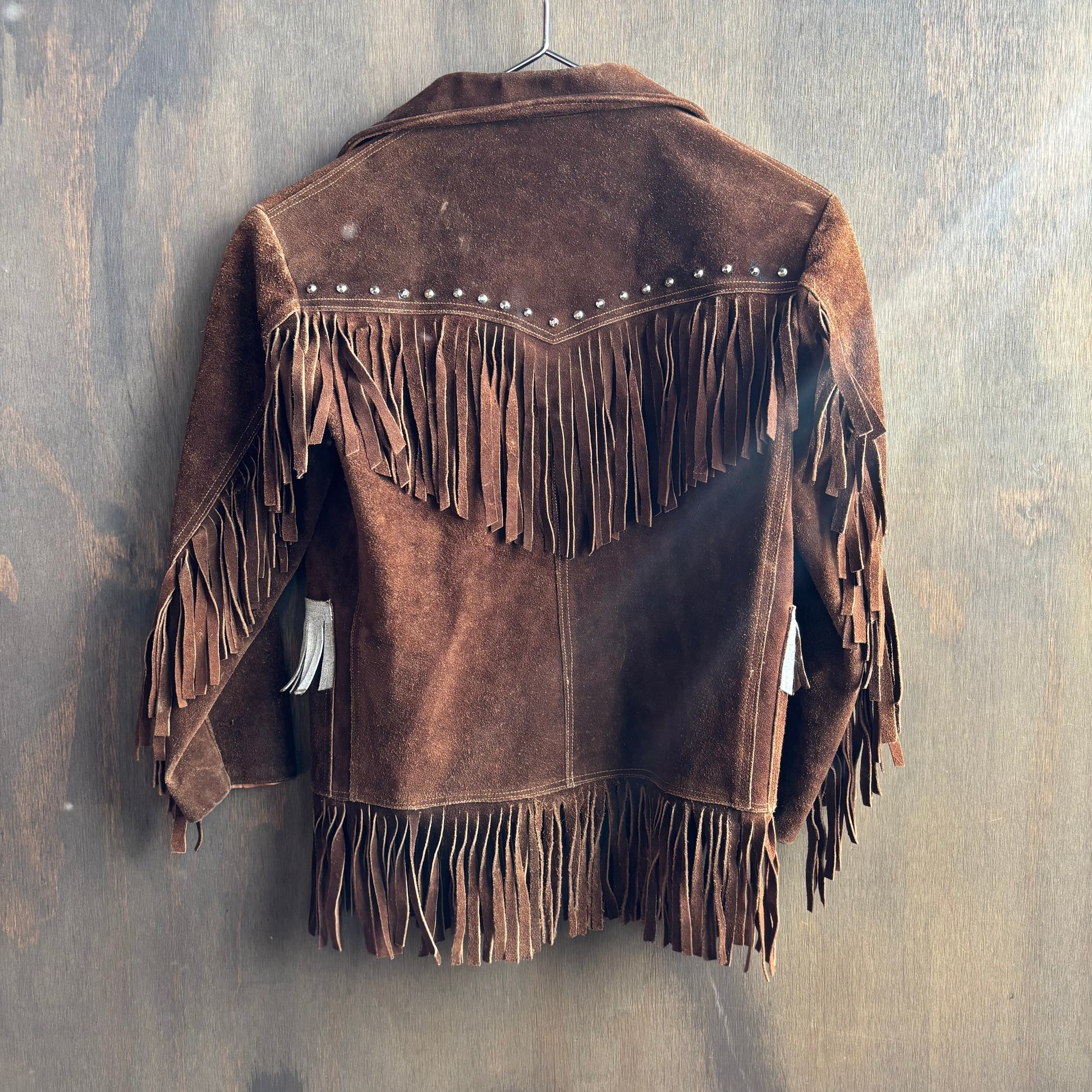 Cute vintage brown suede fringe jacket in children’s size 10. Features silver tone buttons with horseshoes, as well as studs and brown and silver leather fringe.