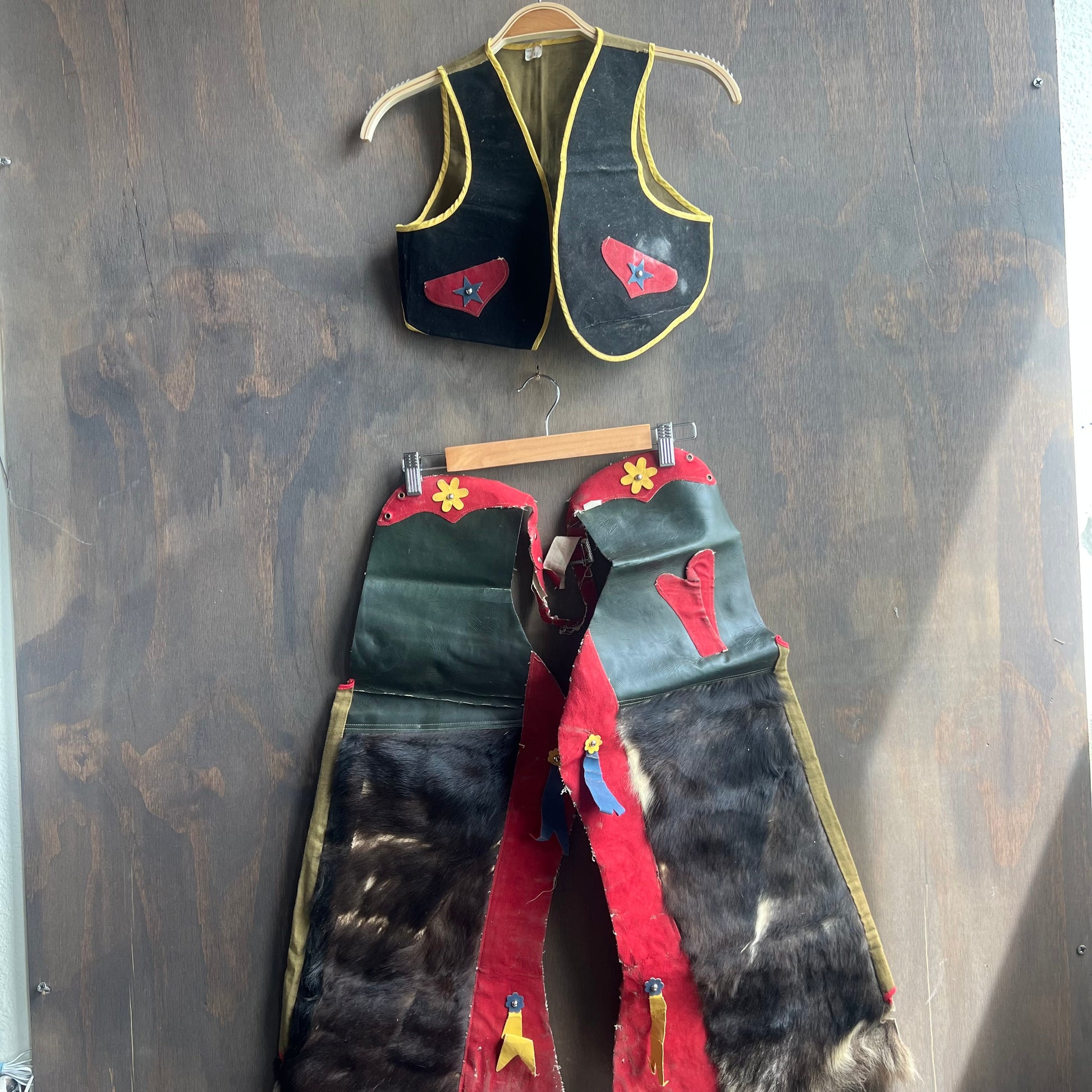 Adorable vintage kids costume. Comes with chaps and 2 interchangeable vests. Costume is detailed and so cool! In good condition, slightly worn from love and time. Size 12 (Kids L).