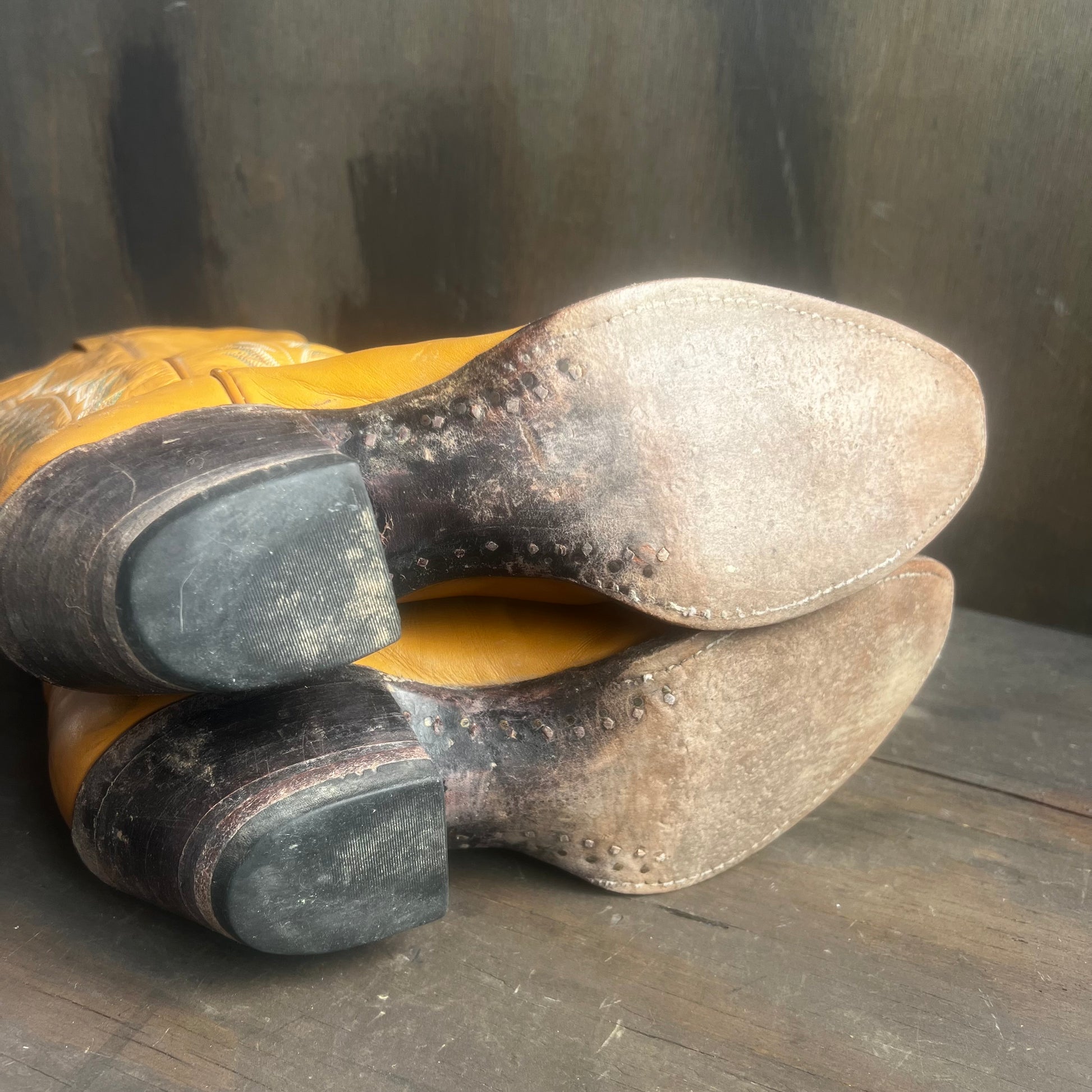 Stunning Larry Mahan tall tan boots with green, brown, and white embroidered embellishments. Boots have a 2” heel. Worn from time but in good vintage condition. Women’s 7, men’s 5.5.