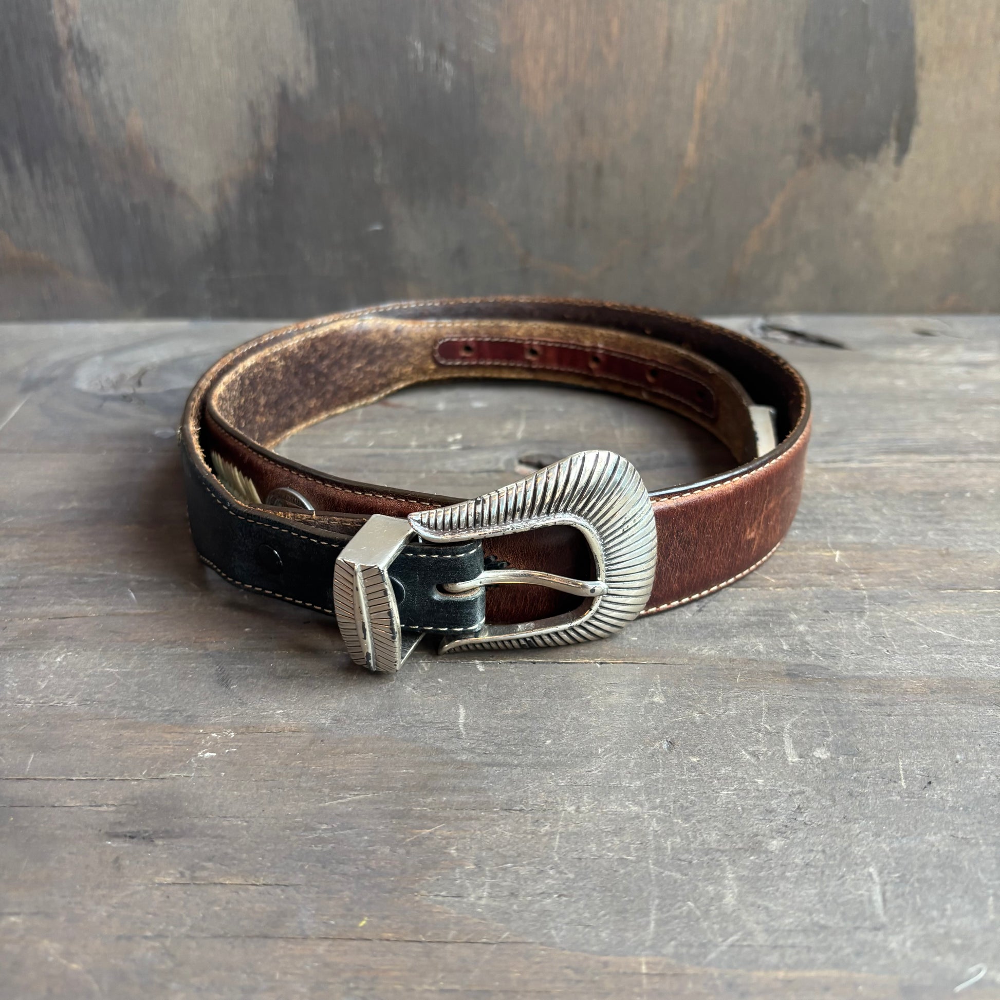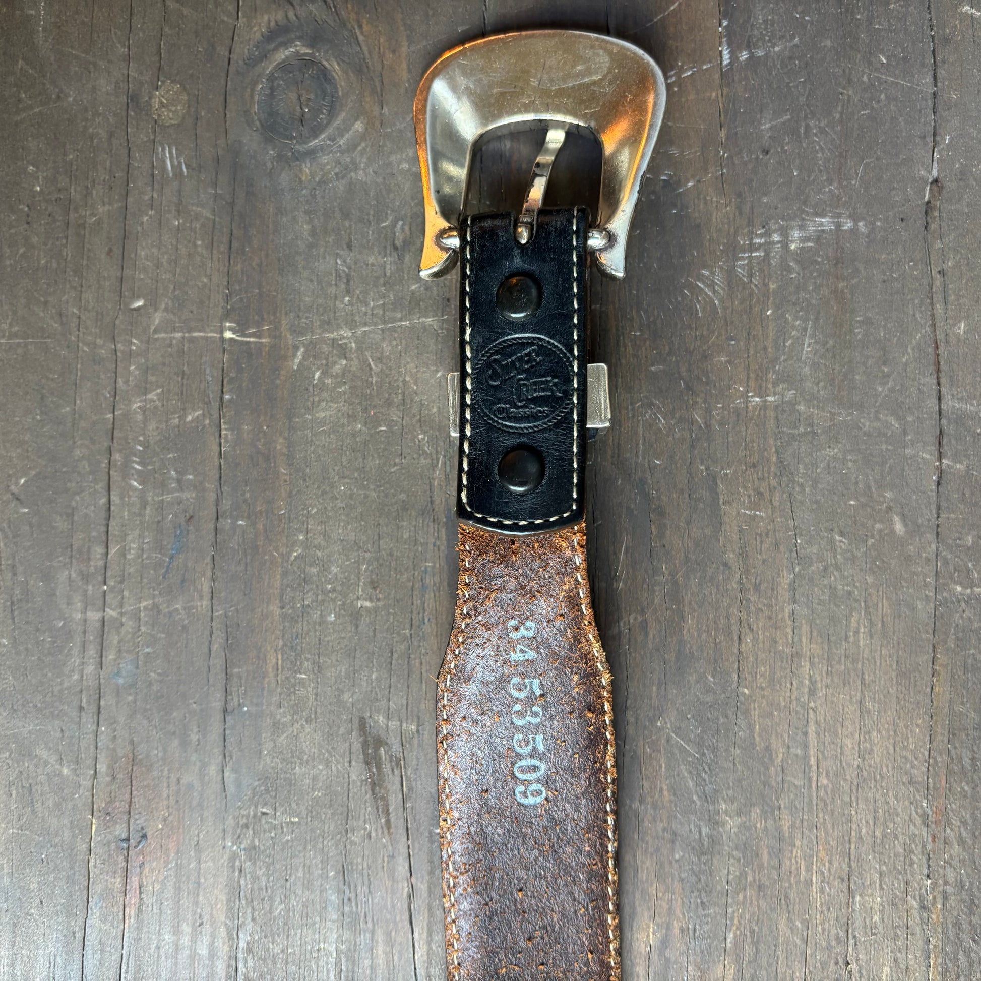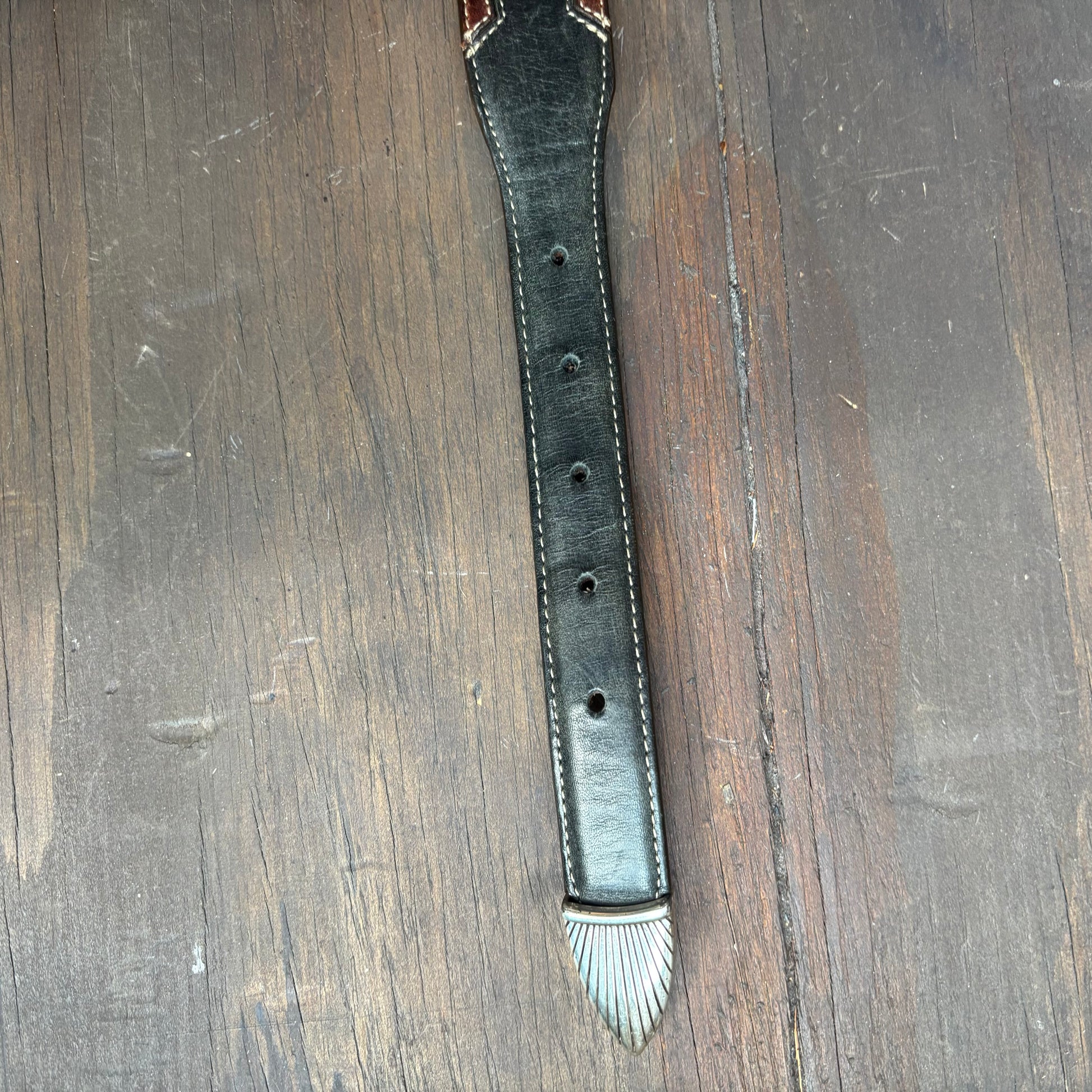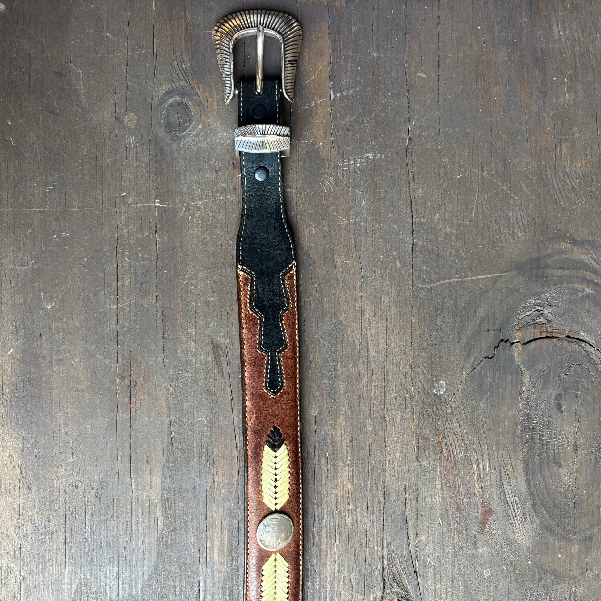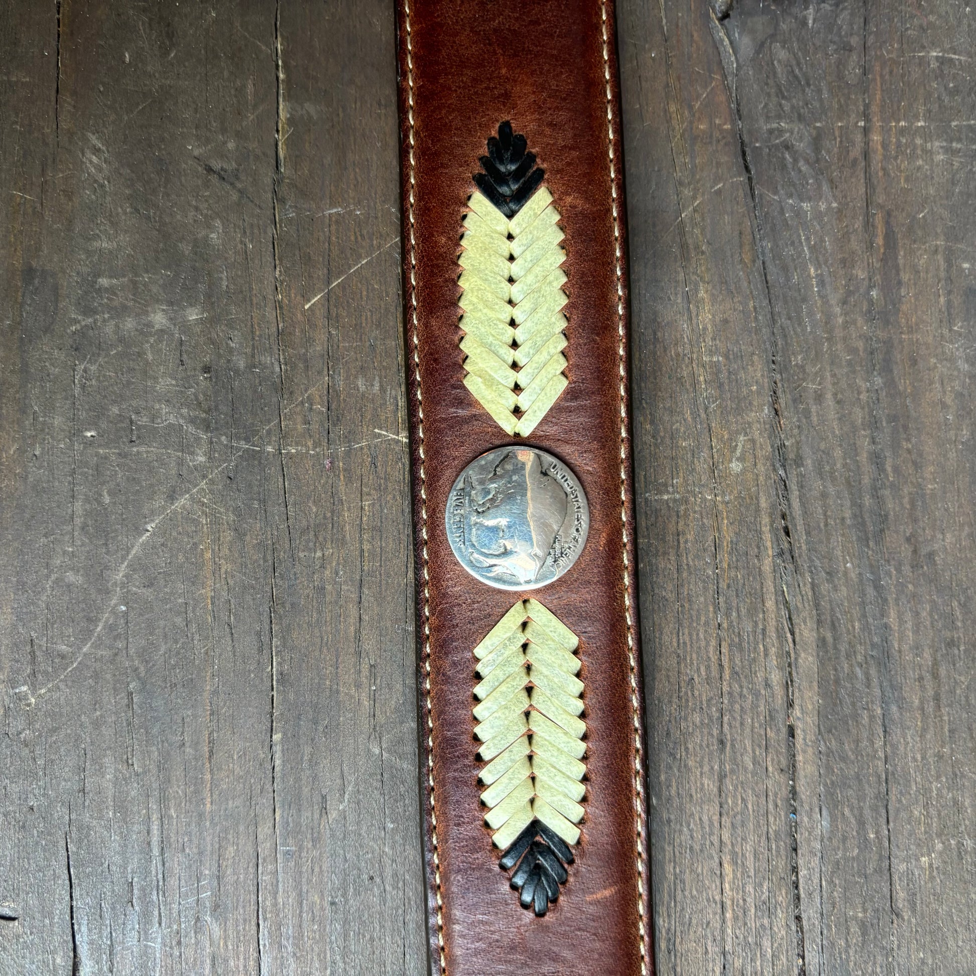 Beautiful brown and black leather belt with white stitching detail and buffalo nickels, size 34, a classic style!