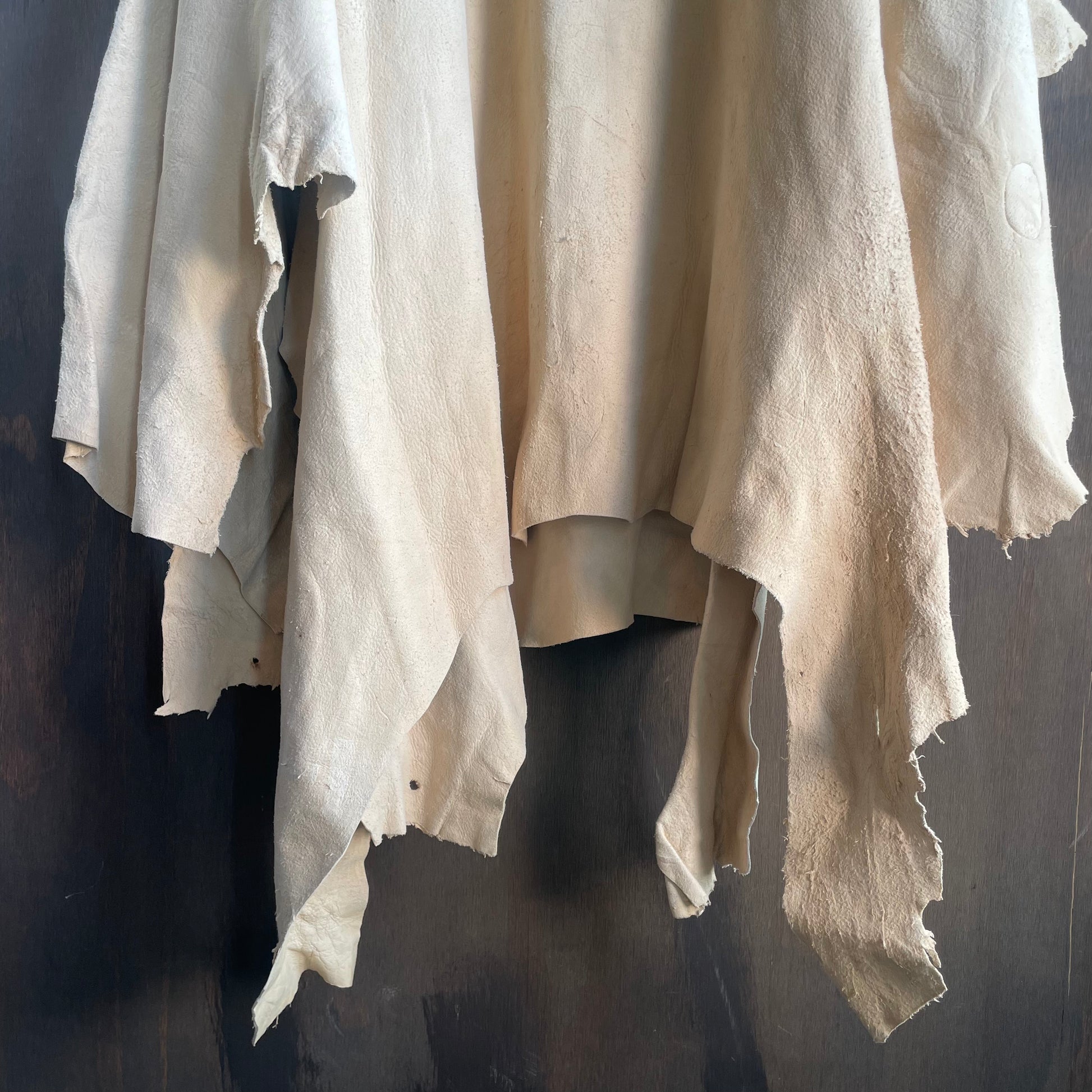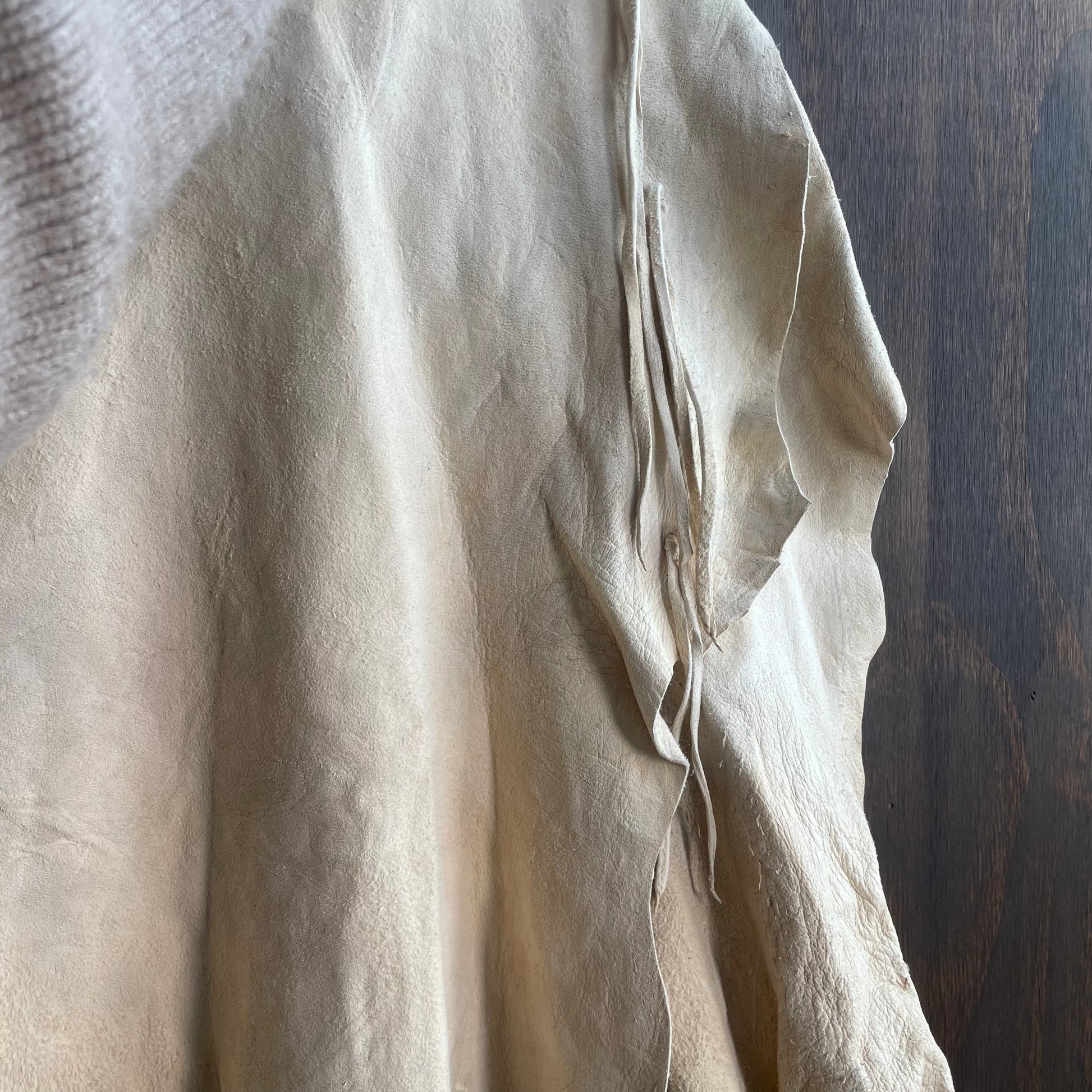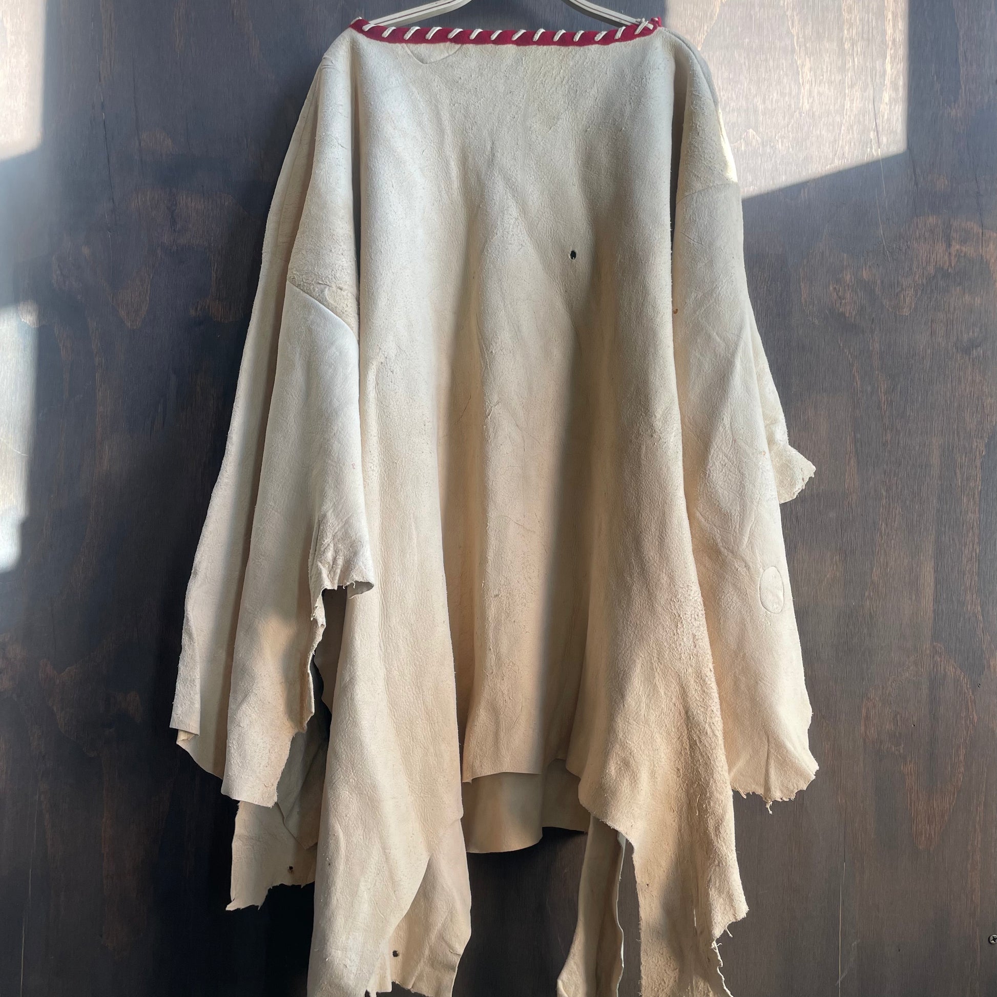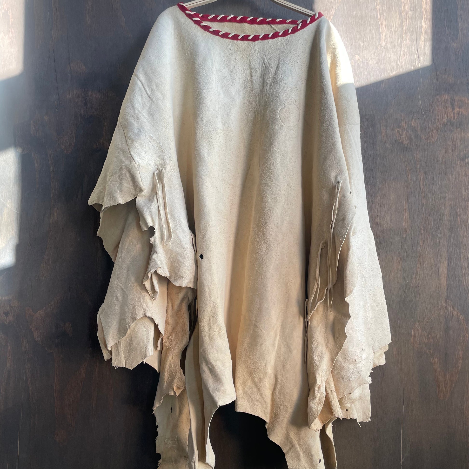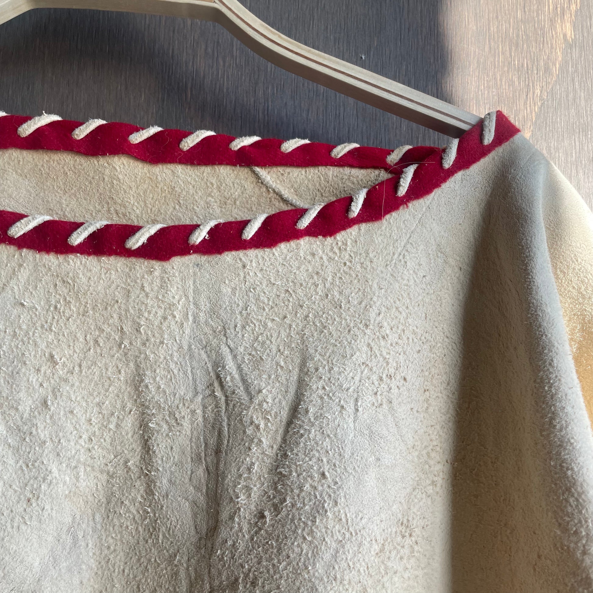 Incredible handmade light tan deerskin poncho with red, stitched neckline and fringe details. Good vintage condition with the requisite holes. One size fits most.