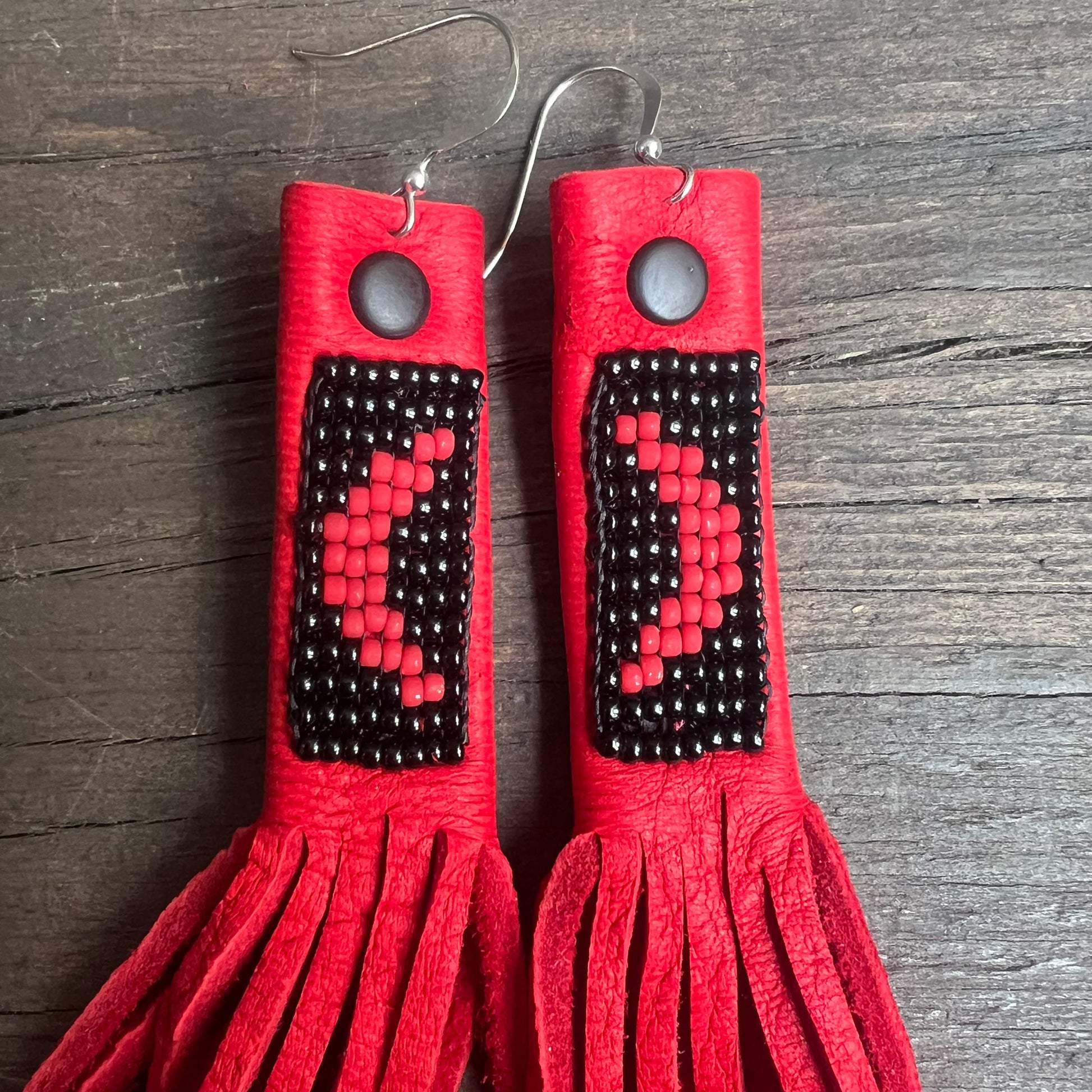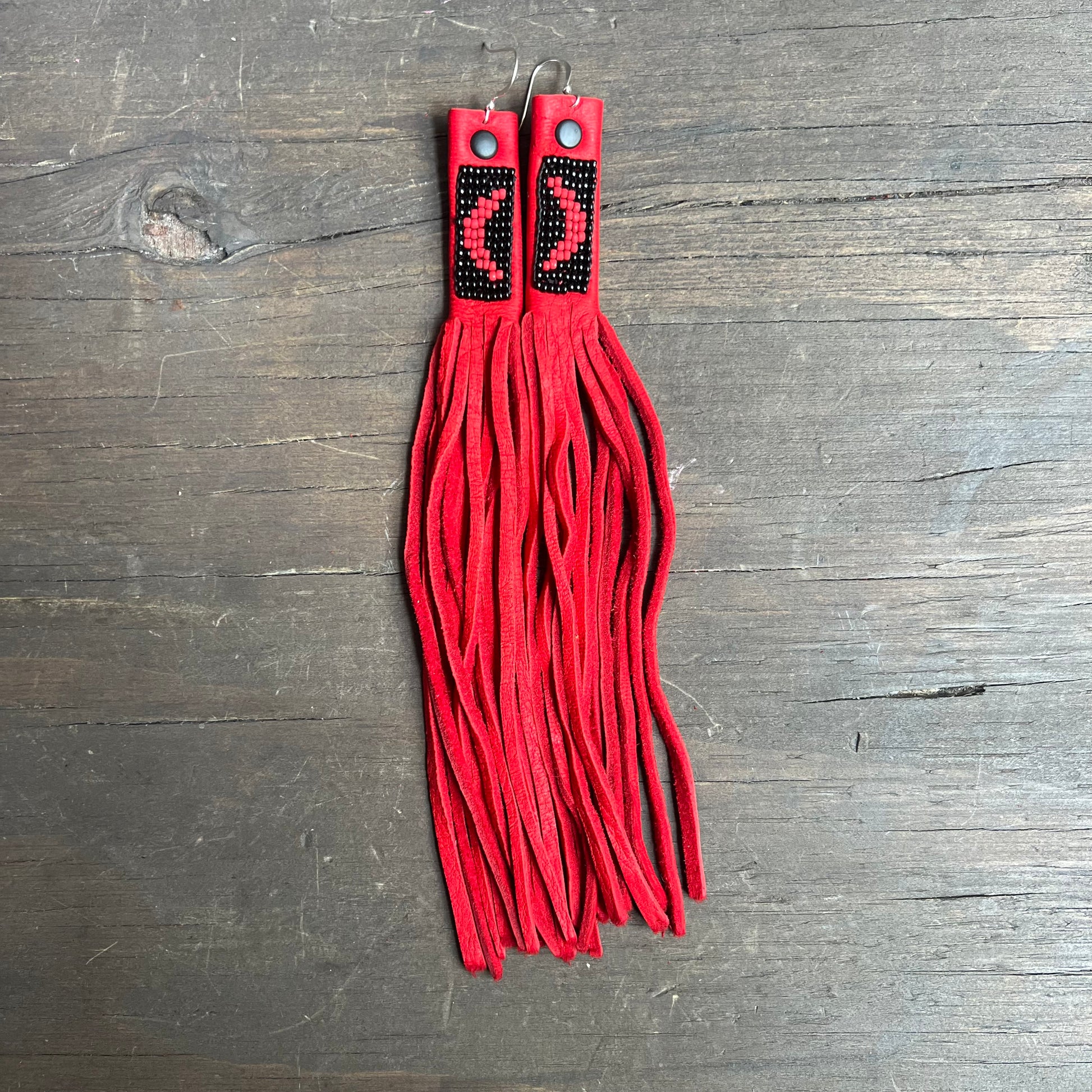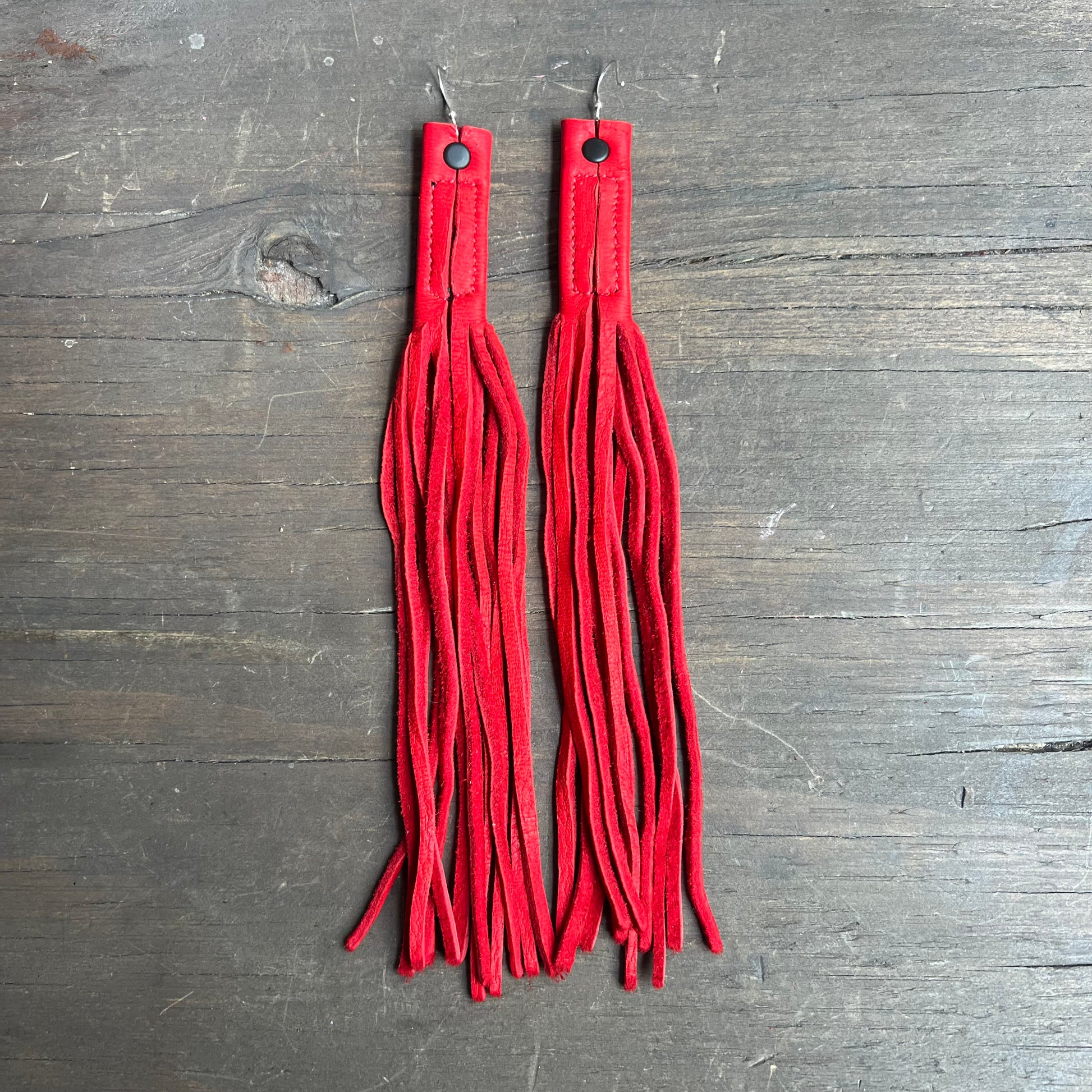 Gorgeous hand crafted earrings made by Magenta Reynolds from Leather Sage. She hunts and processes the leather in the Rocky Mountains, and meticulously crafts each item. The earrings hooks are made from sterling silver. Earring tassels are 7” long.